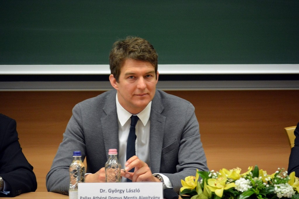 Dr. György László, a Pallas Athéné Domus Mentis Alapítvány igazgatója az Amerikai Egyesült Államok jelenlegi geopolitikai és gazdaságpolitikai helyzetéről beszélt, valamint arról, hogy korunk innovációi miként járulhatnak hozzá az élet könnyebbé tételéhez. Több problémakör ismertetésével szemléltette az amerikai gazdaság stagnálásának okait. Kiemelte többek között a hatalom koncentrációt, a bankszektor által okozott társadalmi veszteséget, a szabadalmi védelmek miatt bekövetkező árnövekedés, az irreális vezérigazgatói fizetéseket, valamint a hiányszakmákban mesterségesen létrehozott, túlzottan magas fizetéseket.