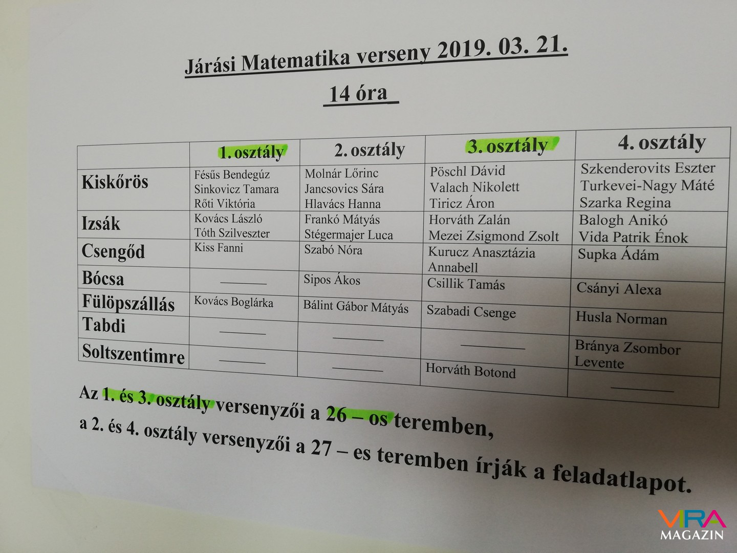 A KT Bem József Általános Iskola ebben a tanévben negyedik alkalommal rendezte meg matematika versenyét a Kiskőrös Járásban lévő általános iskolák alsó tagozatos tanulói részére. A résztvevőket Lasztovicza László köszöntötte, majd Kvacskáné Kiss Mária vezetésével megkezdődött a verseny.