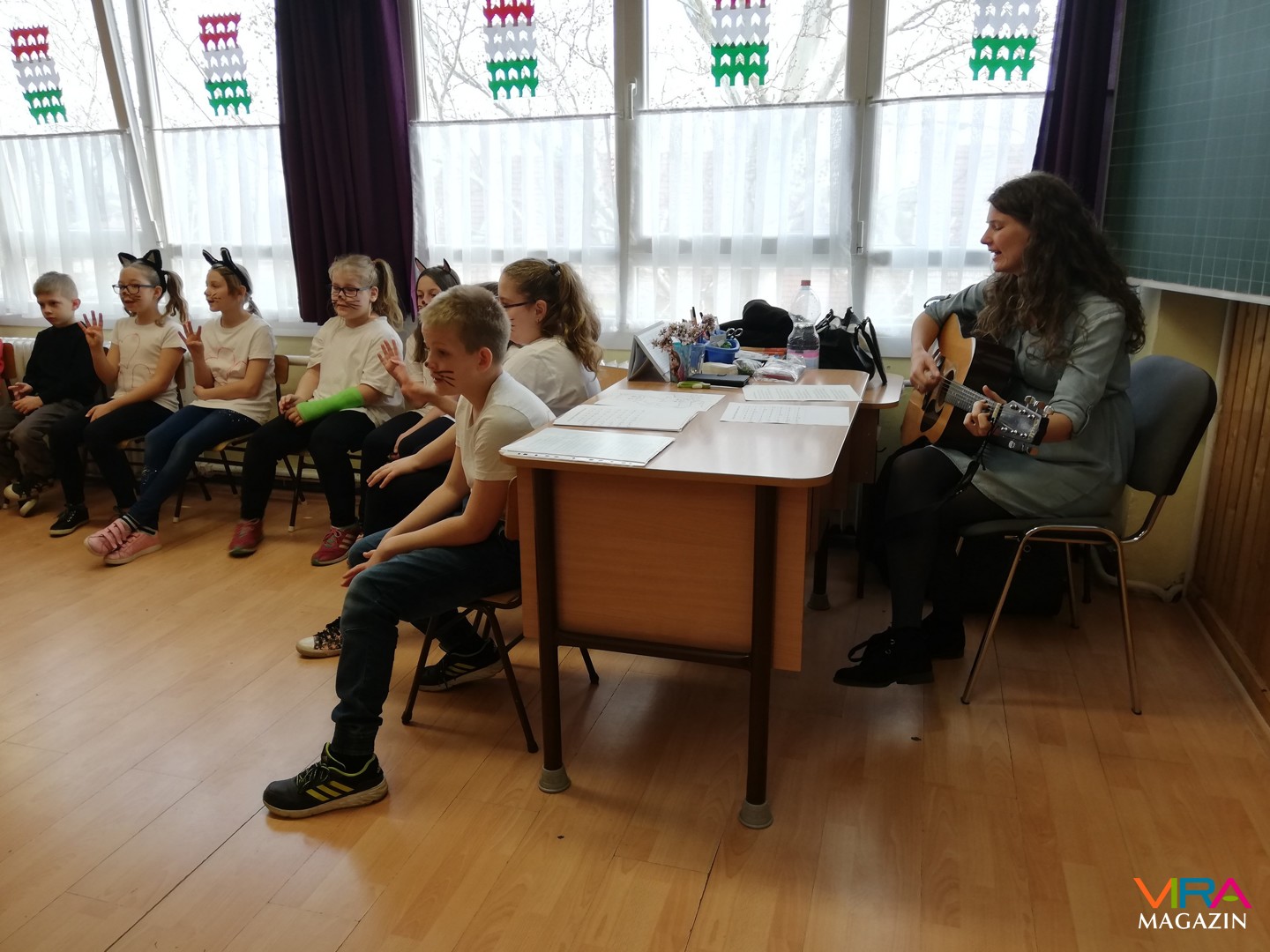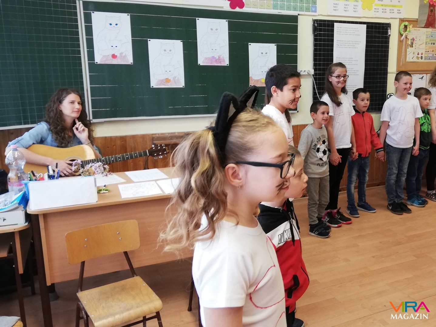 Maska Lászlóné egy kedves énekkel várta az óvodásokat, a Tíz kicsi kiscica dala köré építette fel programját, közösen táncoltak, színeztek és énekeltek.
