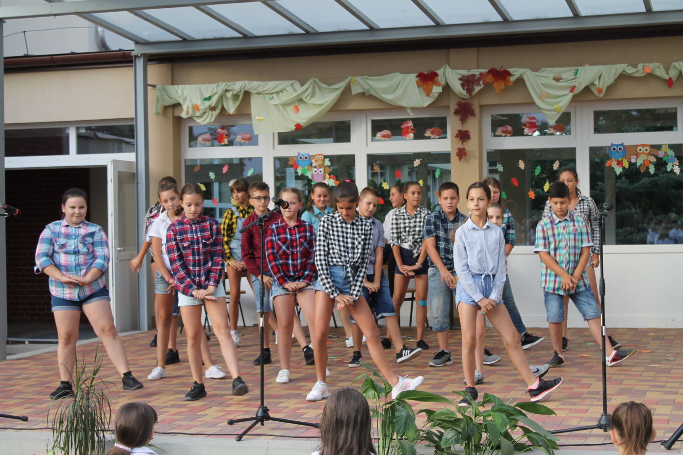 Az 5. évfolyam tanulóinak műsorával kezdődött az ünnep. A három osztályt Horváth A. Gézáné, Szigetiné Szabó Ilona és Kecskés Lilla készítette fel. A kockás ingbe öltözött fiatalok őszi levelek hullását felidézve jelentek meg a színpadon a jelképes csengő hangjára. A vakációs emlékeket soroló versek után egy híres jelenetet tekinthettek meg a vendégek a Légy jó mindhalálig című musicalből.