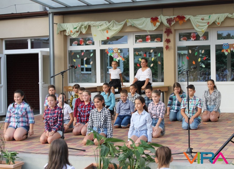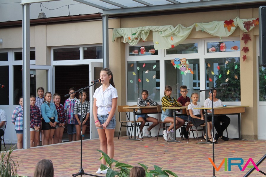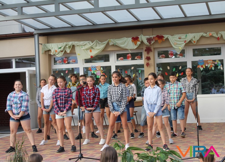 Az 5. évfolyam tanulóinak műsorával kezdődött az ünnep. A három osztályt Horváth A. Gézáné, Szigetiné Szabó Ilona és Kecskés Lilla készítette fel. A kockás ingbe öltözött fiatalok őszi levelek hullását felidézve jelentek meg a színpadon a jelképes csengő hangjára. A vakációs emlékeket soroló versek után egy híres jelenetet tekinthettek meg a vendégek a Légy jó mindhalálig című musicalből.