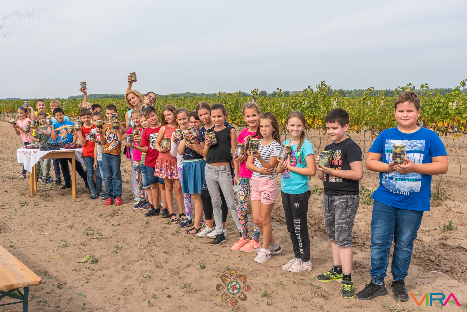 Ezek a tőkék pedig meghálálták a törődést. Csodálatos, zamatos fürtöket neveltek, melyek nagyobb része már a boltok polcairól kacsint a vásárlókra, de maradt a gyerekeknek is feladat. Amit leszedtek, azt bogyónként üvegekbe rakhatták, és hazavihették. Közben persze annyit ehettek, ami csak belefért a pocakjukba.