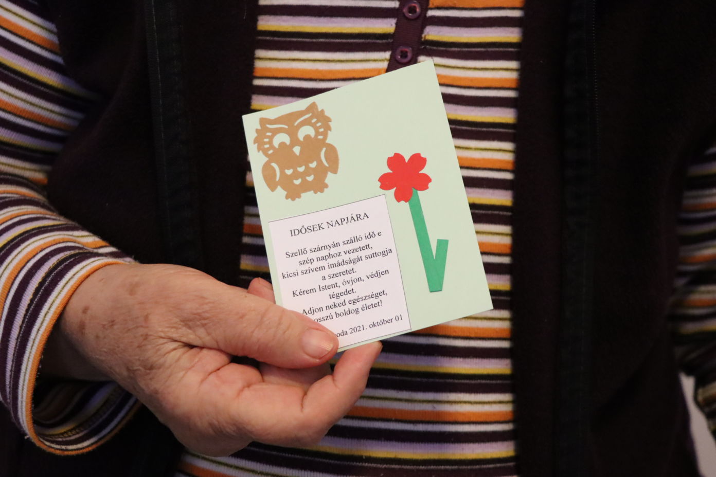 – Tamás Szilviának, a Kiskőrösi Óvodák Erdőtelki Tagóvodájának vezetője kért meg engem, hogy a gyerekek által elkészített apró üdvözlőkártyákat segítsek eljuttatni az időseknek. Mi pedig arra gondoltunk, hogy az intézményen belül akkor a saját idősotthonunkba hoznánk el ezeket az üdvözlőkártyákat, melyeket a Virág csoport óvodásai készítettek az időseknek – nyilatkozta Bozó-Kutyifa Eszter óvodai, iskolai, szociális segítő.