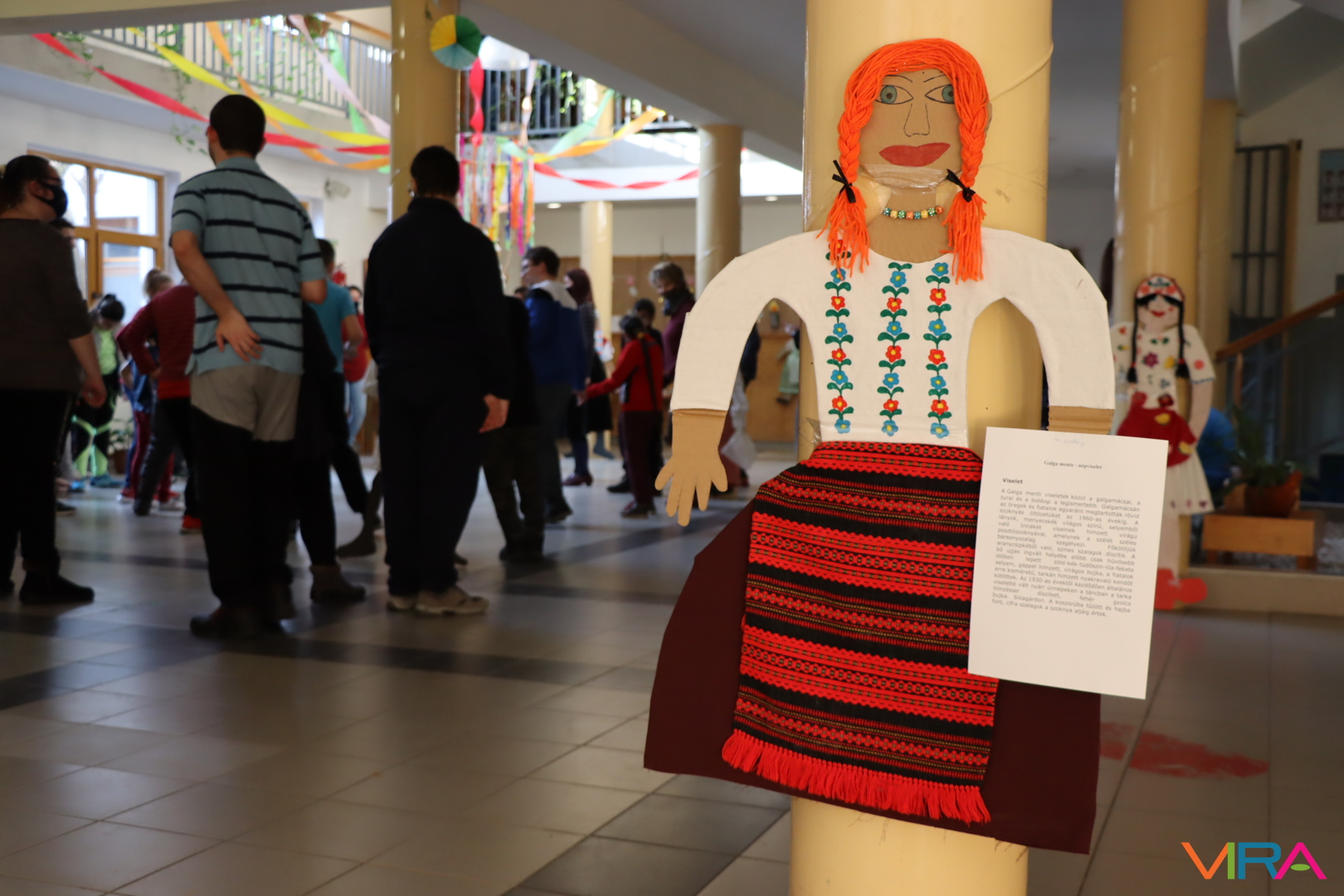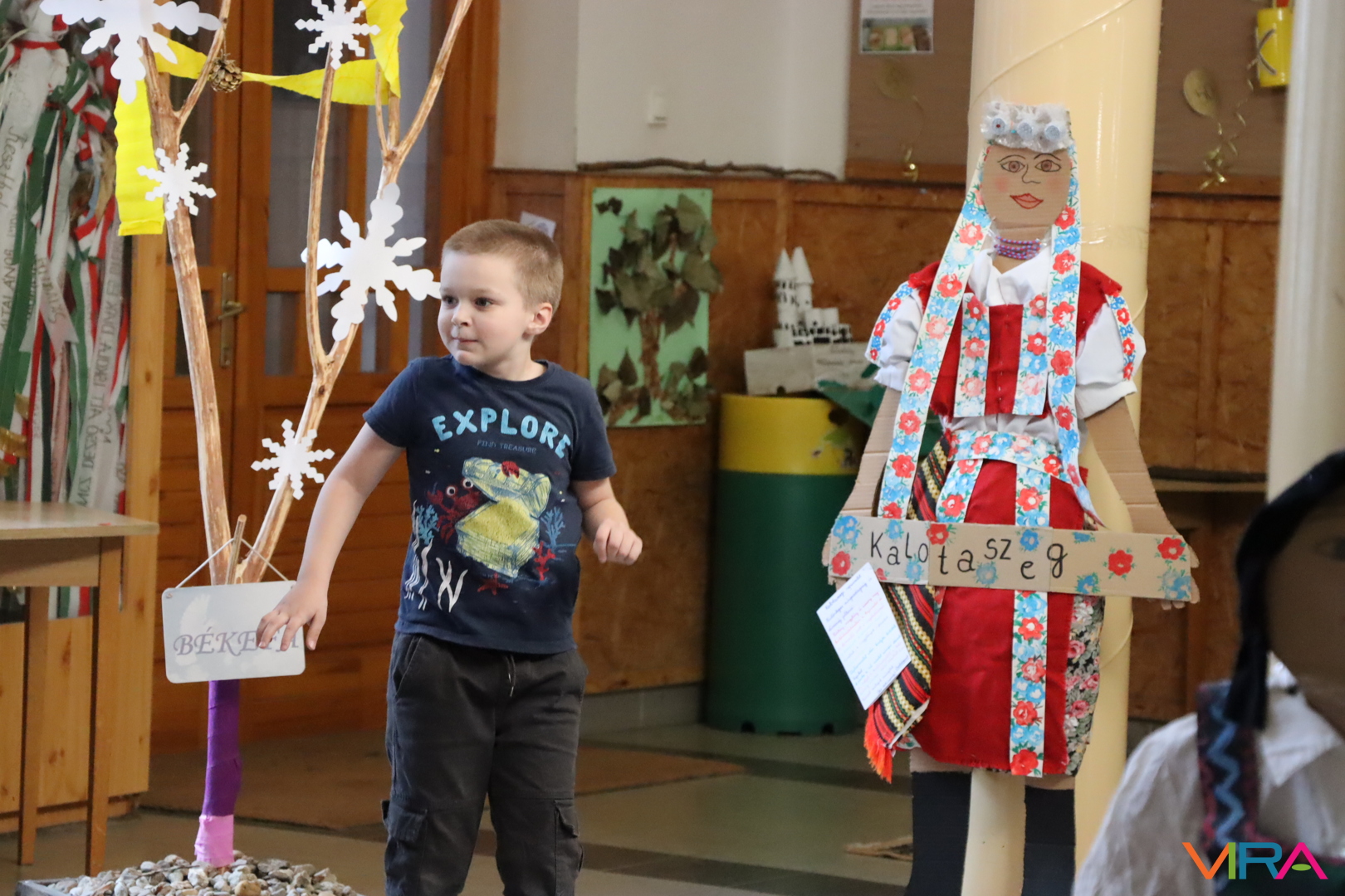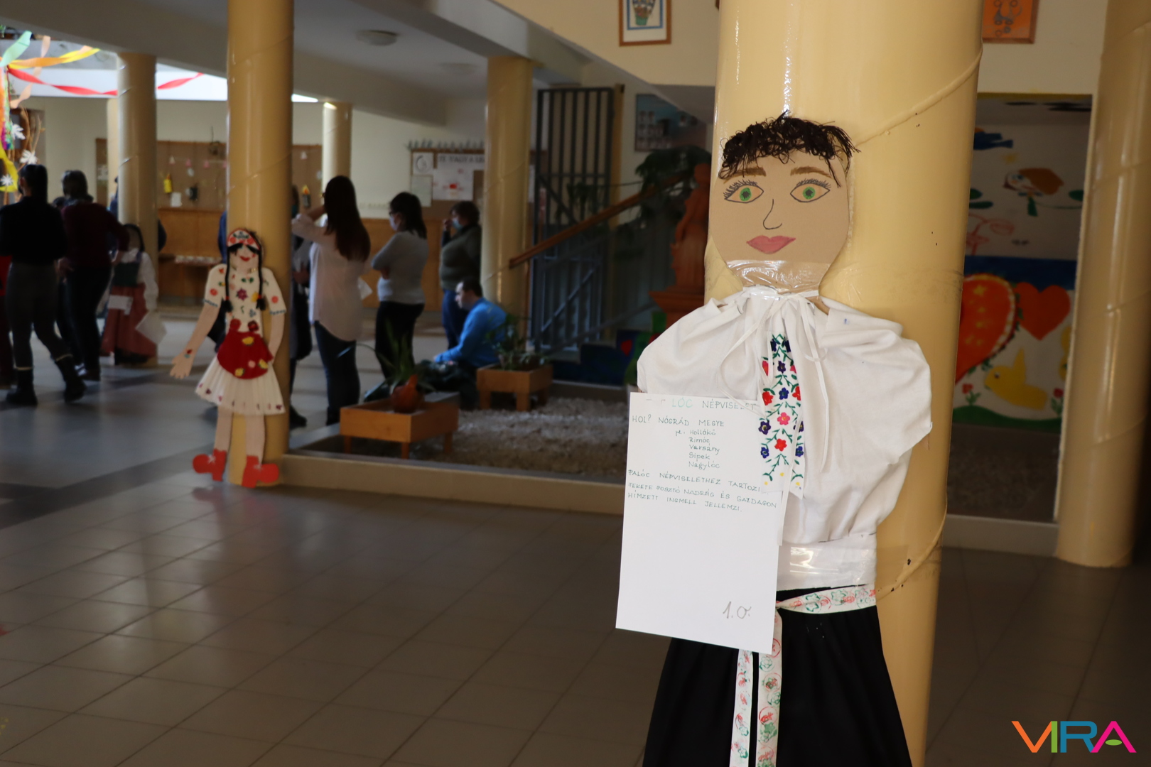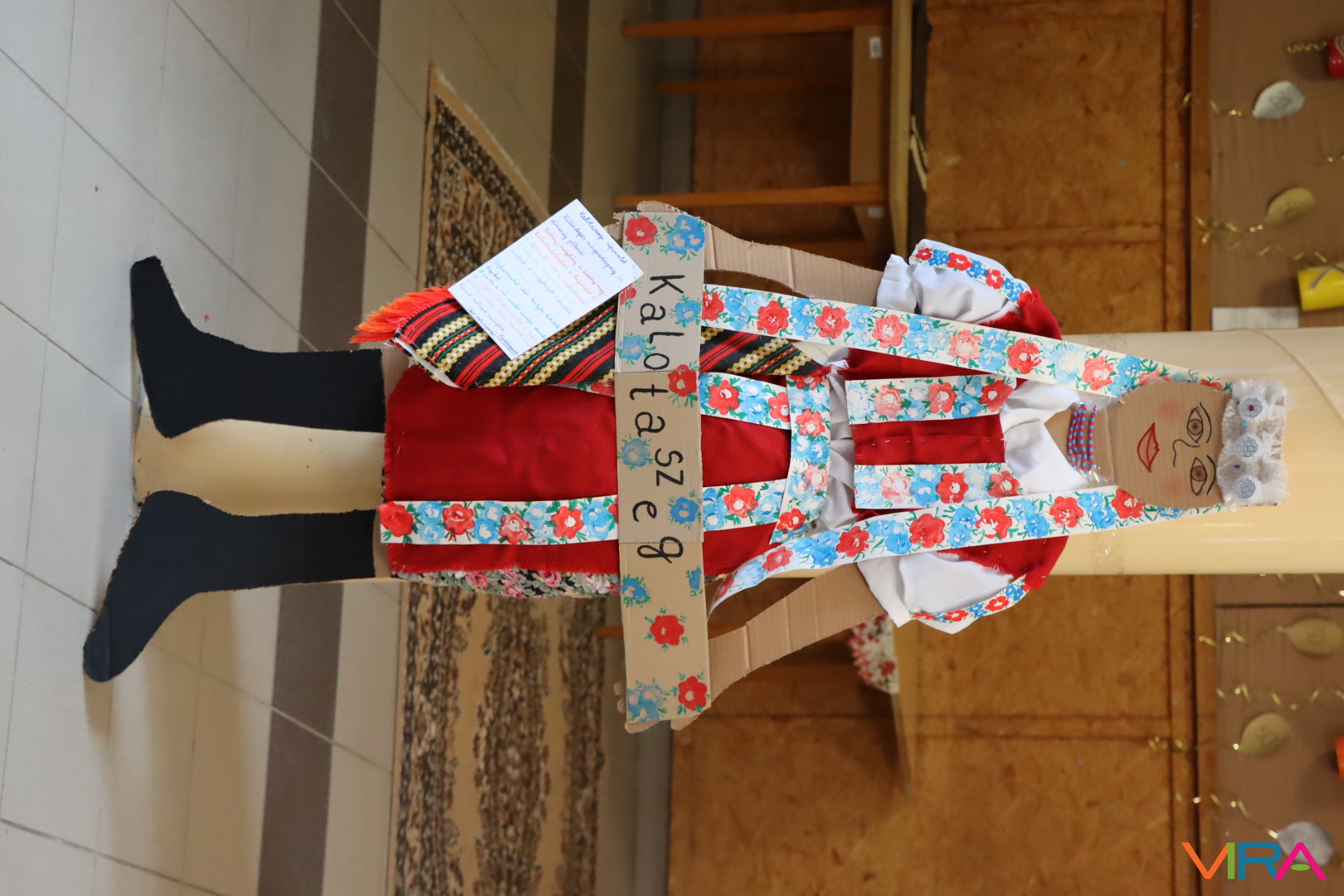 „A héten különböző programok valósultak meg a Kiskőrösi EGYMI-ben. Minden nap a második és a harmadik óra elején verseket, meséket mondtak a gyerekek az iskolarádión keresztül, amely nagyon nagy sikert aratott. Hétfőn örömzenélés valósult meg magyar népdalok éneklésével, egyszerű ritmushangszerekkel kísérve. Szünetekben autentikus magyar népzenét hallgathattak tanulóink. Feladatul kapták az osztályok/csoportok, hogy magyar tájegységekhez kapcsolódó, arra jellemző népviseletbe öltöztetett babát konstruáljanak újrahasznosítható anyagokból. Tehát olyan kiegészítőket, ruhákat kellett készíteniük, vagy gyűjteniük, melyeket nem újonnan vásárolnak. Az osztályoknak komoly kutatómunkát kellett végezniük, hiszen az adott népviselet mellé pontos leírást is kellett mellékelni. Az elkészült alkotásokat az aulában állítottuk ki először, majd úgy döntöttünk, hogy a folyosón található oszlopokhoz rögzítjük azokat, hogy mindenki jól láthassa. Roma, lóc (fiú-lány), kalotaszegi, kalocsai, szlovák, sváb, hortobágyi (fiú-lány), galgamenti, sárközi, marosszéki, hollókői viseletben pompáznak a bábuk. Nagyon szeretnénk, ha ebből a programból hagyomány lenne, hiszen azt látjuk, hogy a gyerekek tetszését is elnyerte.