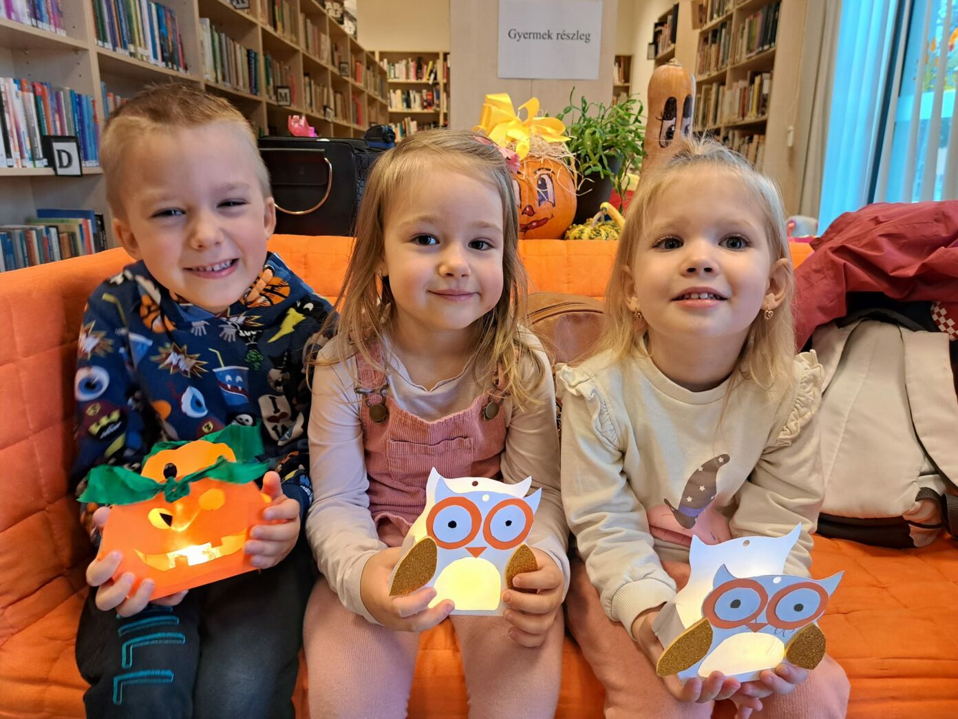 A délelőtt során az őszi kézműves foglalkozáson volt a hangsúly, ahol csoda szép mécsesek születtek. A gyerekek Kullai Sarolta könyvtáros segítségével készítették el saját kis lámpásaikat.