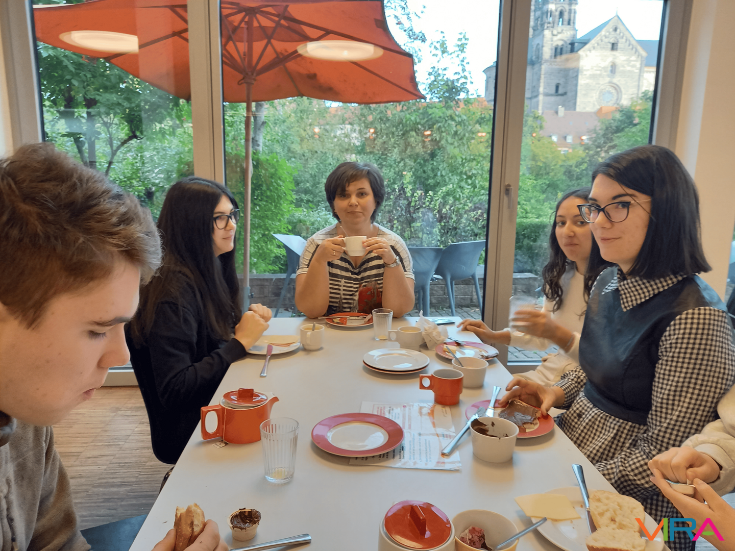 Hat tanuló: Cséplő Gréta, Hajma Bálint, Hajma Zsombor, Papp Emma, Papp Zsuzsa, Szabó Annabella és két kísérő: Hajmáné Farkas Éva és Katzenbachné Csengődi Edit utazott el szeptember 28-án egy hétre Bambergbe. Csapatunk hosszú és kalandos vonatút után érkezett meg a „Frank Rómába”, ahol a cseh és lengyel delegációk, az aacheni csoport és a házigazda bambergi csapat már várt bennünket. Így összesen 70 fő töltött el együtt egy csodálatos hetet. Ez idő alatt megismerkedtünk a várossal egyéni és csoportos túrák során, valamint ellátogattunk néhány szomszédos településre is. Münchenben bejuthattunk a bajor parlamentbe, de a hét csúcspontja a Bayern München székhelye, az Allianz Arena meglátogatása volt. Természeti programjaink közül a pottensteini cseppkőbarlang, a Teufelshöhle varázsolt el bennünket. Mély nyomot hagyott a csoport tagjaiban Mödlareuth település is. A kis falu a történelem során mindig is Bajorország és Türingia határán feküdt, ez azonban Németország két részre osztásakor vált igazán tragikussá: a települést fallal és szögesdróttal választották ketté, nem törődve a családi, rokoni kapcsolatok szétszakításával. Megrendítő volt látni a mementóként magasodó, fehérre meszelt falat, a megfigyelőtornyokat, a szögesdrótot.