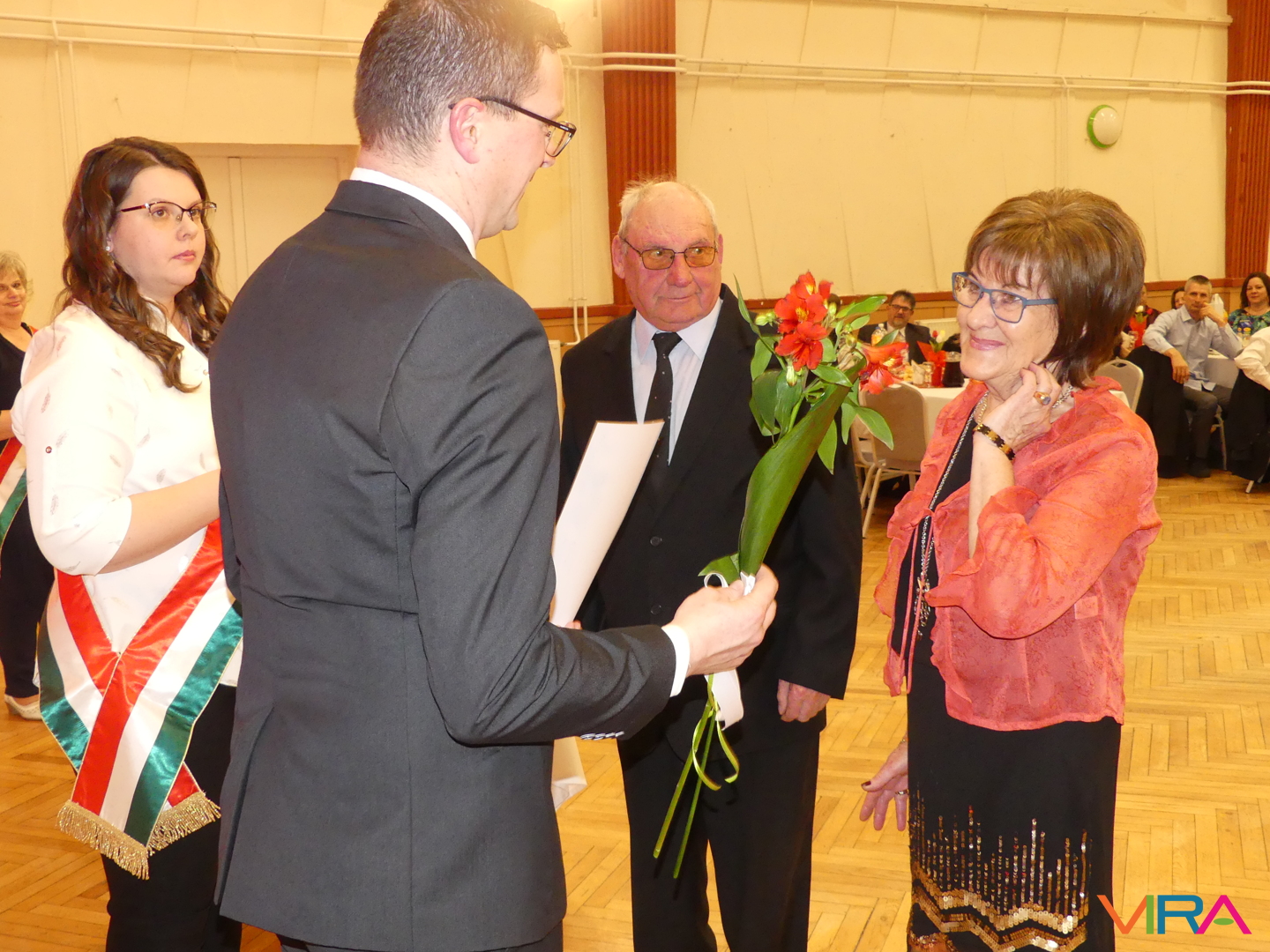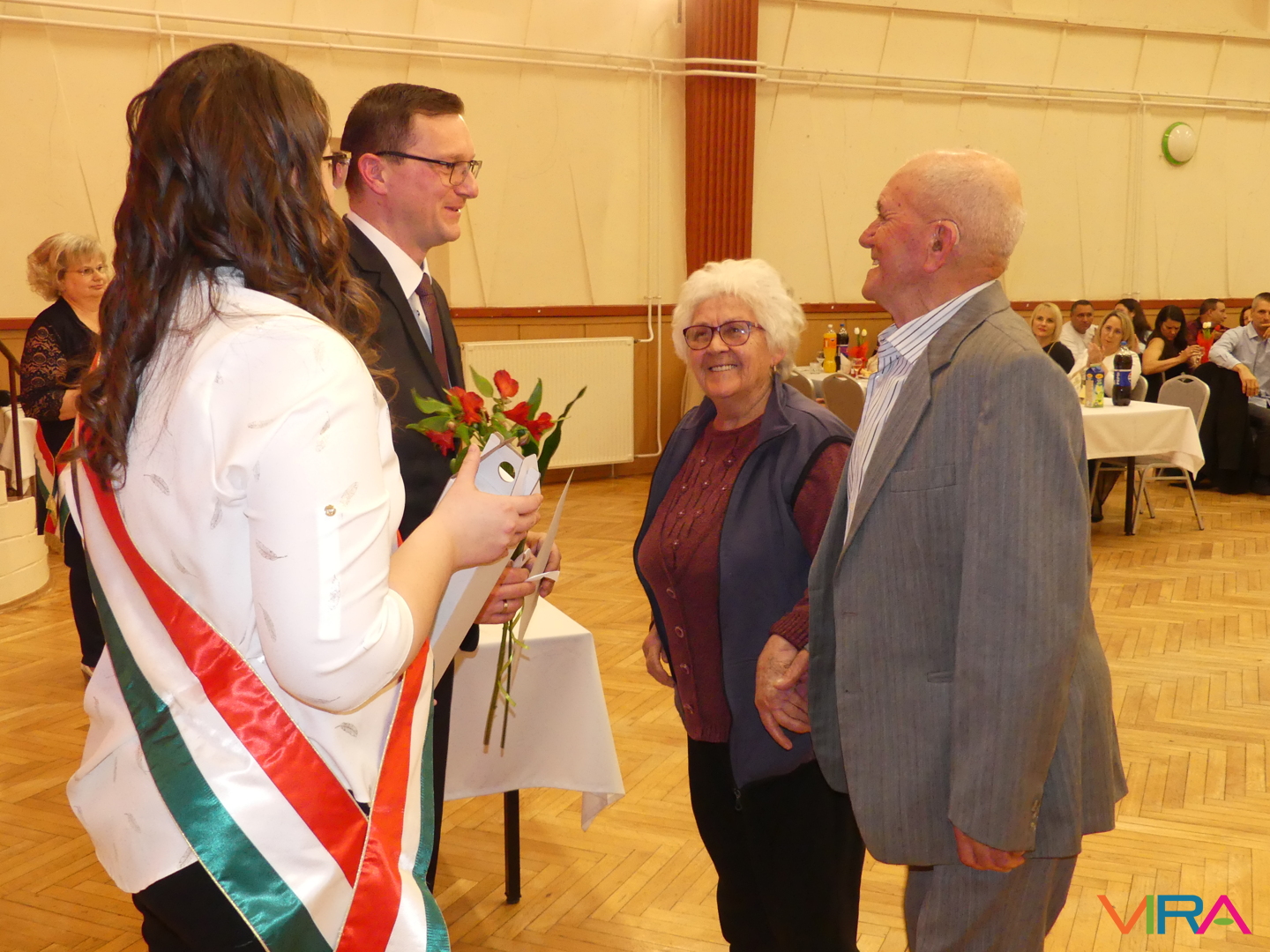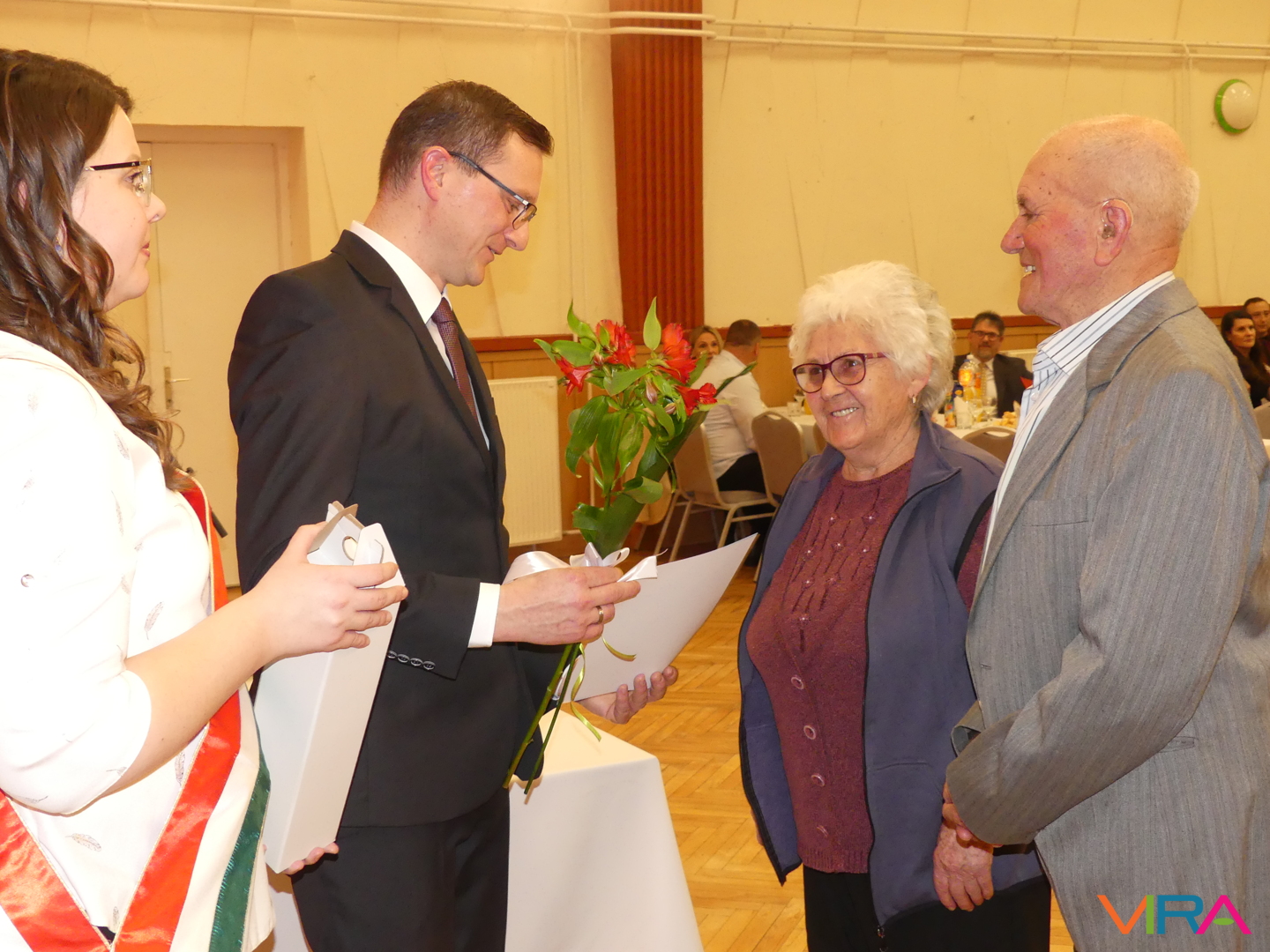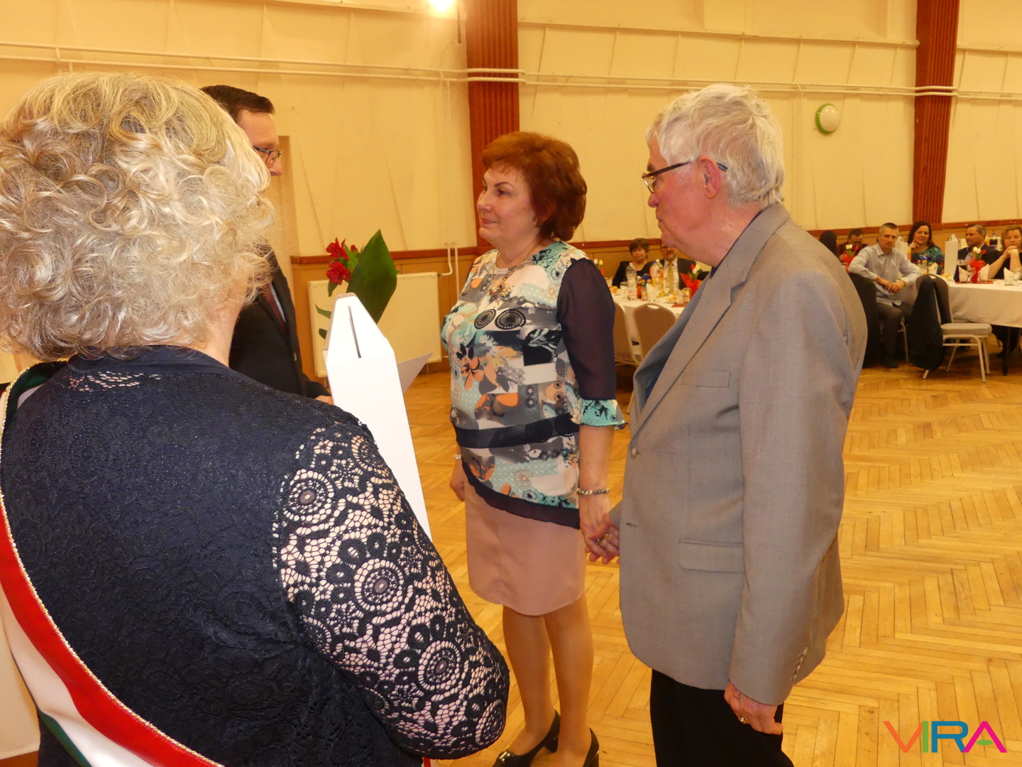 A húszévnyi házasság a porcelánhoz hasonlóan különleges, de törékeny, a huszonöt fényes és időtálló, mint az ezüst, a harmincadik a gyöngysorhoz hasonló füzér, mely szeretetből, türelemből és megértésből formált, a harmincöt a korallhoz hasonló, a negyvenedik a rubin hű ragyogását tükrözi, a negyvenötödik a zafír bölcs kékjét, az ötvenedik az arany fényességét idézi. Az ötvenöt éve házasok az állandóság és a remény smaragdszínében pompáznak, a gyémánt mint a legcsillogóbb és legerősebb drágakő a hatvanadik házassági évfordulóját ünneplő párok jelképe. Az ünnepeltek meghatottan fogadták a jelképes ajándékokat: a feleségek egy-egy szál virágot, a férjek egy-egy üveg csengődi bort. A jubiláló párok díszoklevelén Johann Wolfgang von Goethe gondolatai olvashatók: