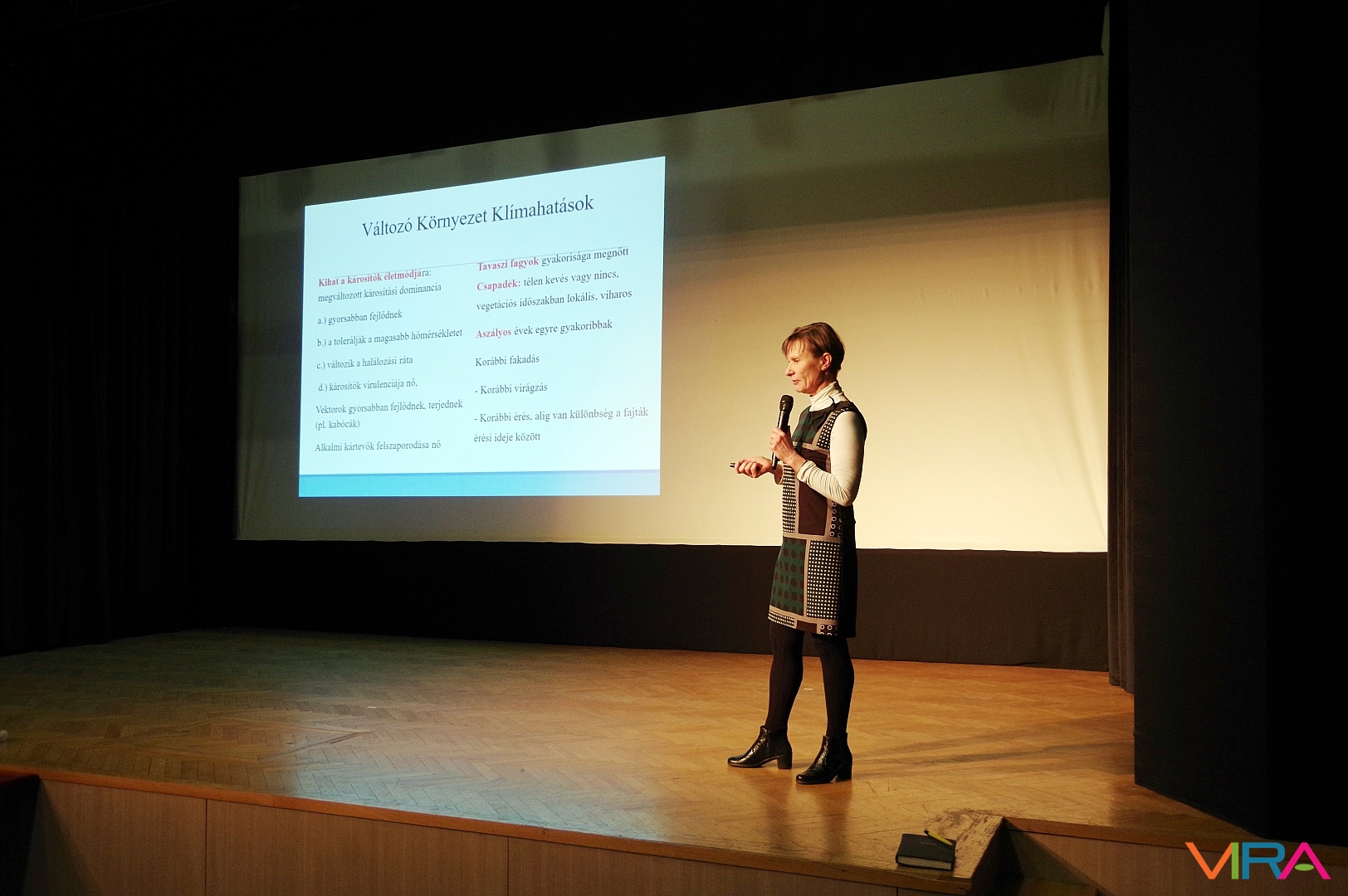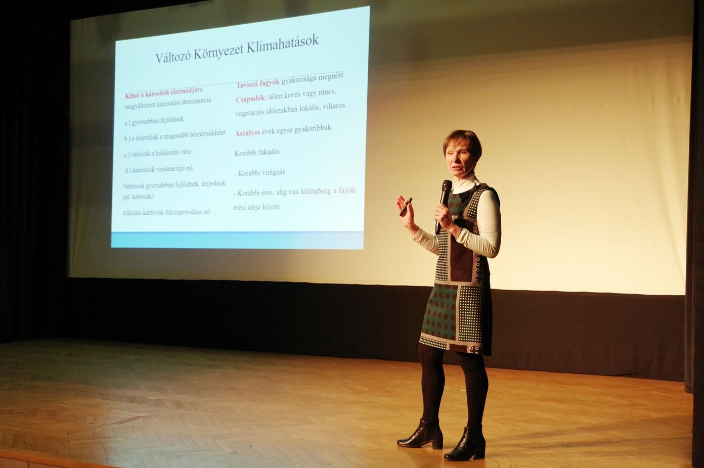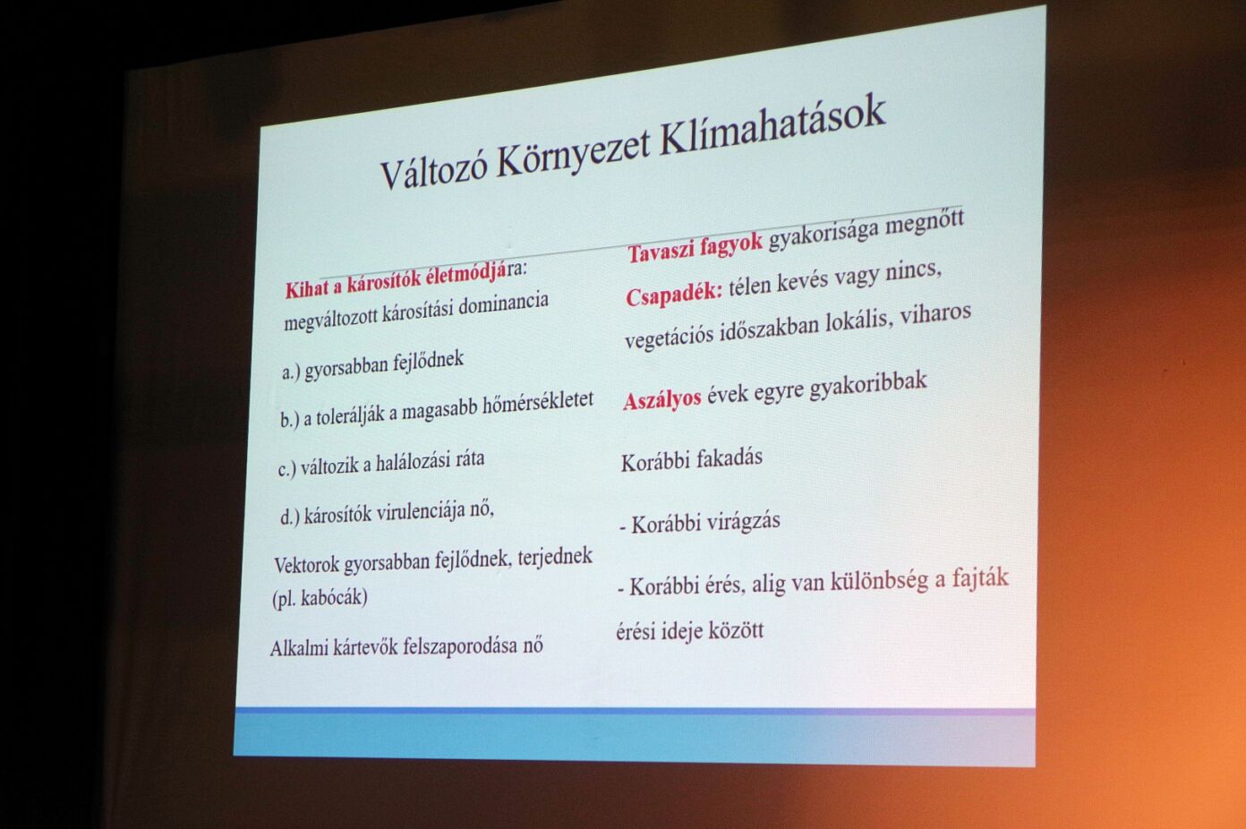 Az előadó kiemelte, hogy a változó környezet és a klímahatások teljesen új kihívások elé állítják a termelőket. A megváltozott időjárási viszonyok (melegebb éves átlaghőmérséklet, enyhe telek, nyári hőség, aszály) kihatnak a károsítók életmódjára, mivel ezek miatt megváltozott károsítási dominanciával kell számolni. A kártevők a melegebb időjárás miatt gyorsabban fejlődnek, tolerálják a magasabb hőmérsékletet, változik a halálozási ráta, a károsítók virulenciája nő, a vektorok gyorsabban fejlődnek, terjednek (pl. kabócák), az alkalmi kártevők felszaporodása nő.