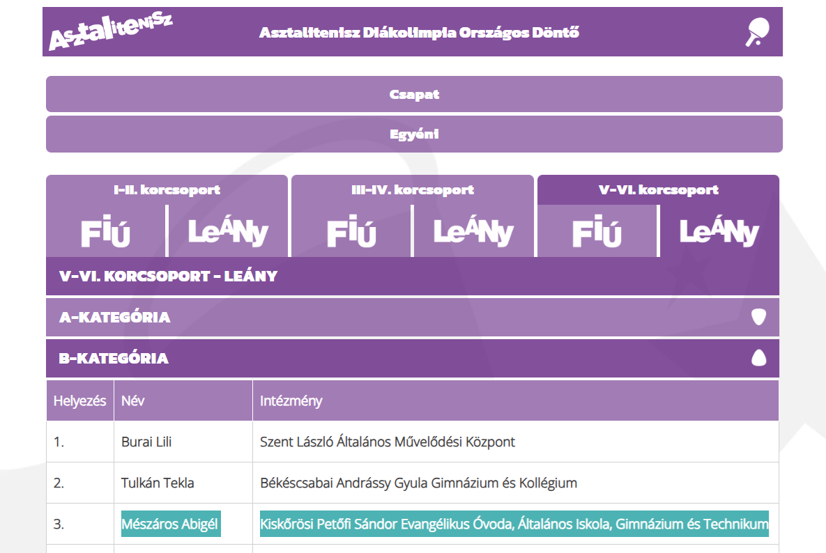 Asztalitenisz részletes egyéni és csapateredmények: https://doeredmenyek.hu/asztalitenisz