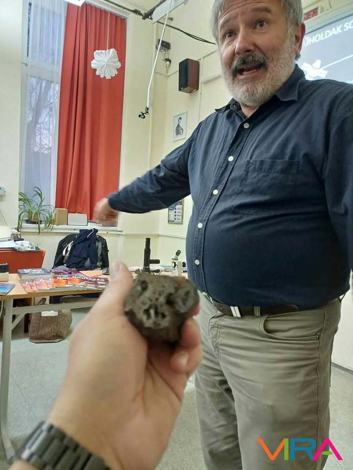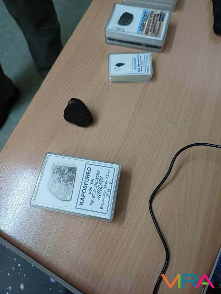 A műholdak visszahulló darabjain kívül természetesen más is érkezik hozzánk a világűrből. Hozott magával meteordarabokat, melyeket megfoghattunk, megvizsgálhattunk. Rakéták és műholdak makettjeiből, valamint meteor-metszetekből egy minikiállítást is berendezett, melyet az előadás után lehetett megtekinteni.