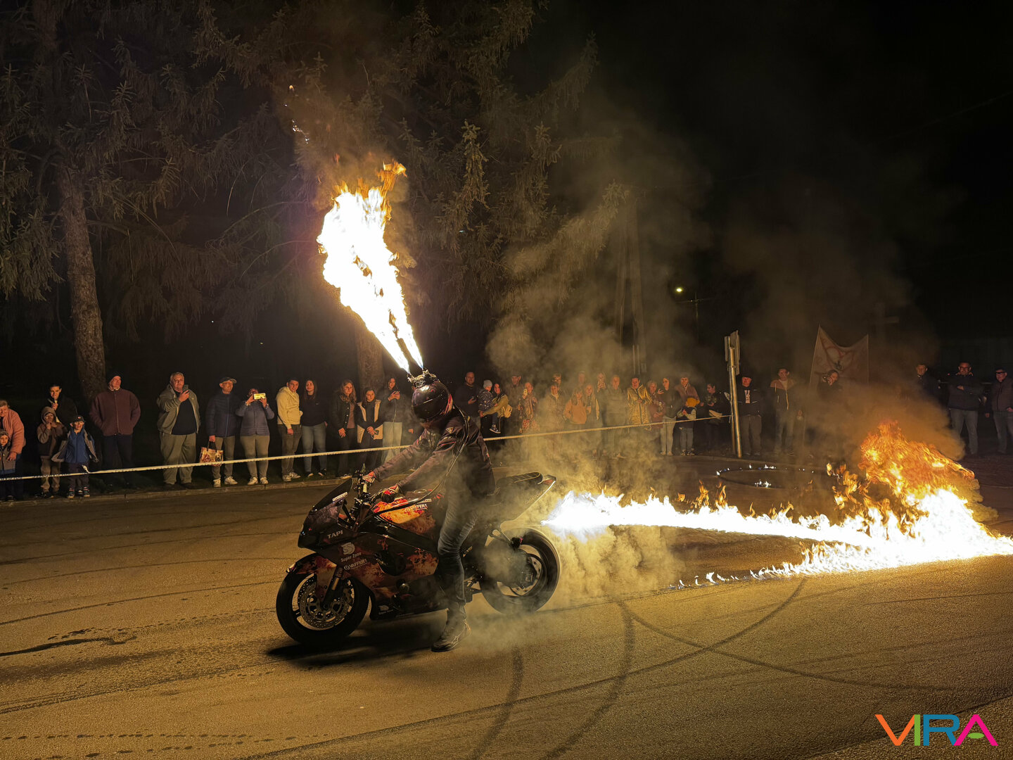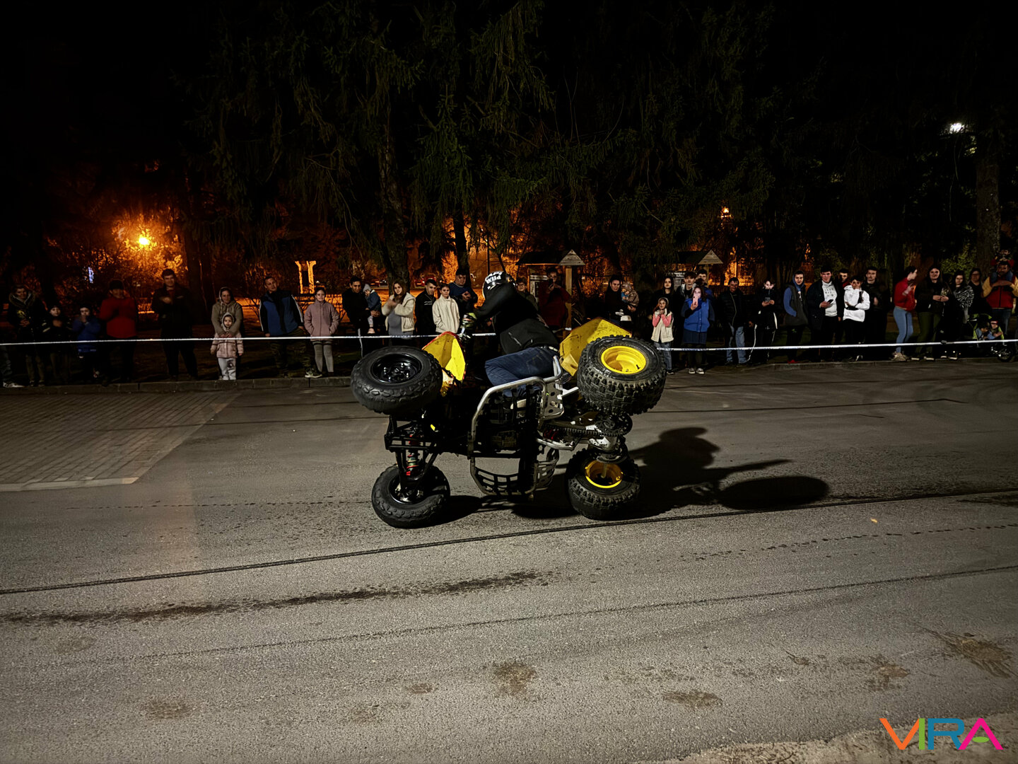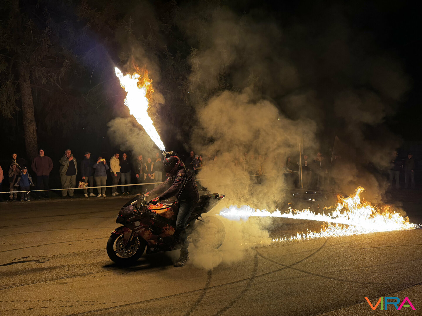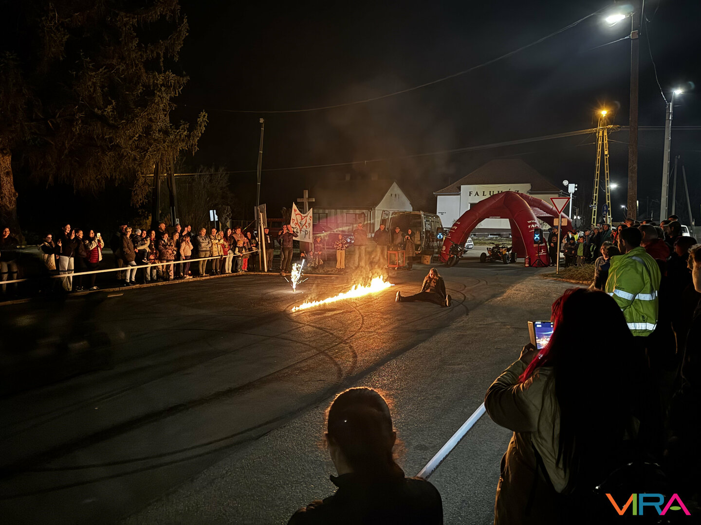 Az estét Petz János polgármester köszöntője nyitotta meg, majd felkonferálta Tápai Tamás előadását. A látványos produkciót megelőzően a szalmabáb elégetésére került sor a rendezvényterület udvarán, majd következett az est fénypontja. A Vasút utca zsivaját kipufogó durrogás törte meg, tüzes mutatványokkal színesítve azt. A kaszkadőr motoros és quados attrakciókkal ejtette ámulatba a nézőket, egy-egy lelkes érdeklődőt bevonva a trükkökhöz.