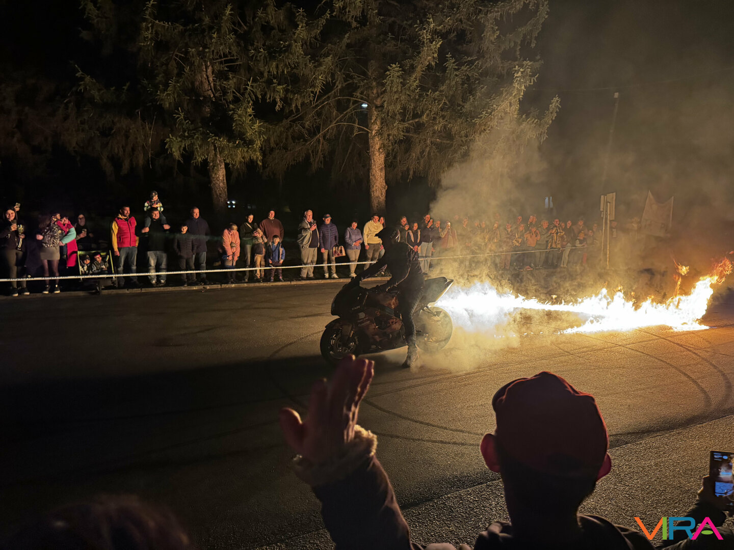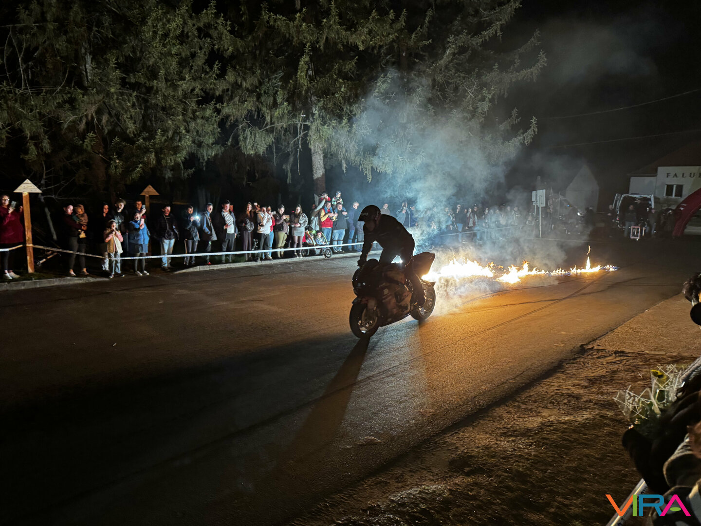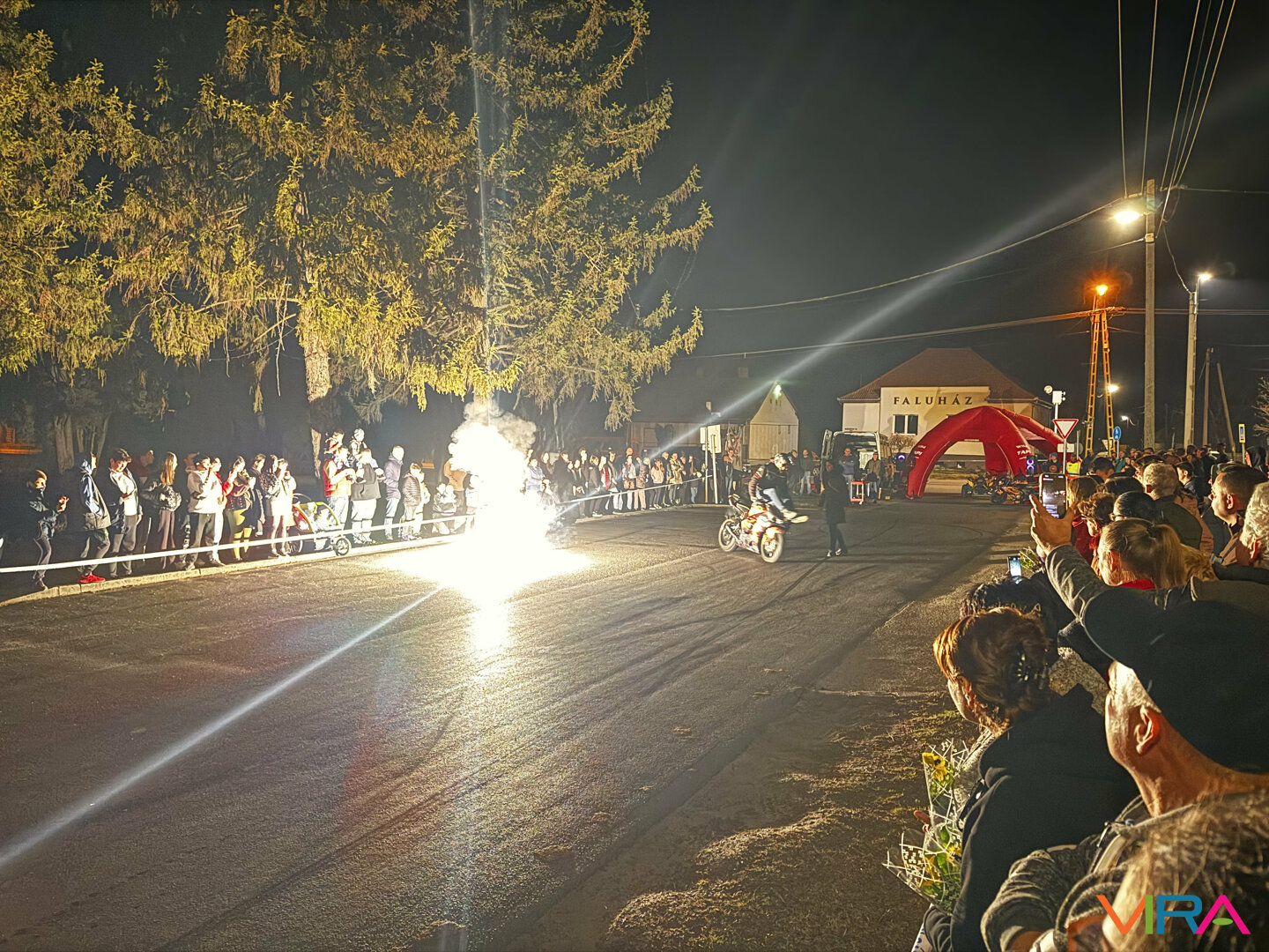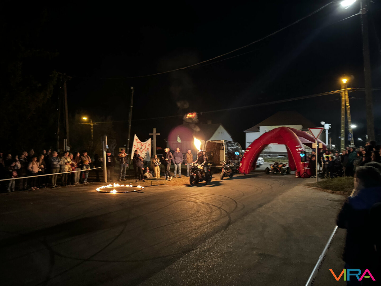 Az estét Petz János polgármester köszöntője nyitotta meg, majd felkonferálta Tápai Tamás előadását. A látványos produkciót megelőzően a szalmabáb elégetésére került sor a rendezvényterület udvarán, majd következett az est fénypontja. A Vasút utca zsivaját kipufogó durrogás törte meg, tüzes mutatványokkal színesítve azt. A kaszkadőr motoros és quados attrakciókkal ejtette ámulatba a nézőket, egy-egy lelkes érdeklődőt bevonva a trükkökhöz.