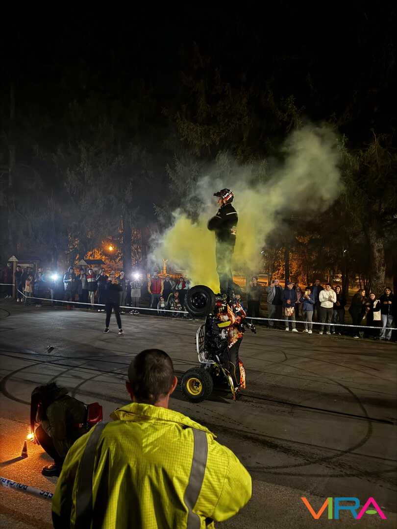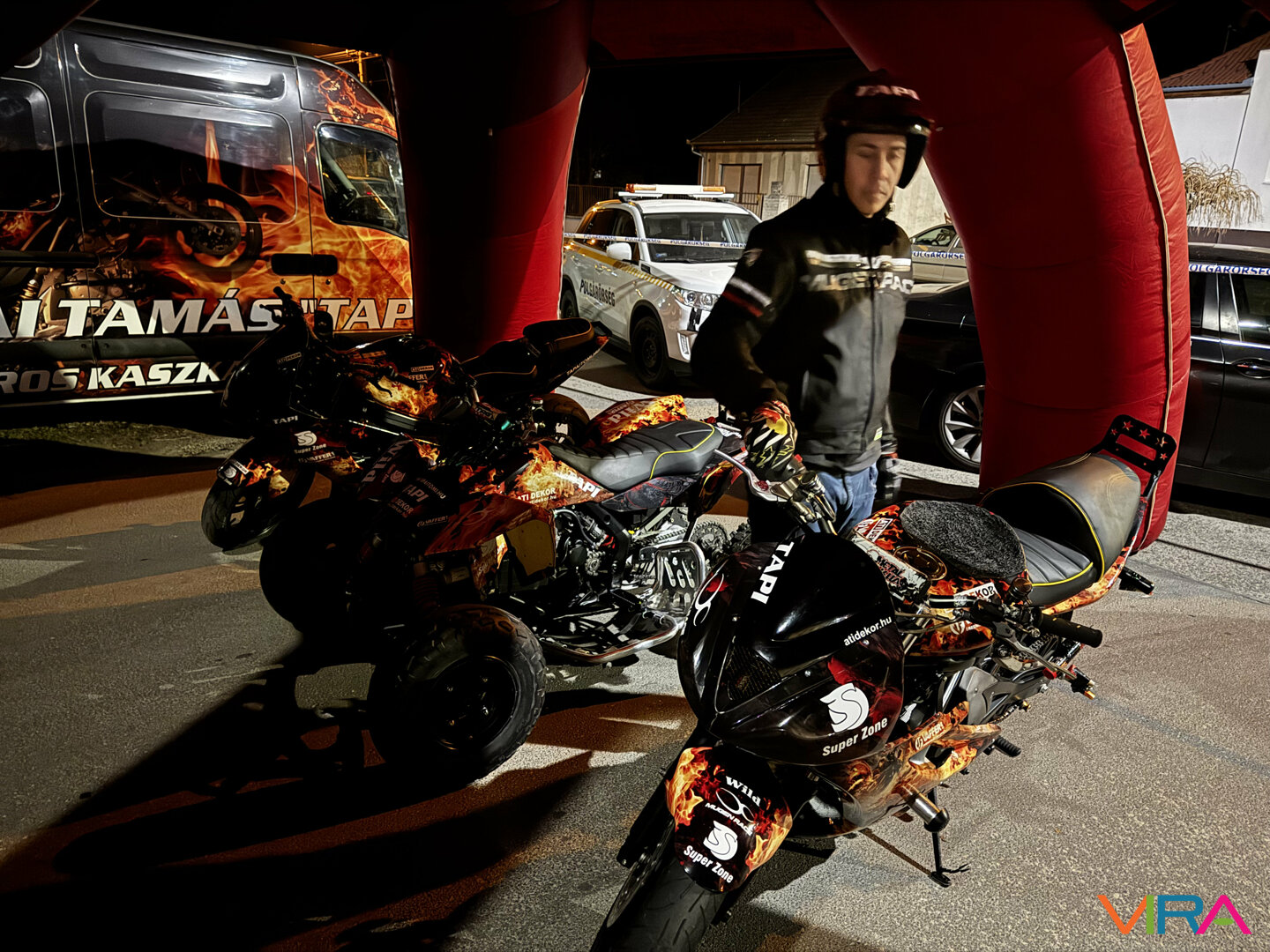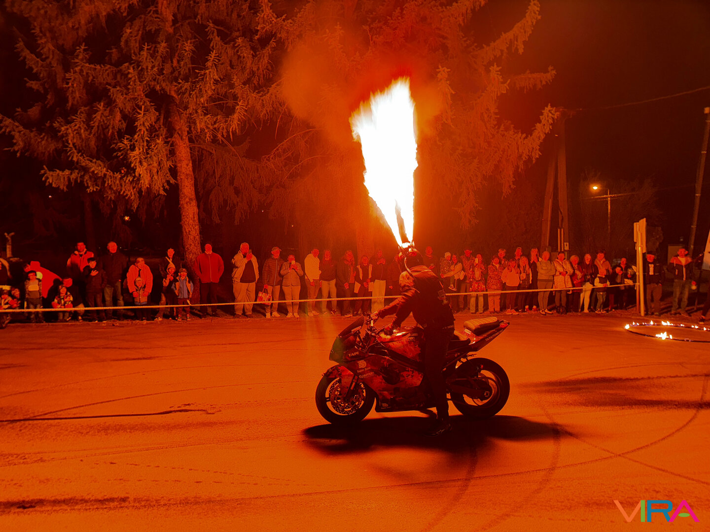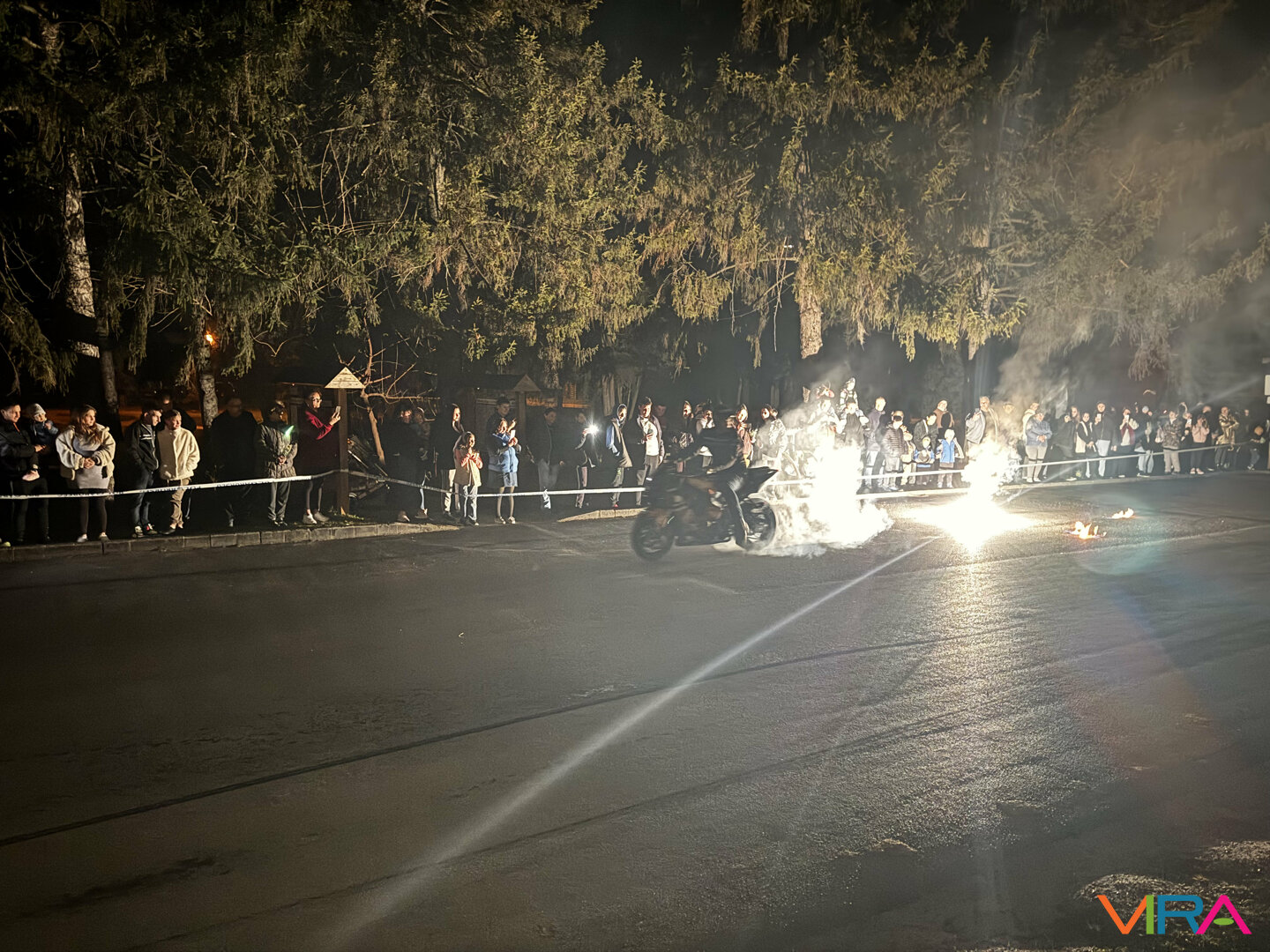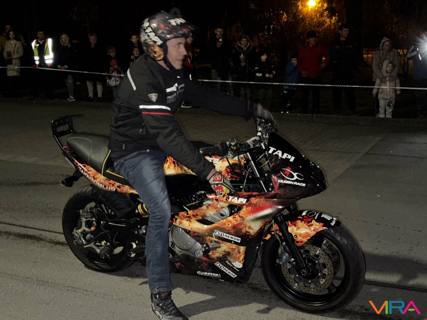 Az estét Petz János polgármester köszöntője nyitotta meg, majd felkonferálta Tápai Tamás előadását. A látványos produkciót megelőzően a szalmabáb elégetésére került sor a rendezvényterület udvarán, majd következett az est fénypontja. A Vasút utca zsivaját kipufogó durrogás törte meg, tüzes mutatványokkal színesítve azt. A kaszkadőr motoros és quados attrakciókkal ejtette ámulatba a nézőket, egy-egy lelkes érdeklődőt bevonva a trükkökhöz.