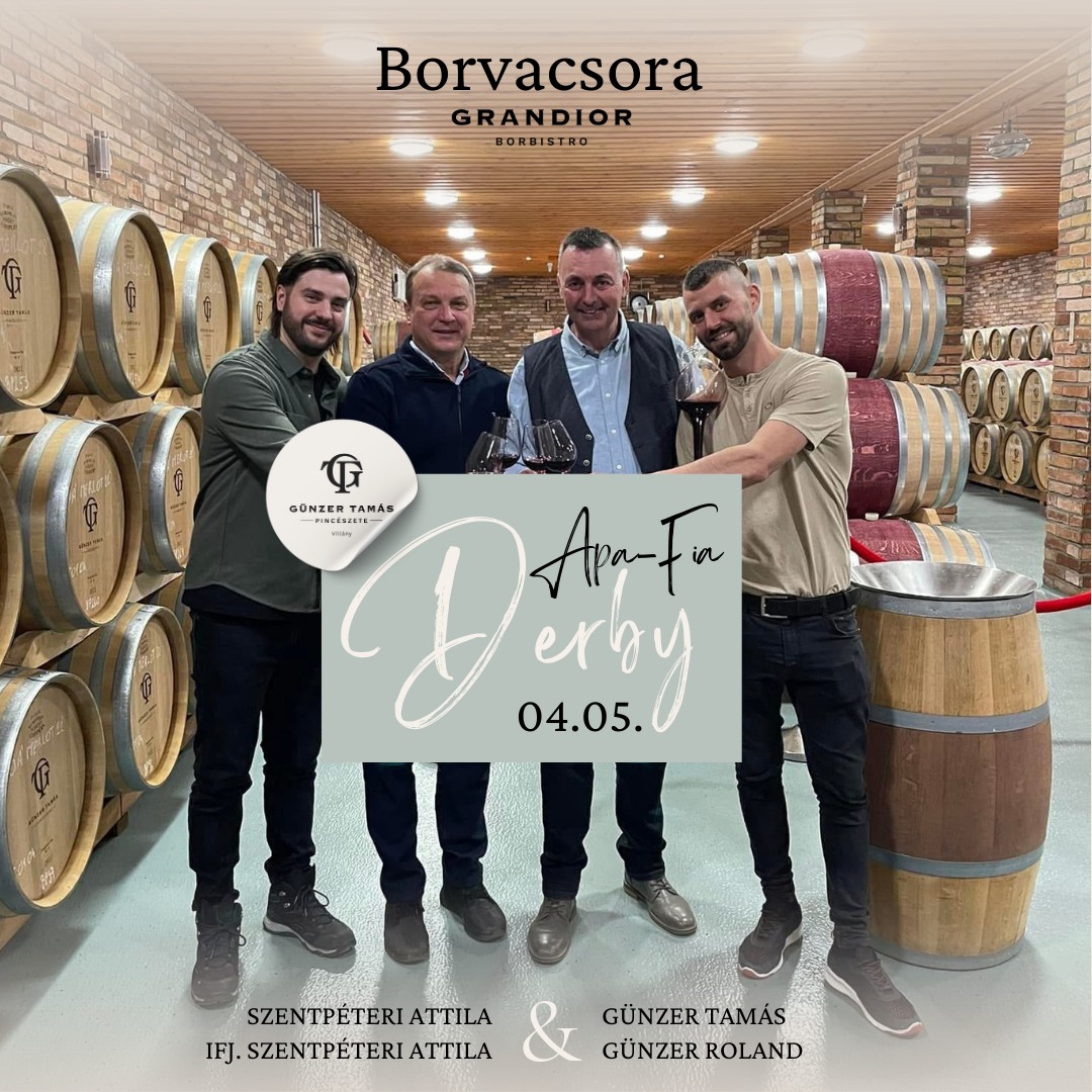 2025 április első hétvégéjén Villányban voltunk, ahol Günzer Tamástól és fiától, Rolandtól kaptunk meghívást egy közös Apa-Fia Derby Borkóstoló megtartására. Ez is egy sikeres, 10 tételes (+2 féle pezsgő) vacsorával egybekötött kóstoló volt, pincelátogatással. Elmondhatom, hogy egy nagyon jó szakmai és baráti kapcsolat alakult ki köztünk, már többször tartottunk Budapesten, Villányban és Kiskőrösön is közös kóstolókat.
