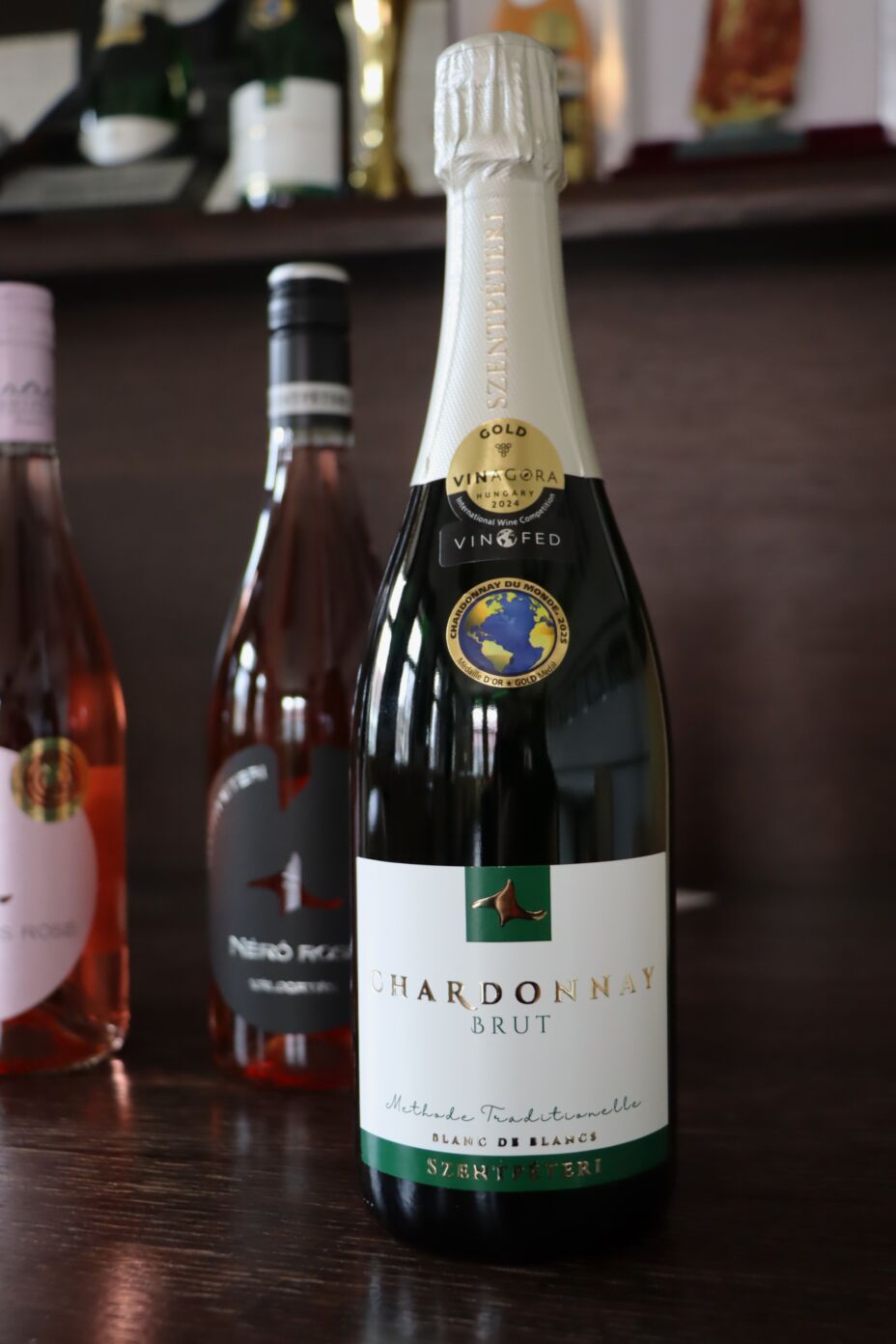 Ezután szintén Franciaországban a nemzetközi Chardonnay du Monde versenyen, ami a Chardonnay világbajnokságnak számít, 34 országból összesen 518 mintát bíráltak a szakavatottak ebben az évben. Itt csak chardonnay borokat bírálnak a világ minden tájáról, ami szintén egy nagyon szigorú verseny. Magyarországról összesen három érem született. Egy ezüst, és két arany, köztük a miénk. A Tradicionális Chardonnay 2022-es Brut pezsgőnk Aranyérmes lett, és bekerült a TOP10 legjobb Chardonnay közé két dél-afrikai, két spanyol, egy japán, egy svájci, és több francia mellett. Hatalmas elismerés a számunkra, hogy a mi kiskőrösi magyar Chardonnay pezsgőnk oda tudott kerülni a világ élvonalába.