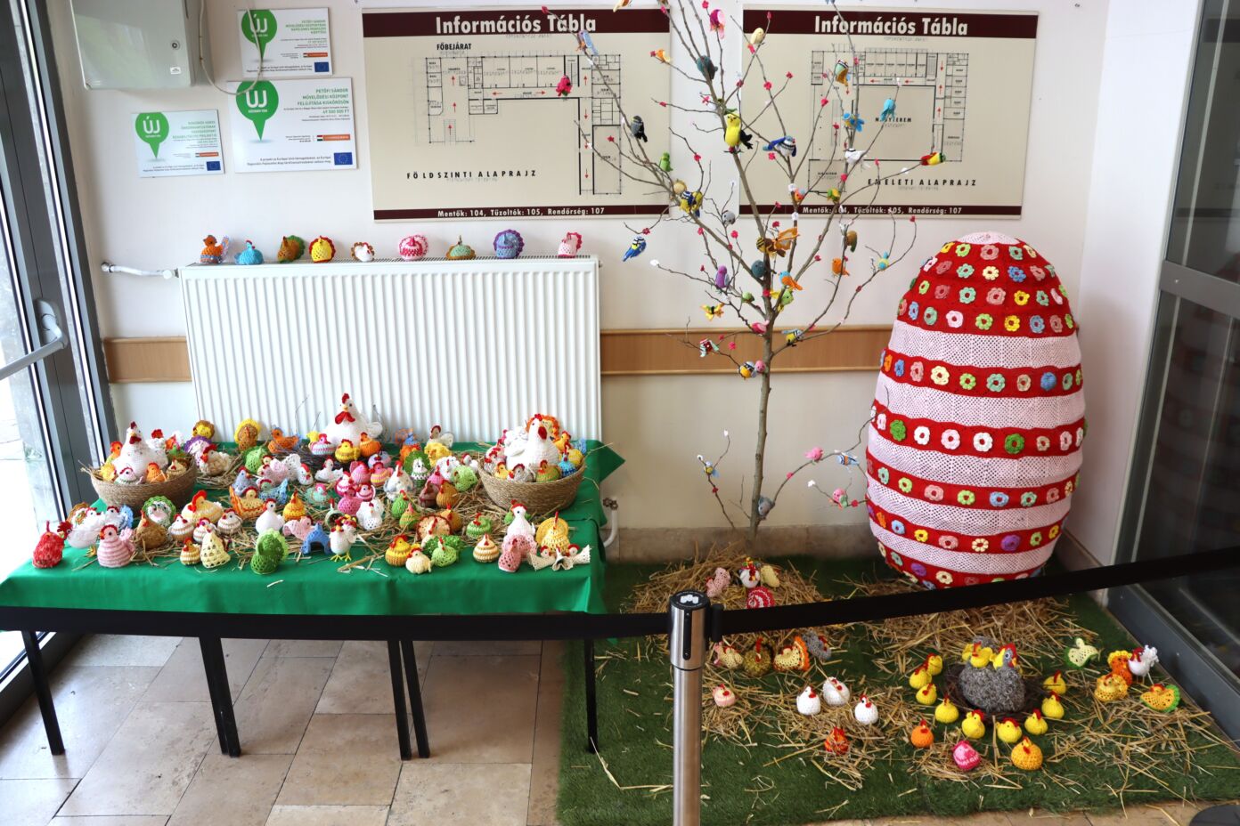 A Petőfi Sándor Művelődési Központ bejáratánál egyedi, kézzel készült húsvéti díszeket tekinthettek meg a jelenlévők, amiket a Kiskőrös Rózsája Horgolókör tagjai készítettek.