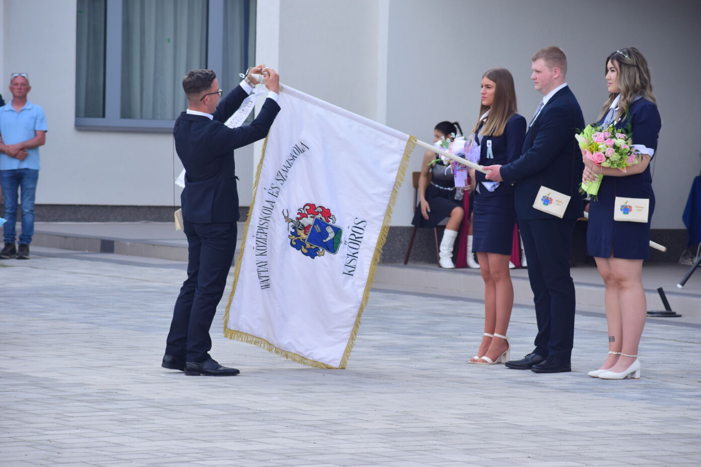 Majd a végzősök feltűzték a szalagot az iskola zászlajára. Szalagot kötött fel: Polereczki György (3/11/2 osztály), Bodi Mónika Zsuzsanna (3/11/1), Ocskai Roland (13. B), Pap Sándor Tibor (13. A).