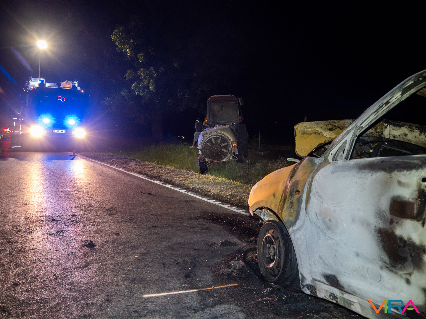 A baleset a főút 41-es kilométerszelvényénél történt. Egy személyautó eddig tisztázatlan körülmények között hátulról nekiütközött egy permetezőt vontató traktornak. A jármű az ütközés hatására az árokba csapódott, míg az autó kigyulladt, és percek alatt lángba borult. Az autóban egyedül utazó sofőr megsérült, őt a mentők a helyszíni ellátás után a kiskunhalasi kórházba szállították. Sérülésének mértékéről egyelőre nem adtak ki hivatalos információt.