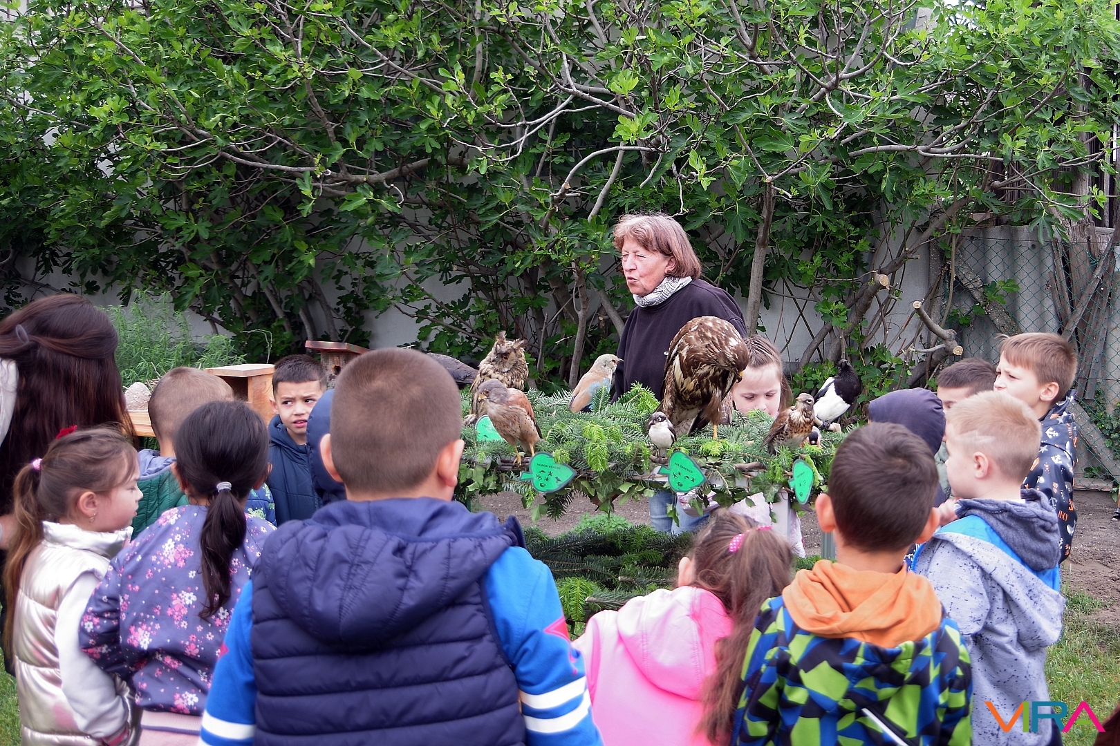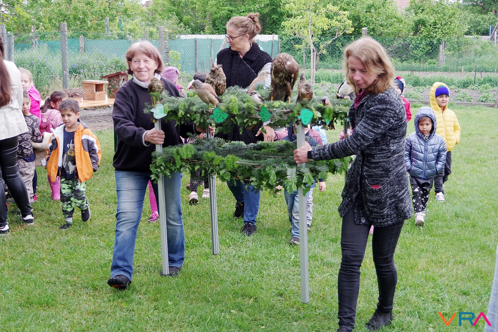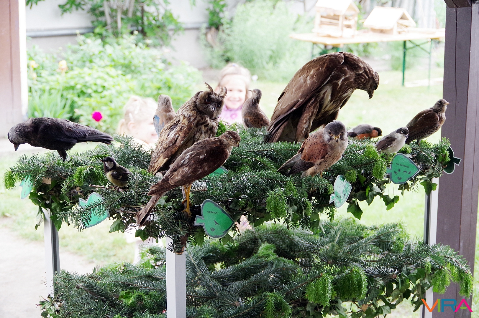 Az állatokat egy fenyőgallyakból kialakított kereten elhelyezett, preparált madarakból kialakított bemutatóval tárták a gyermekek elé. A madarak neve mellett kisebb rajzok formájában odakerült, hogy mivel táplálkoznak.