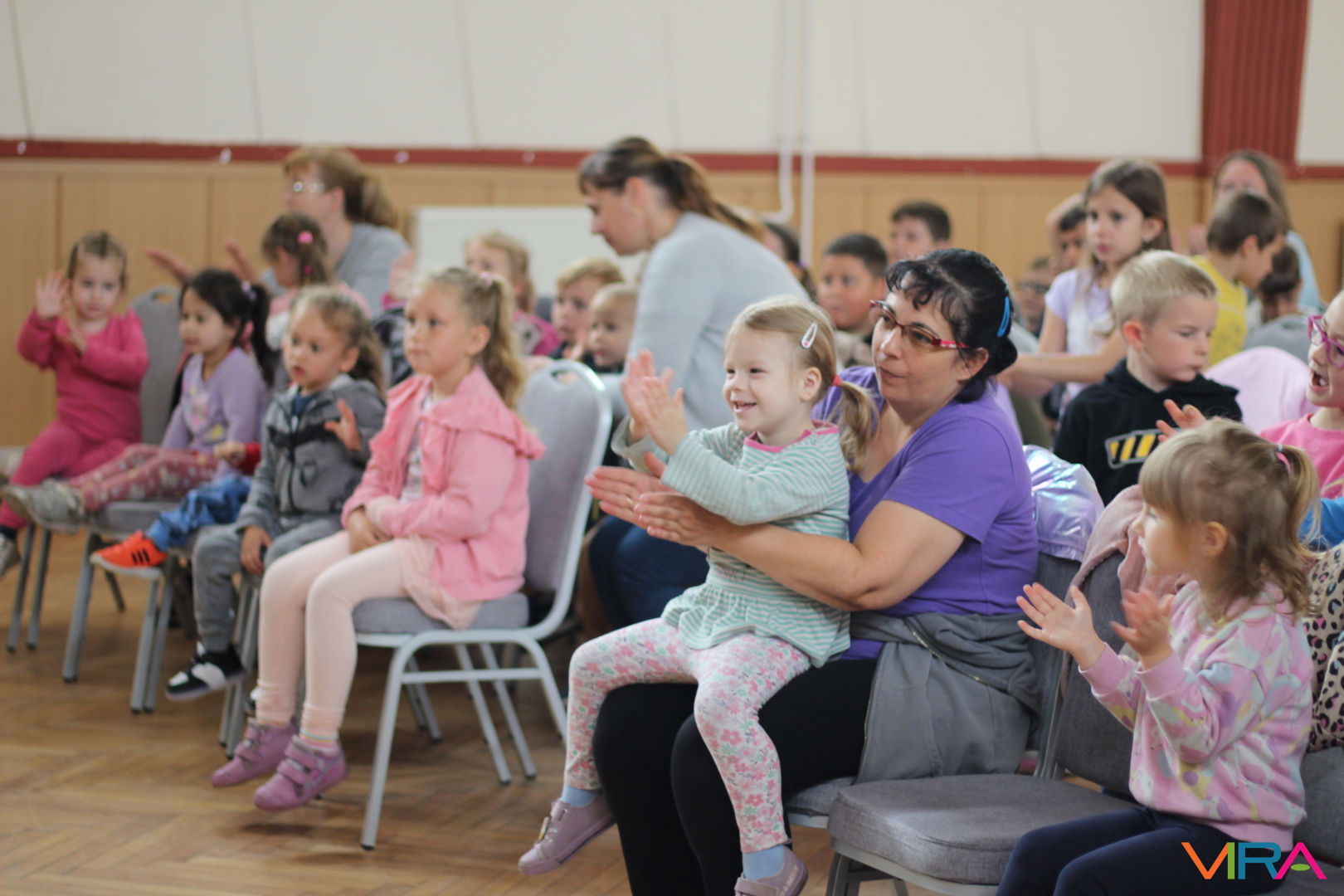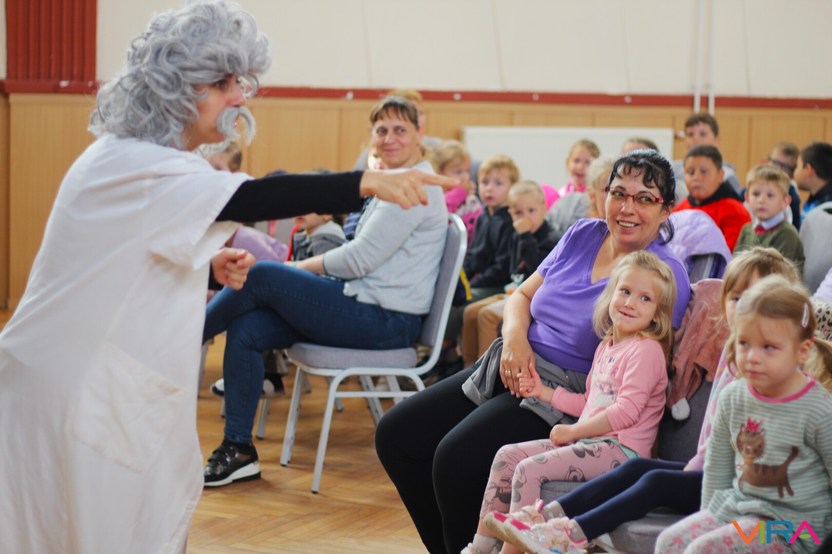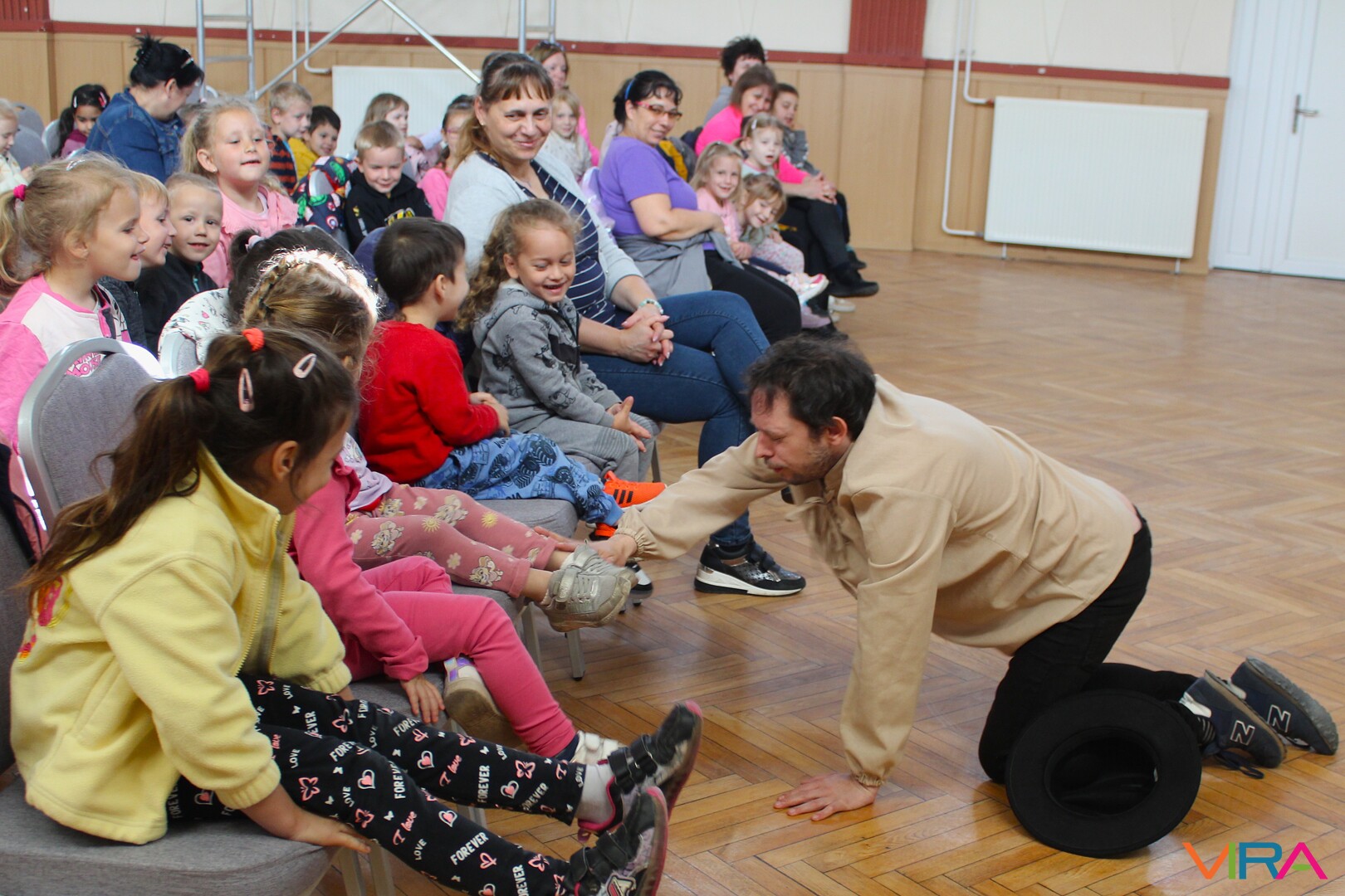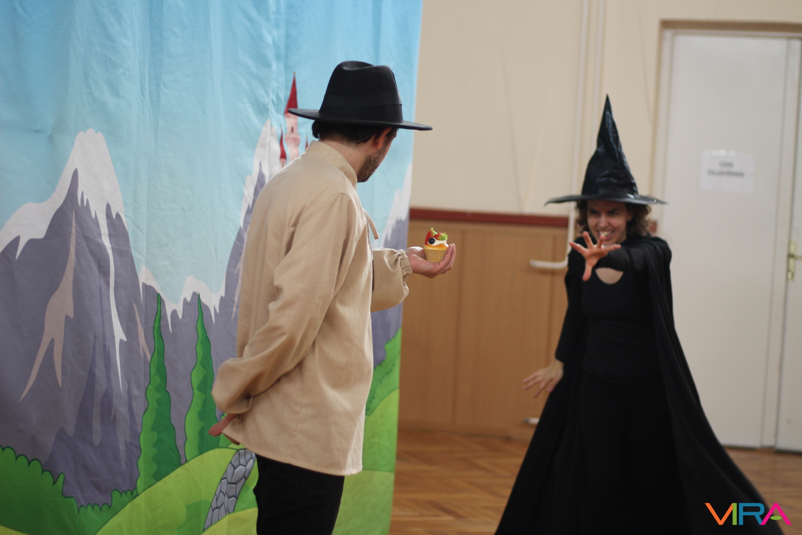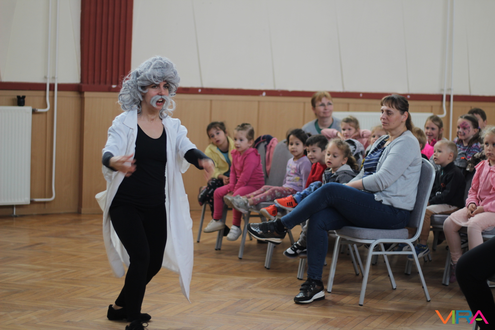 Az interaktív mesejátékot Mesés Gábor és Sóti-Mihalics Klaudia adta elő játékosan, mozgással kísért feladatokon keresztül bevonva a gyermekeket a történetbe. Az előadás során kiemelt hangsúlyt kapott a türelem, a figyelem és a nyelvi készségek fejlesztése – mindezt a gyerekek számára élvezetes, mesebeli keretben.