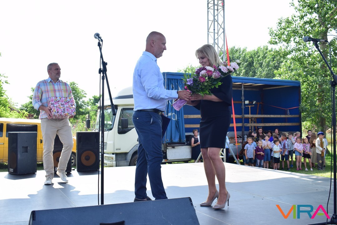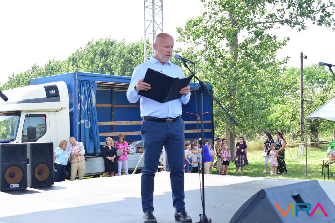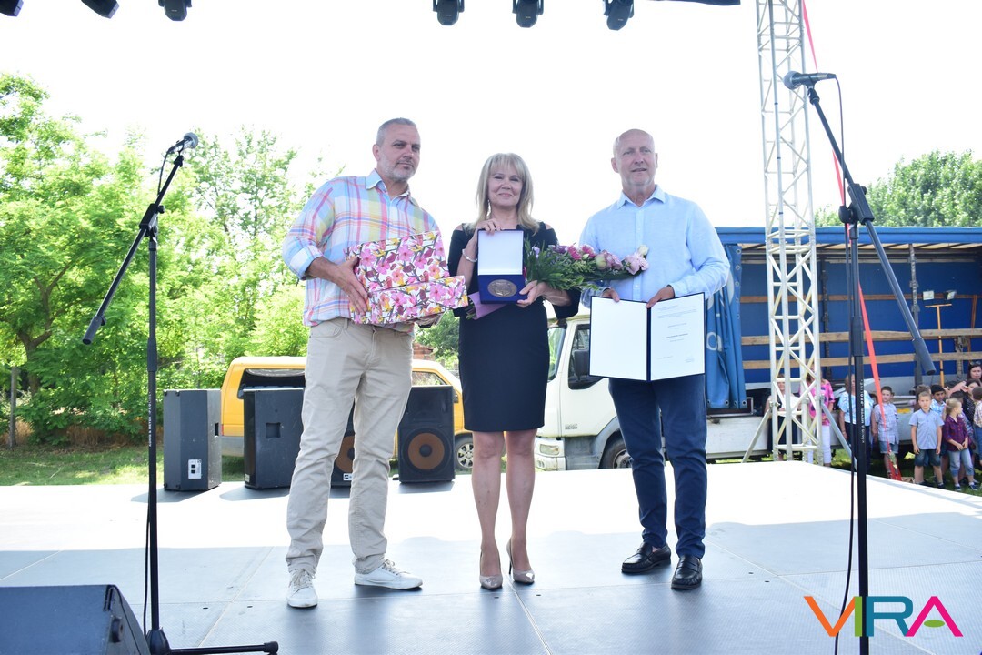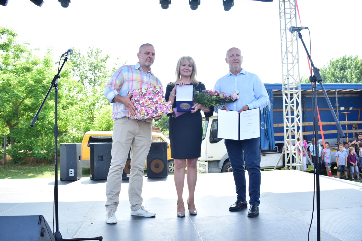 Ezután Tabdi Településért Emlékérem átadására került sor, melyet idén Szkenderovics Lajosné Irma vehetett át a képviselő testület döntése alapján. Neve összefonódott Tabdi közösségi életével, oktatásával és közéletének alakításával. Pályafutása során olyan elhivatottsággal és kitartással dolgozott a faluért és az itt élőkért, amely példaértékű a település lakosainak számára. Irma tanárnő, ahogyan a polgármester is szólította, 1998. szeptember 1-jén kezdte meg pedagógusi munkáját a Tabdi Általános Iskolában. Több generáció nőtt fel a kezei alatt. Tanítványai nem csak tudást, hanem emberséget, következetességet és értékeket is kaptak tőle. Oktatói munkáját mindig lelkiismeretesen, a gyermekek fejlődését szem előtt tartva végezte. Fontos volt számára, hogy a tanulók ne csak tankönyvi ismeretekkel, hanem a közösségi értékekkel, erkölcsi tartással, és önbizalommal felvértezve lépjenek tovább az élet útján. 1998-ban kezdte meg munkáját Tabdi Község Önkormányzatának képviselőjeként és egészen 2024-ig, 26 éven át aktívan részt vett a falu ügyeinek irányításában. Képviselői tevékenysége során mindig a helyi közösséget és értékeket tartotta szem előtt. Különös figyelmet fordítva az oktatásra, gyermekekre, családokra és az idősekre. A testületi munkában szorgalmas, alapos, konstruktív jelenléte hozzájárult, hogy Tabdi fejlődő és összetartó településsé váljon.
