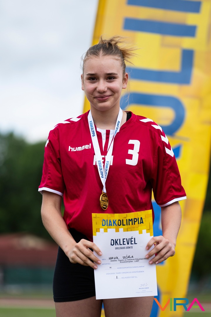 Zorka több ezer induló között lett a legjobb úgy, hogy hetedikes létére a nyolcadikosok között versenyzett. Legnagyobb ellenfele egy bólyi gerelyhajító lány volt, akivel már tavaly is nagy csatát vívott az első helyért. Az országos döntő napján fel-feltámadó szél csak tovább növelte az izgalmakat, hiszen a hátszéllel dobók teljesítményét a szélcsendben dobók nemigen tudták túlszárnyalni. Az első három kör után Zóra a körülmények ellenére is a legjobb nyolc között volt, így újabb három környi lehetőséget kapott az előbbre lépésre. Ekkor még több mint 2 méter volt a kiskőrösi lány hátránya. A szél közben csillapodott, így kijött a tudásbeli különbség, és Zorka rögtön az első körben 2,5 métert javítva addigi eredményén, 64,47 méteres dobással élre állt a versenyben. A folytatásban ellenfelei csak megközelíteni tudták ezt a nagyszerű eredményt, így Hauk Zóra harmadszor is felállhatott a diákolimpiai dobogó tetejére.