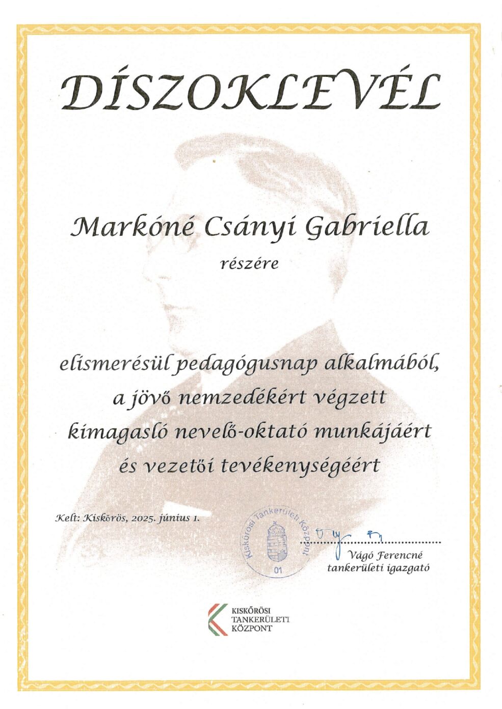 Továbbá Markóné Csányi Gabriella igazgató kiemelkedő nevelő-oktató munkáját és vezetői tevékenységét is díszoklevéllel ismerték el, aki kiemelkedő szerepet játszott az iskola fejlődésében és az oktatási színvonal emelésében. A kitüntetés nemcsak az igazgató elkötelezettségét ismeri el, hanem az iskolai közösség iránti elhivatottságát és a diákok jövőjéért tett erőfeszítéseit is.