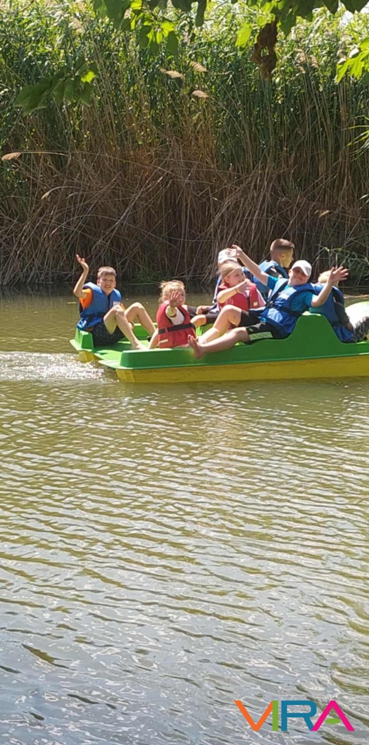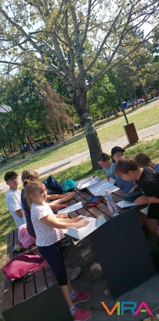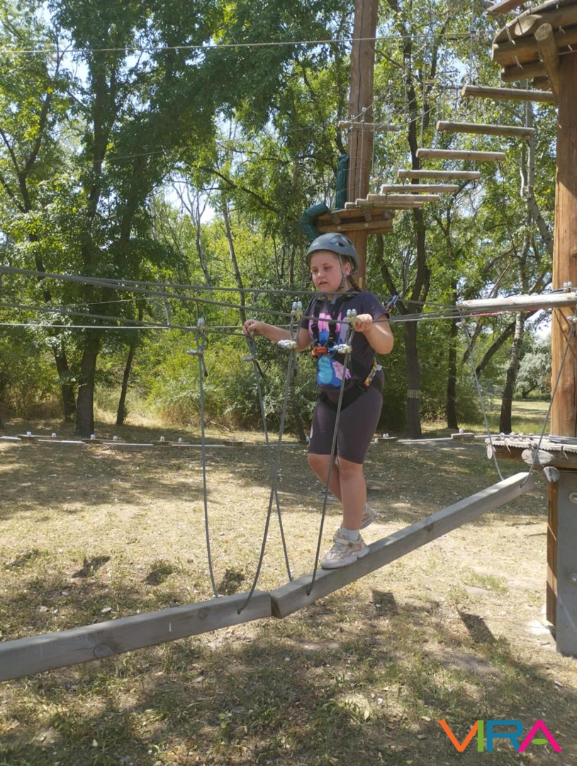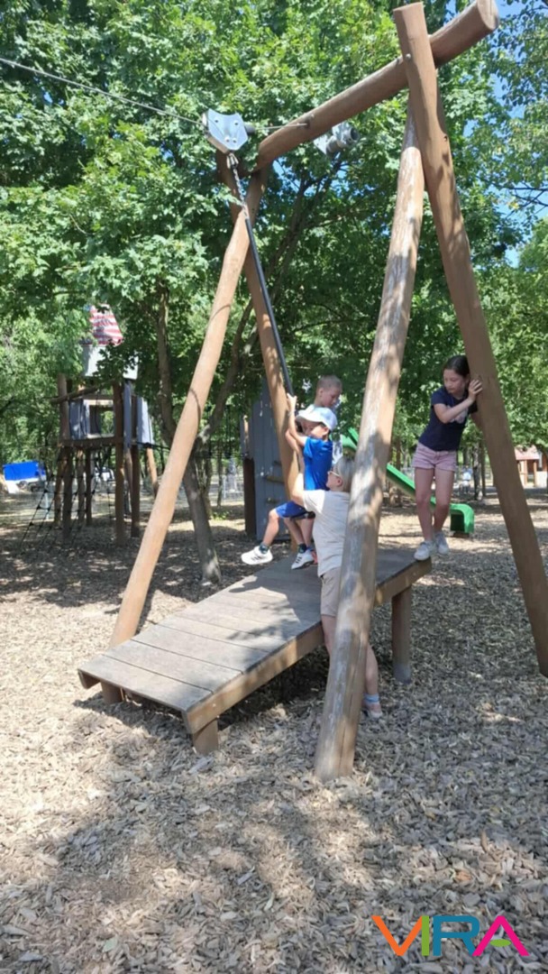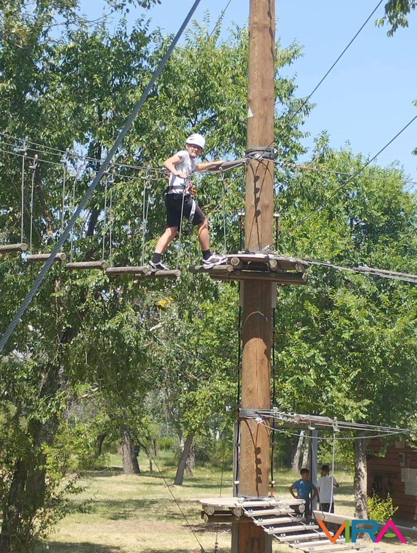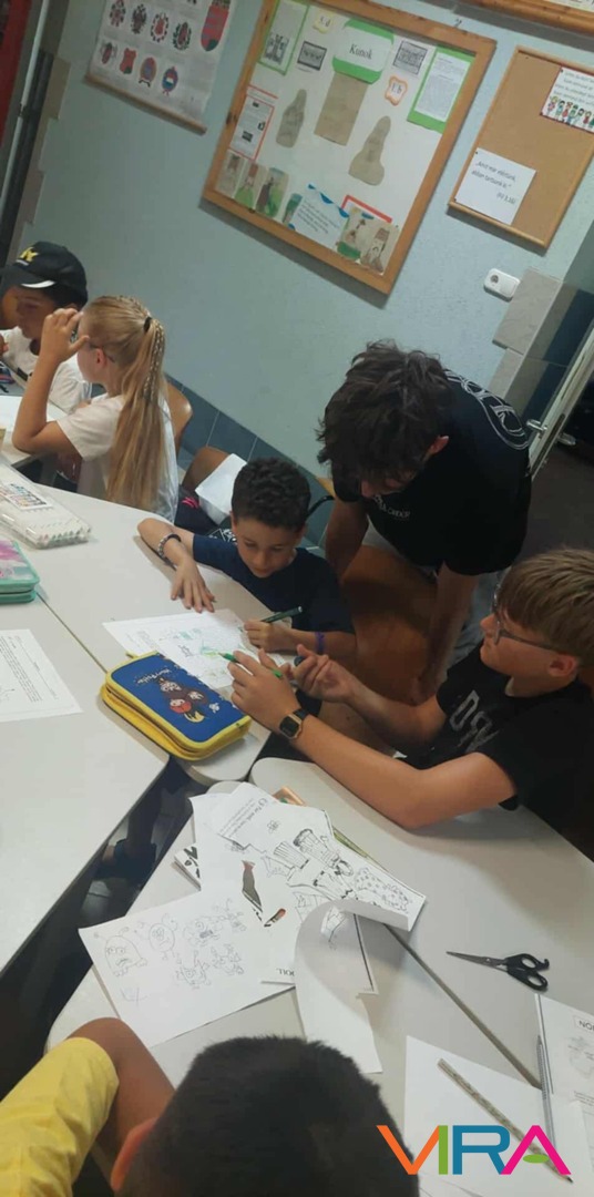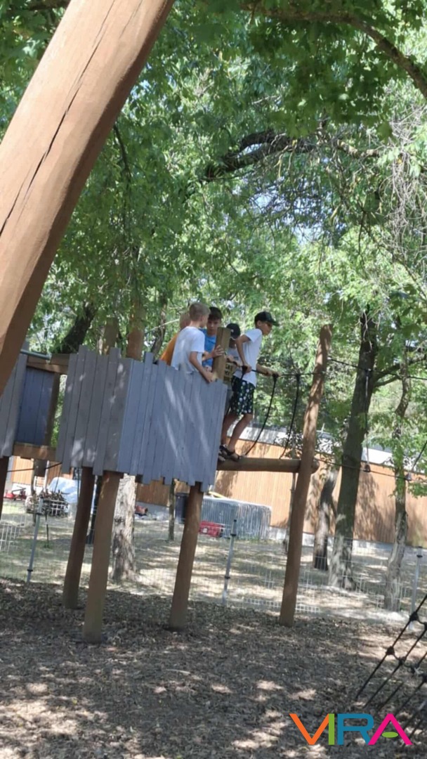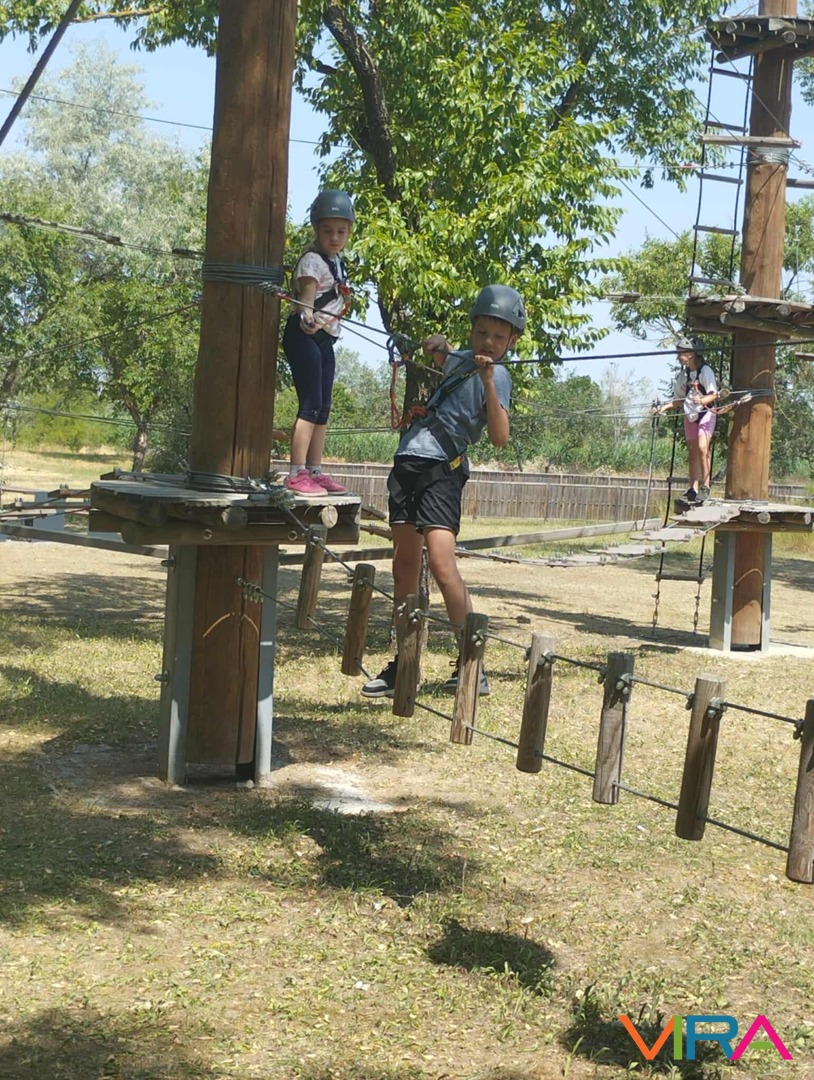 “Első napon menetrend szerinti járattal Kiskunhalasra utaztunk a Csetényi élményparkba, ahol a nyelvi foglalkozások mellett megnéztük a vízibivalyokat, akik elégedetten hűsöltek nyakig a vízben. A rekkenő hőség ellenére teljesítettük a kötélpályát is. A Csipke Hotelben megebédeltünk, de hagytunk helyet a popcornnak, mert a mozi volt a következő állomásunk mielőtt hazaindultunk.