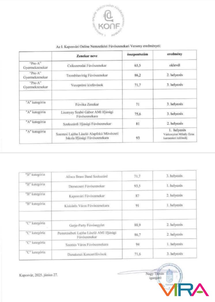 Örömmel tájékoztatunk benneteket, hogy Kiskőrös Város Fúvószenekara részt vett az I. Kaposvári Online Nemzetközi Fúvószenekari Versenyen, ahol a „B” kategóriában 91 ponttal megosztott első helyezést ért el.