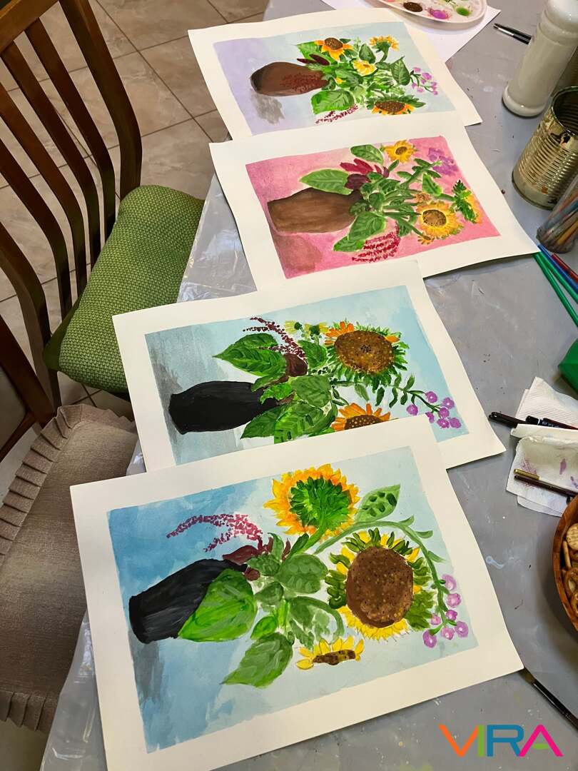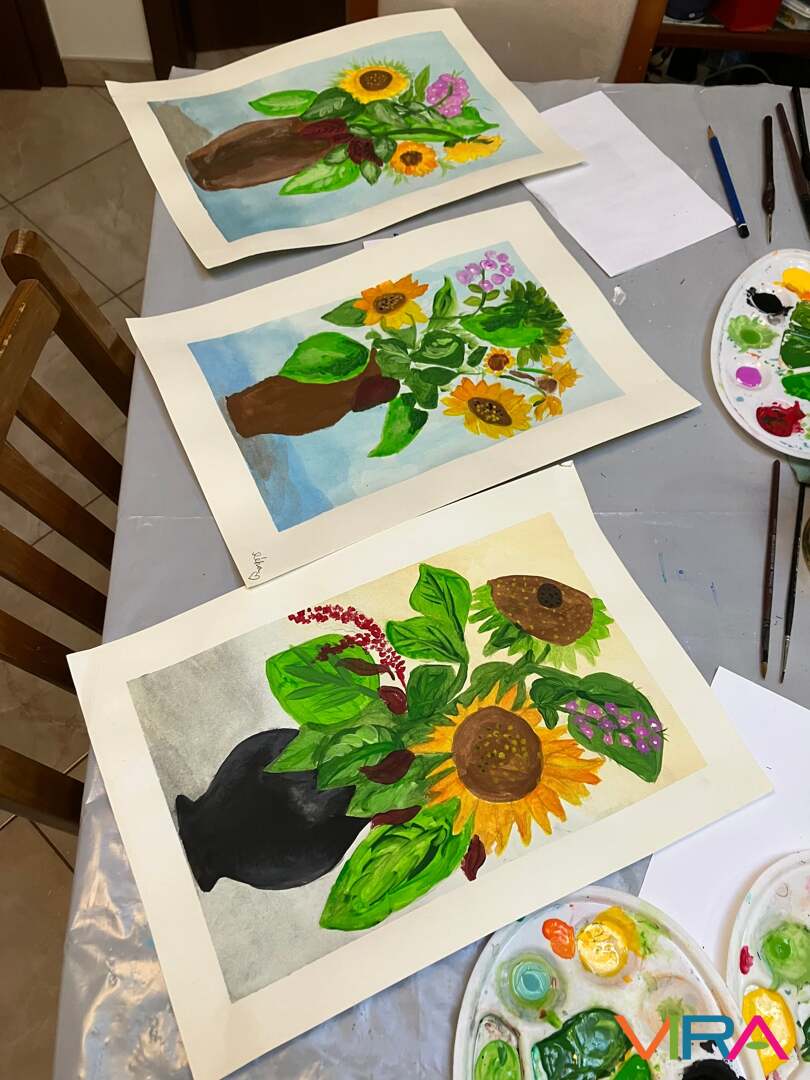 A keddi napon a gyerekek elé egy csokor került, amit mindenki saját nézőpontjából festett meg. Itt már az arányok helyes érzékelése és a fény–árnyék viszonyok megfigyelése került előtérbe – a cél az volt, hogy a gyerekek megtanulják, hogyan kelthetnek térbeli hatást kétdimenziós felületen.
