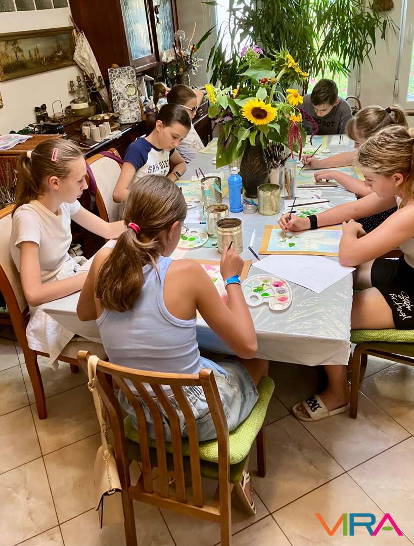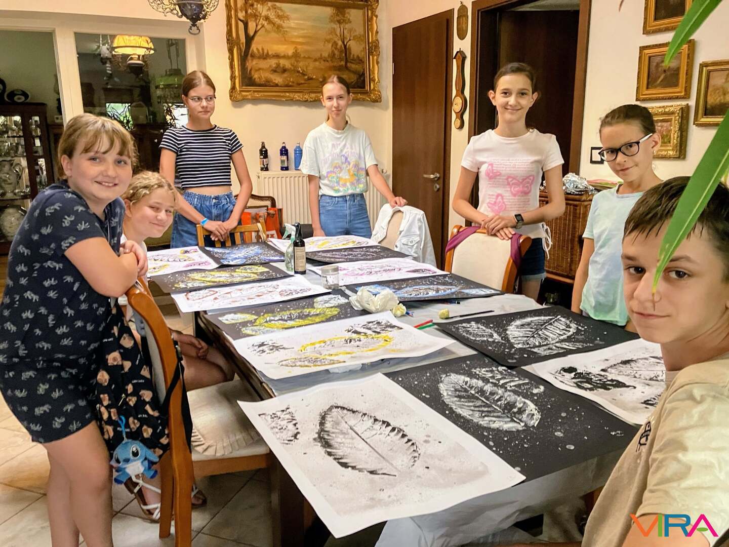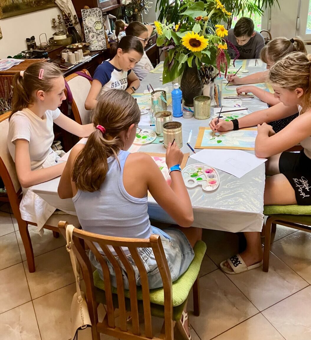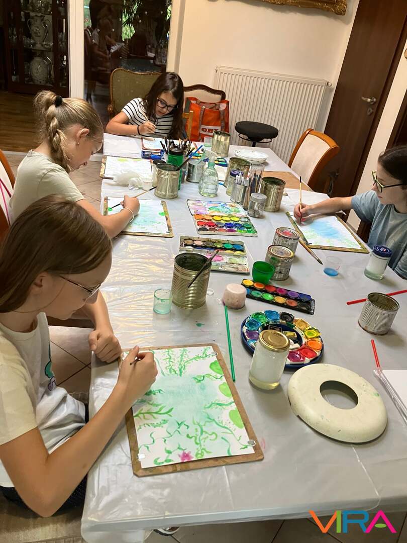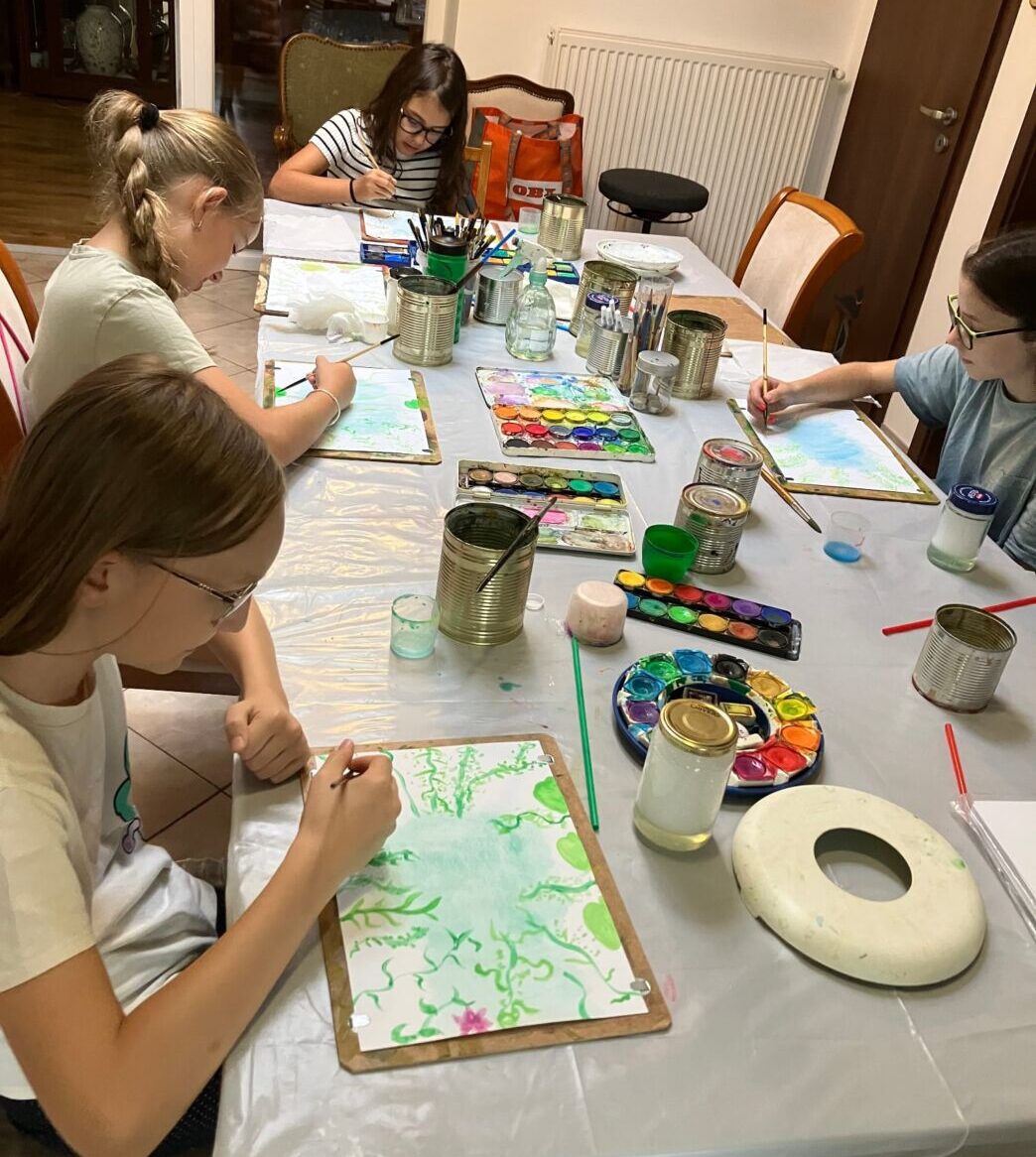 A második turnus július 14-17-ig– ezúttal hét fővel, köztük új és visszatérő táborozókkal – szintén a buborékfestéssel kezdődött. A nagyobbak is örömmel fogadták ezt az egyedi technikát, amely egyszerre látványos és elmélyülést igénylő. Ők már akrill festéket használtak az alkotáshoz.