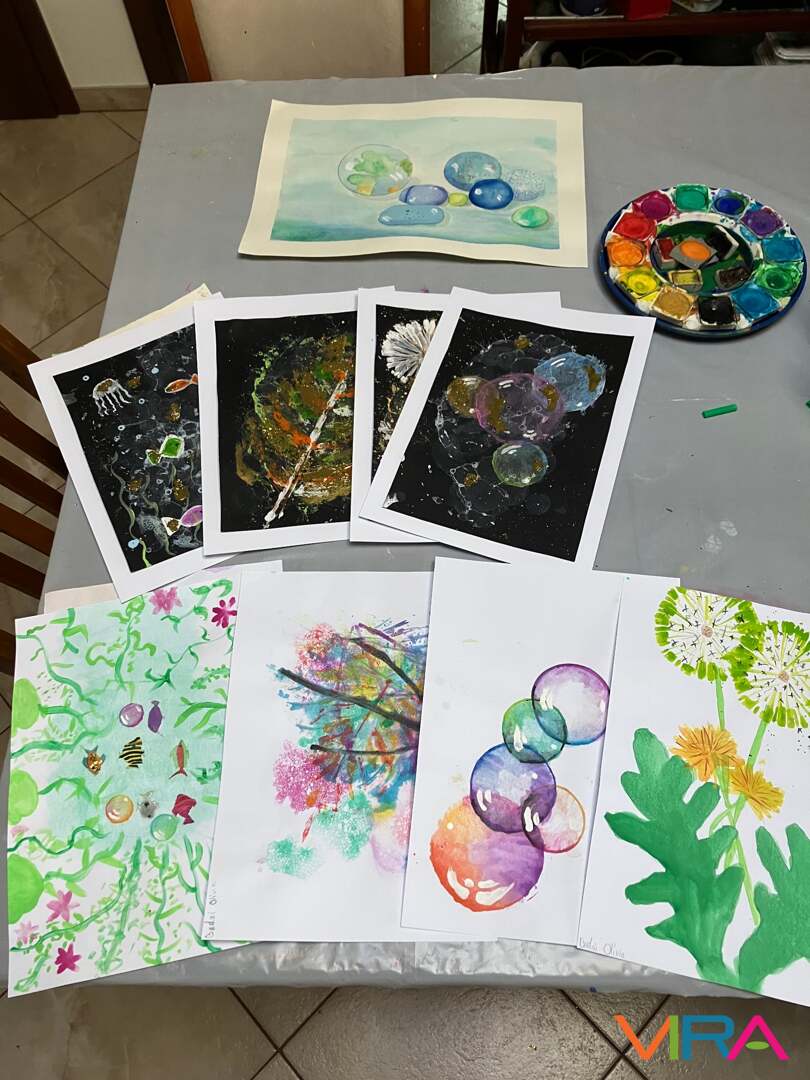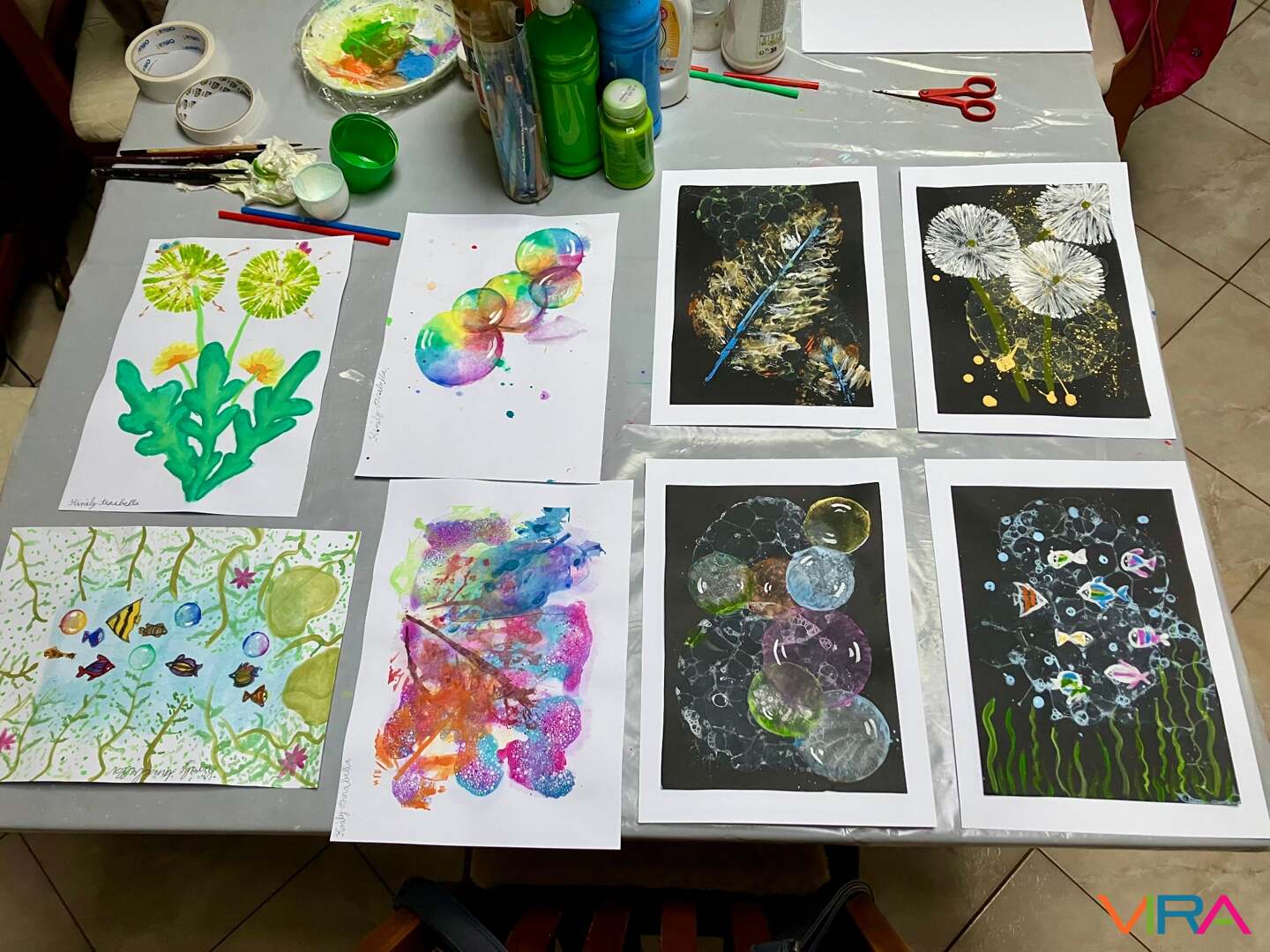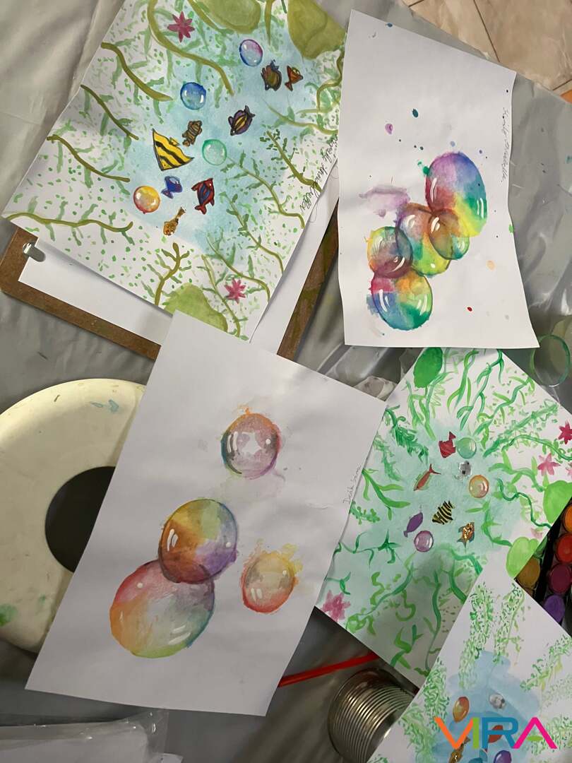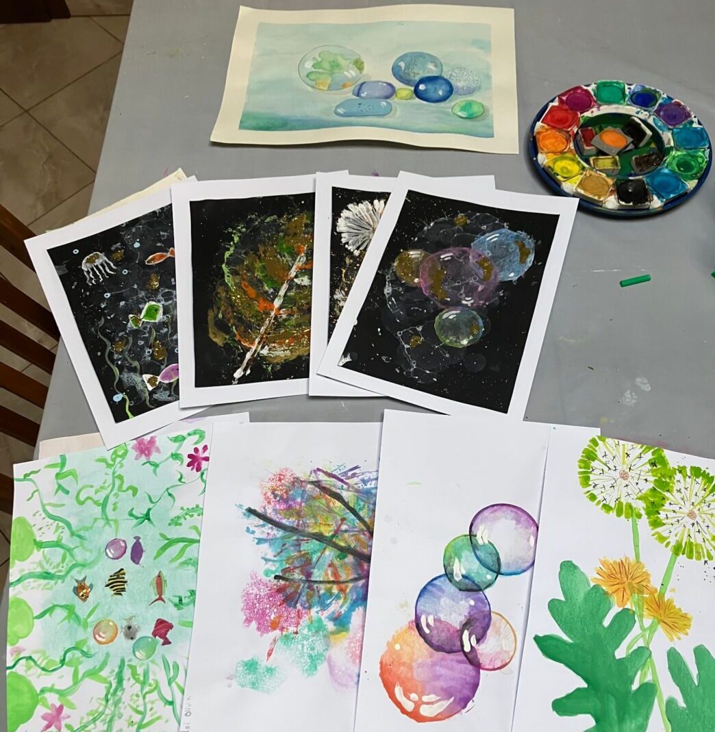 A gyerekek a különféle színátmenetek kikeverésével, a fényforrás irányának megfigyelésével és finom ecsetkezeléssel sajátították el azt, hogyan lehet „megfogni a megfoghatatlant” – vagyis akvarellpapírra vinni egy buborék légies, törékeny szépségét.