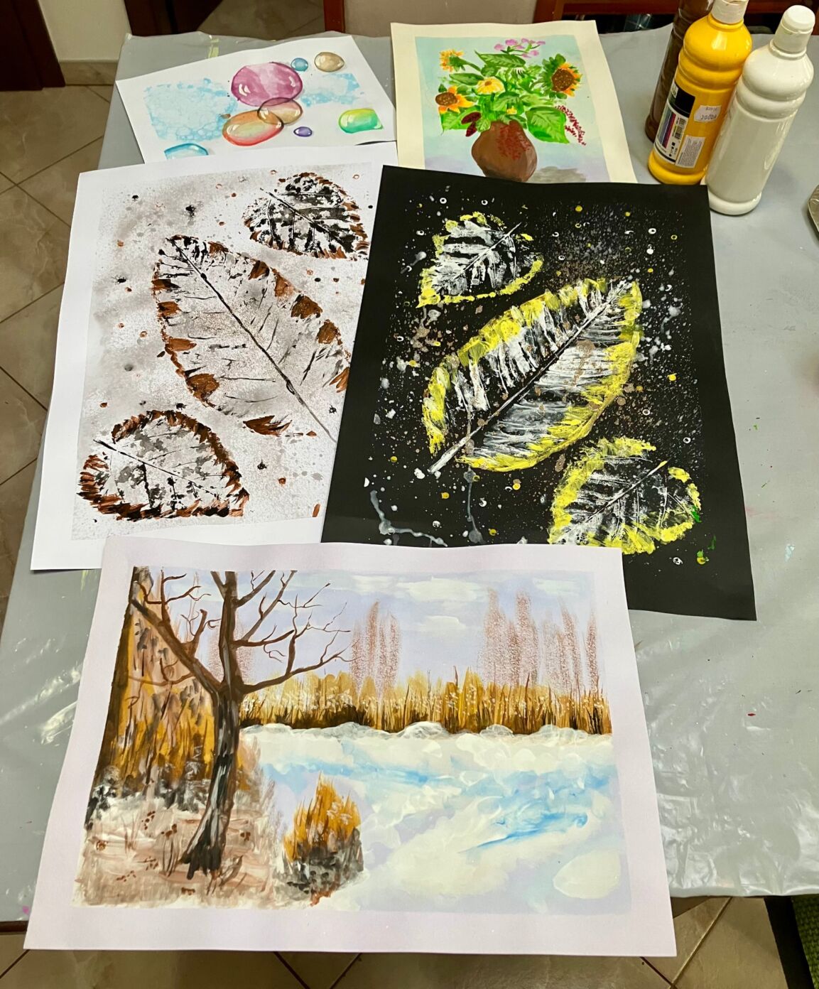 A szerdai és csütörtöki napokon már a tanultak megvalósítására került sor, méghozzá fekete festőkartonon. A sötét háttér különösen jól kiemelte a buborékok áttetsző, fénylő hatását – a gyerekek munkái szinte életre keltek, ahogy a színek vibráltak a mély tónus előtt. Az alkotók nemcsak technikai ügyességről, de érzékenységről és megfigyelőképességről is tanúbizonyságot tettek.