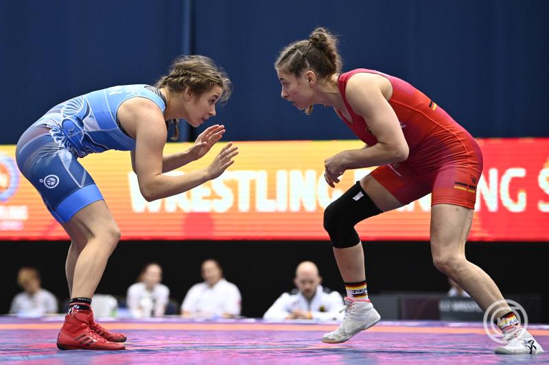 A kiemelt képen Bognár Erika (kékben) és német ellenfele a budapesti BOK csarnokban 2025. július 18-án