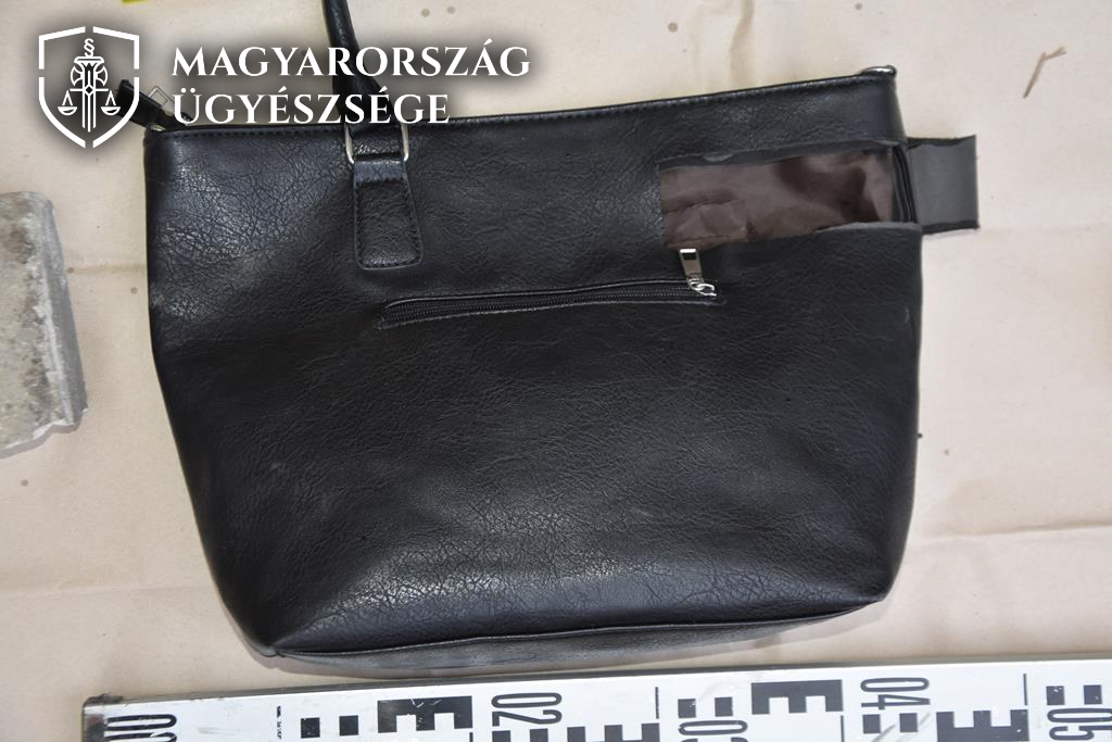 A rendőrségi szemlefotókon a rablás helyszíne és a sértett késsel megrongált táskája látható.