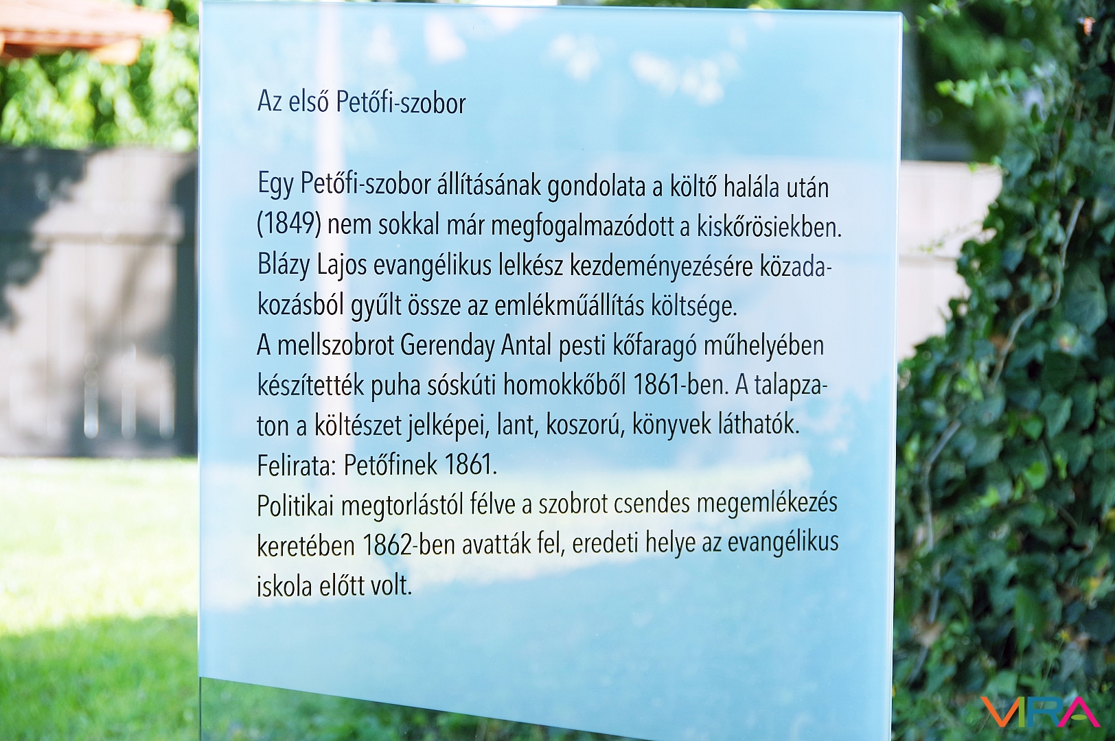 Az első Petőfi-szoborról tudni kell, hogy felállításának gondolata a költő halála után (1849) nem sokkal már megfogalmazódott a kiskőrösiekben. Akkor Blázy Lajos evangélikus lelkész kezdeményezésére közadakozásból gyűlt össze az emlékműállítás költsége. A mellszobrot Gerenday Antal pesti kőfaragó műhelyében készítették puha sóskúti homokkőből 1861-ben. A talapzaton a költészet jelképei, lant, koszorú, könyvek láthatók – felirata: Petőfinek 1861. Politikai megtorlástól félve a szobrot csendes megemlékezés keretében 1862-ben avatták fel, eredeti helye az evangélikus iskola előtt volt.