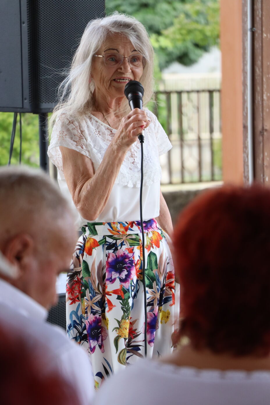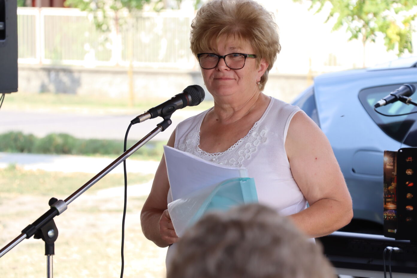 A kiskőrösi Duchai Józsefné, aki 2023-ban az Országos Nyugdíjas Ki-Mit-Tud-on Kiemelt Arany minősítést szerzett, két dallal készült a közönségnek.