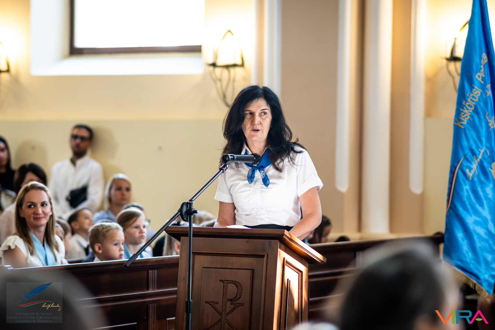 Külön köszöntötte a gyesről visszatérő Dulai Vivien és Pogány-Andriska Anett tanító néniket, Pfeifer-Dömök Krisztina lelkésznőt, aki szeptembertől iskolalelkészi szolgálatot is végez a középiskolában, illetve sok sikert kívánt, igazgatóhelyettesi munkaköréhez Pivarcsiné Raffai Enikő tanárnőnek.