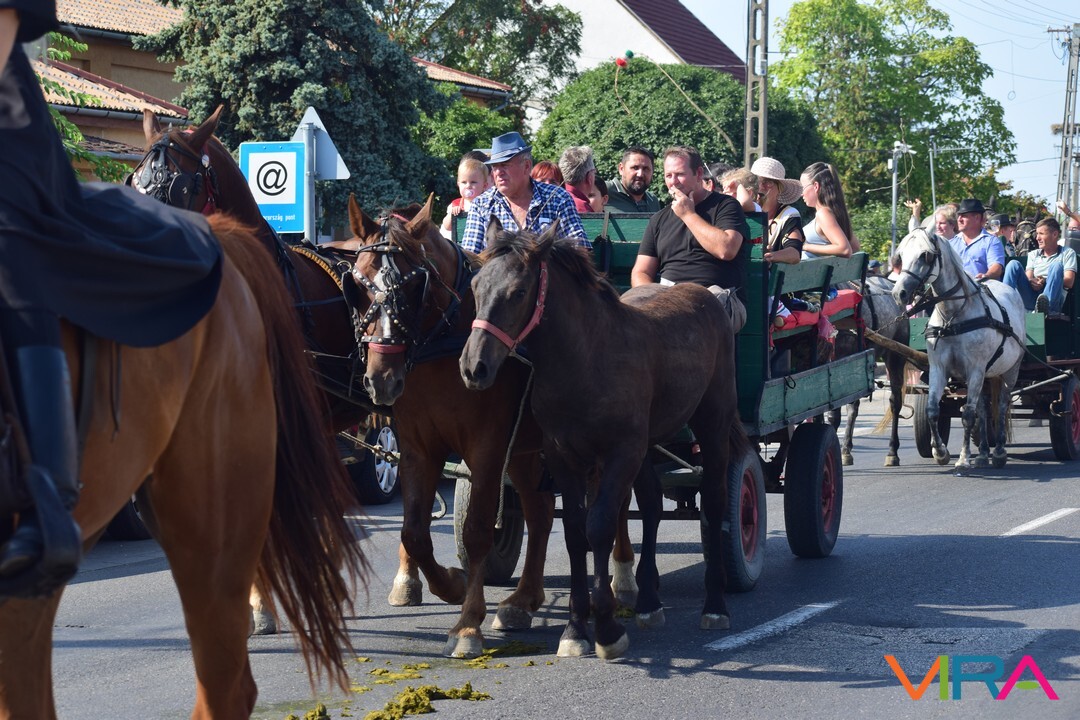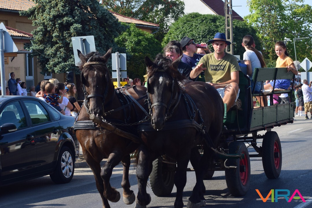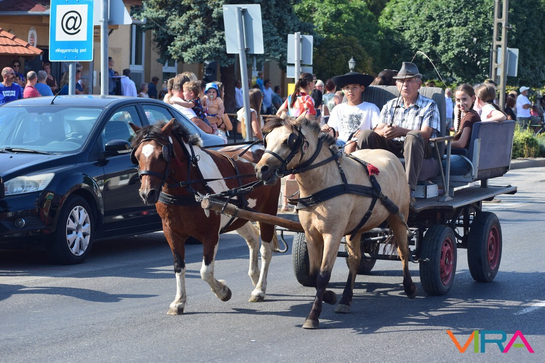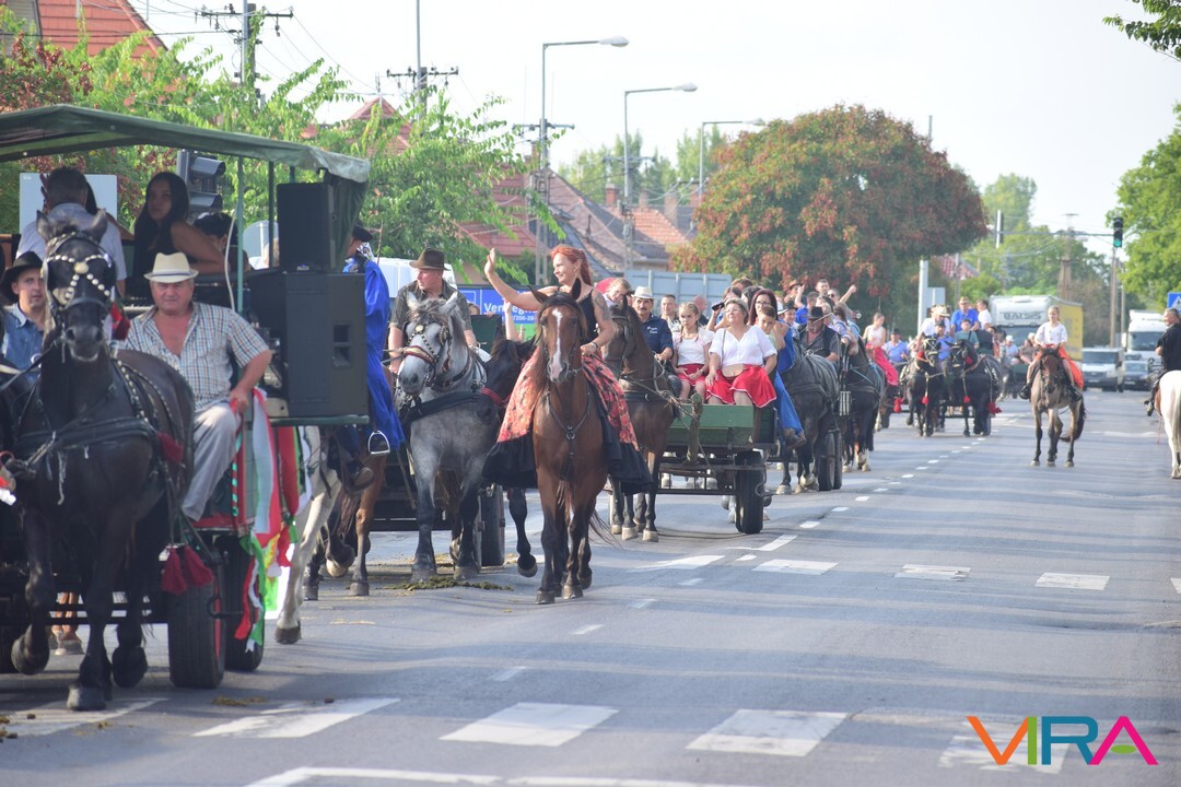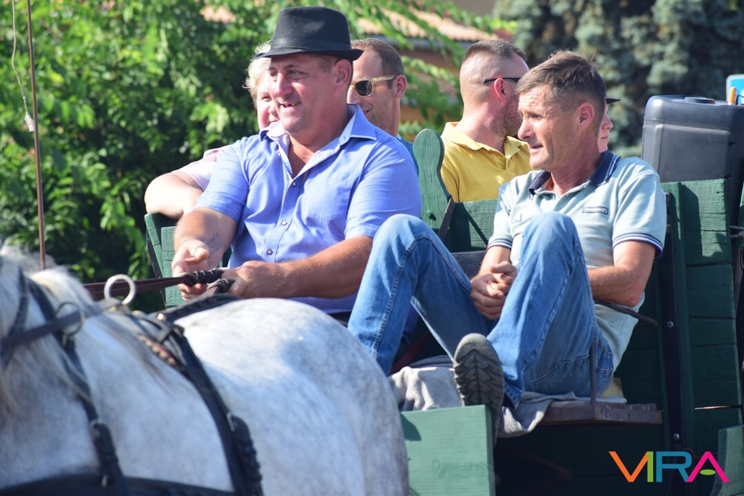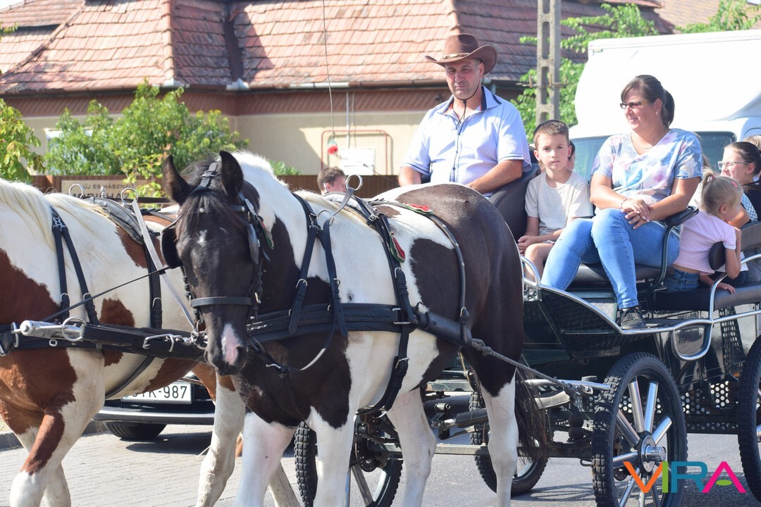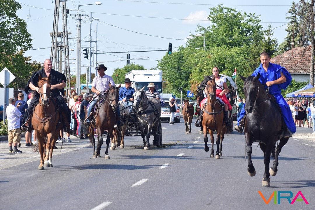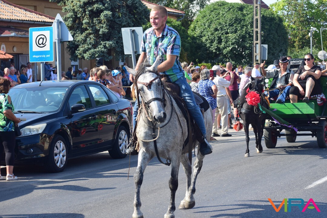 Ezt követően indult el Akasztó utcáin a közel ötven kocsit számláló szüreti menet, a csikósok, fogatosok, kocsisok és lóhátasok látványos felvonulásam melyre nem csak helyből, hanem a környező településekről is érkeztek. A gyülekező és a fogadás a Stadler Stadion mellett volt, ahol finom pörköltekkel és hideg italokkal várták a felvonulásra érkezőket. A szüreti felvonulást idén is az Akasztói Lovas Egyesület szervezte. A meneten a jó hangulathoz a talpalávalót Oroszi Sándor szolgáltatta.