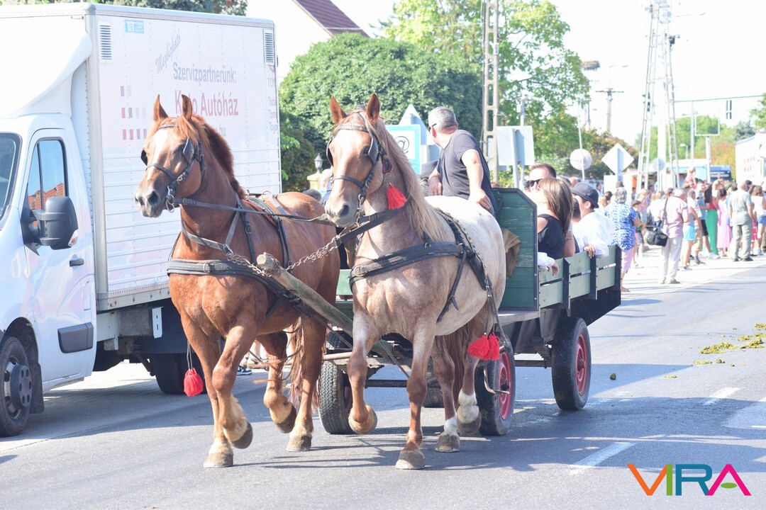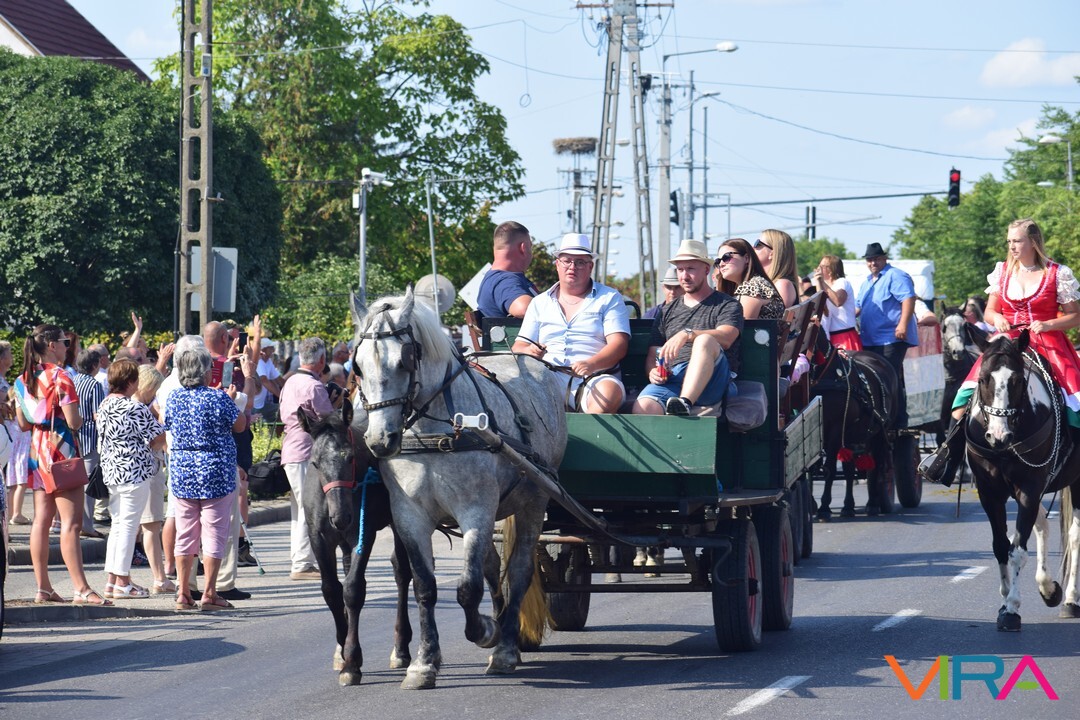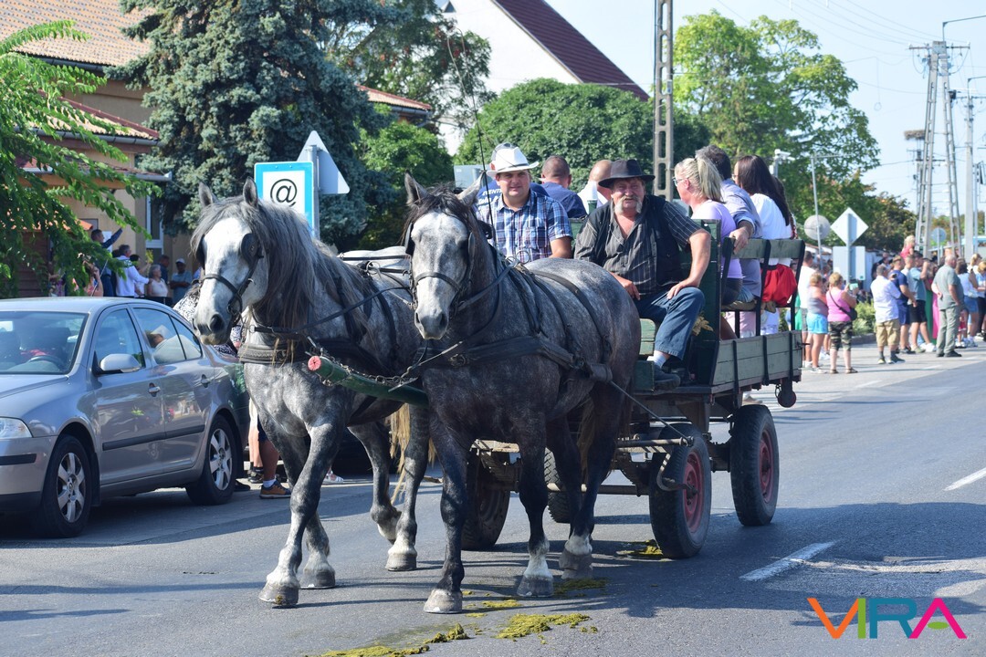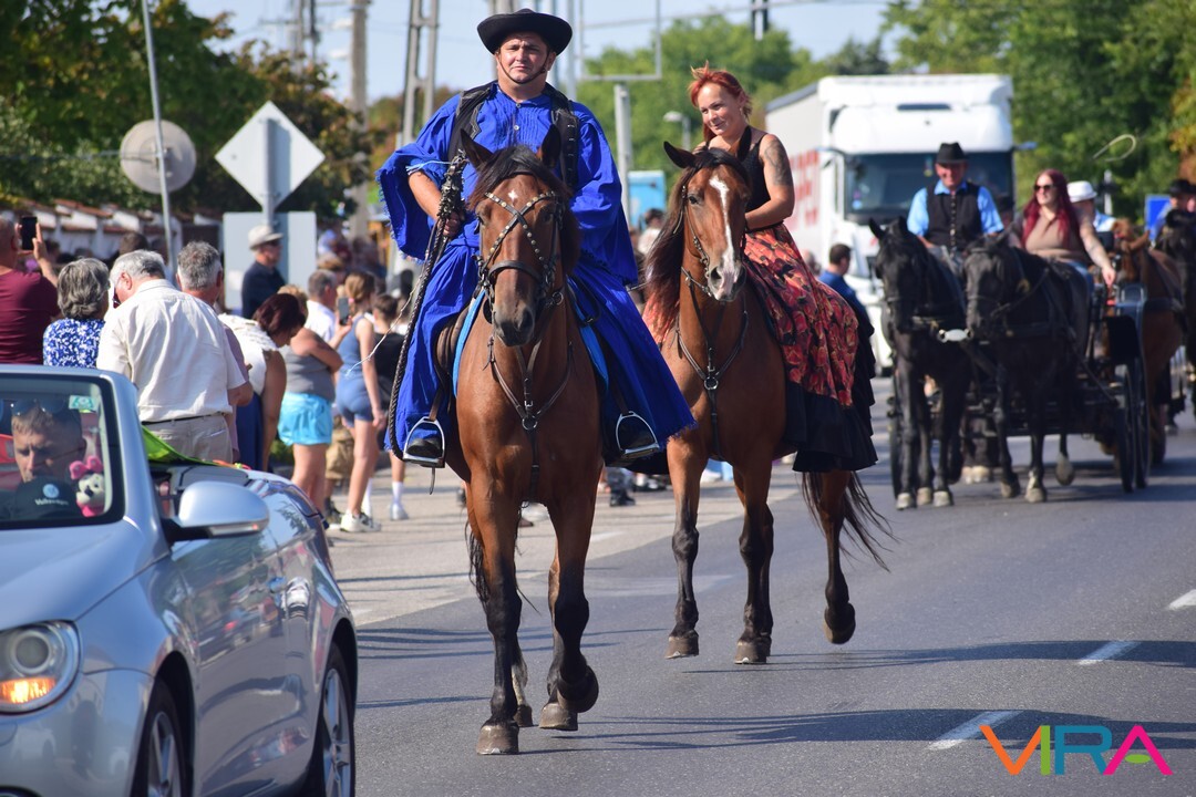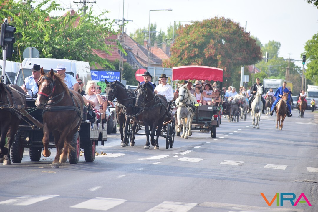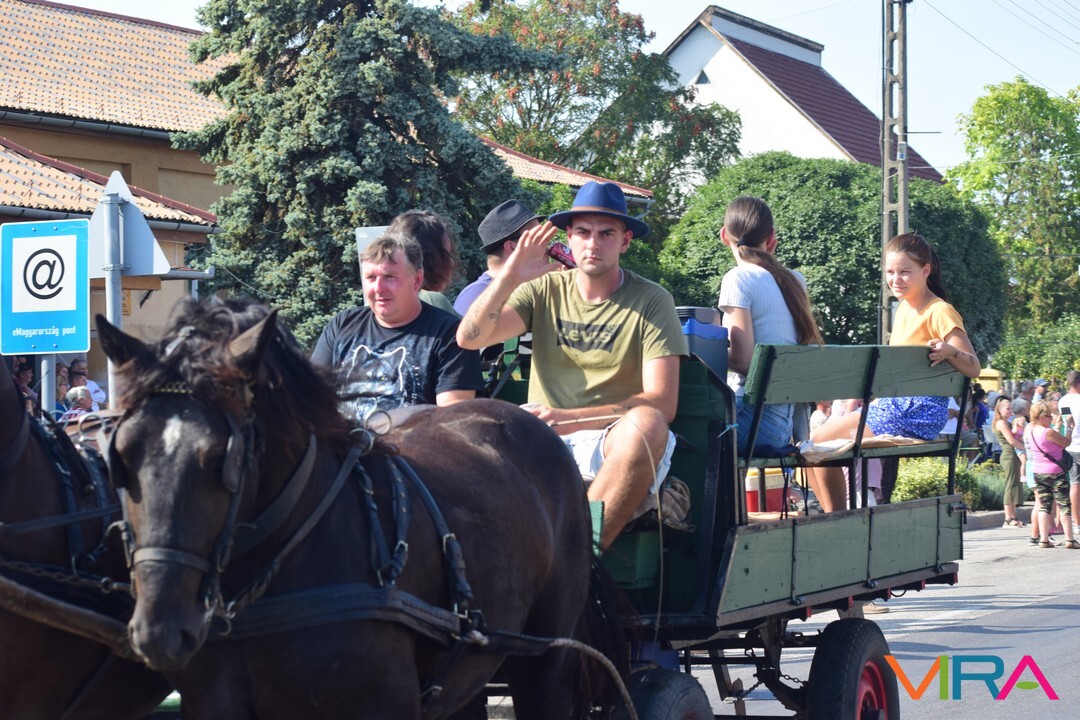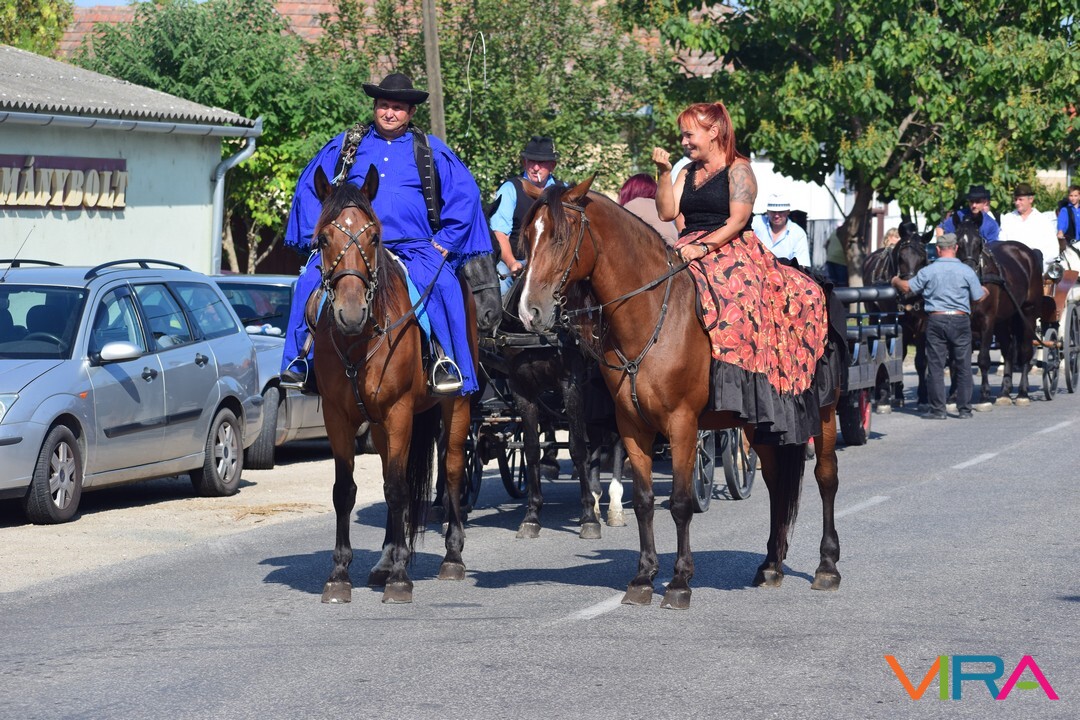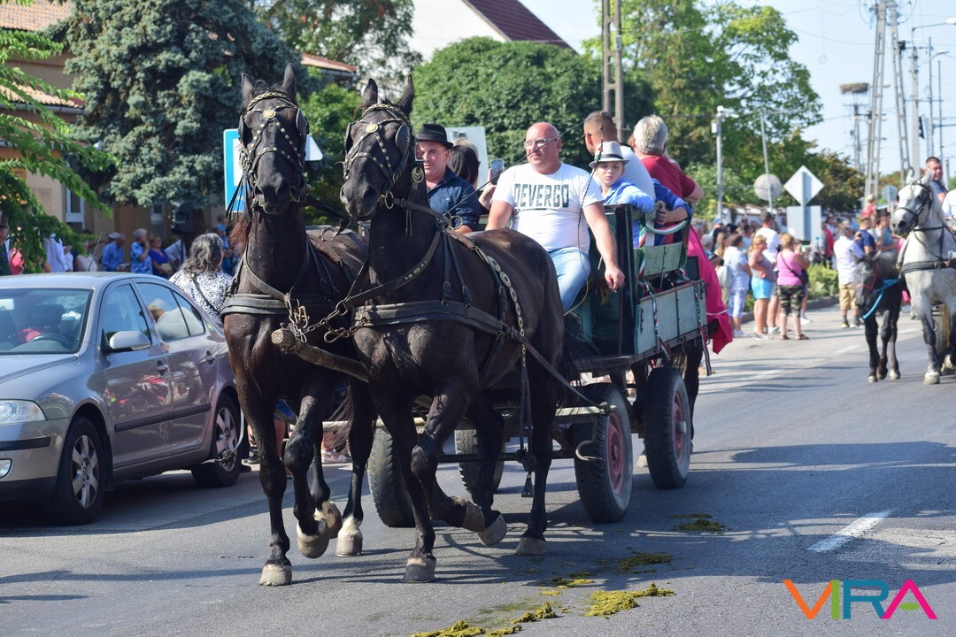 Ezt követően indult el Akasztó utcáin a közel ötven kocsit számláló szüreti menet, a csikósok, fogatosok, kocsisok és lóhátasok látványos felvonulásam melyre nem csak helyből, hanem a környező településekről is érkeztek. A gyülekező és a fogadás a Stadler Stadion mellett volt, ahol finom pörköltekkel és hideg italokkal várták a felvonulásra érkezőket. A szüreti felvonulást idén is az Akasztói Lovas Egyesület szervezte. A meneten a jó hangulathoz a talpalávalót Oroszi Sándor szolgáltatta.