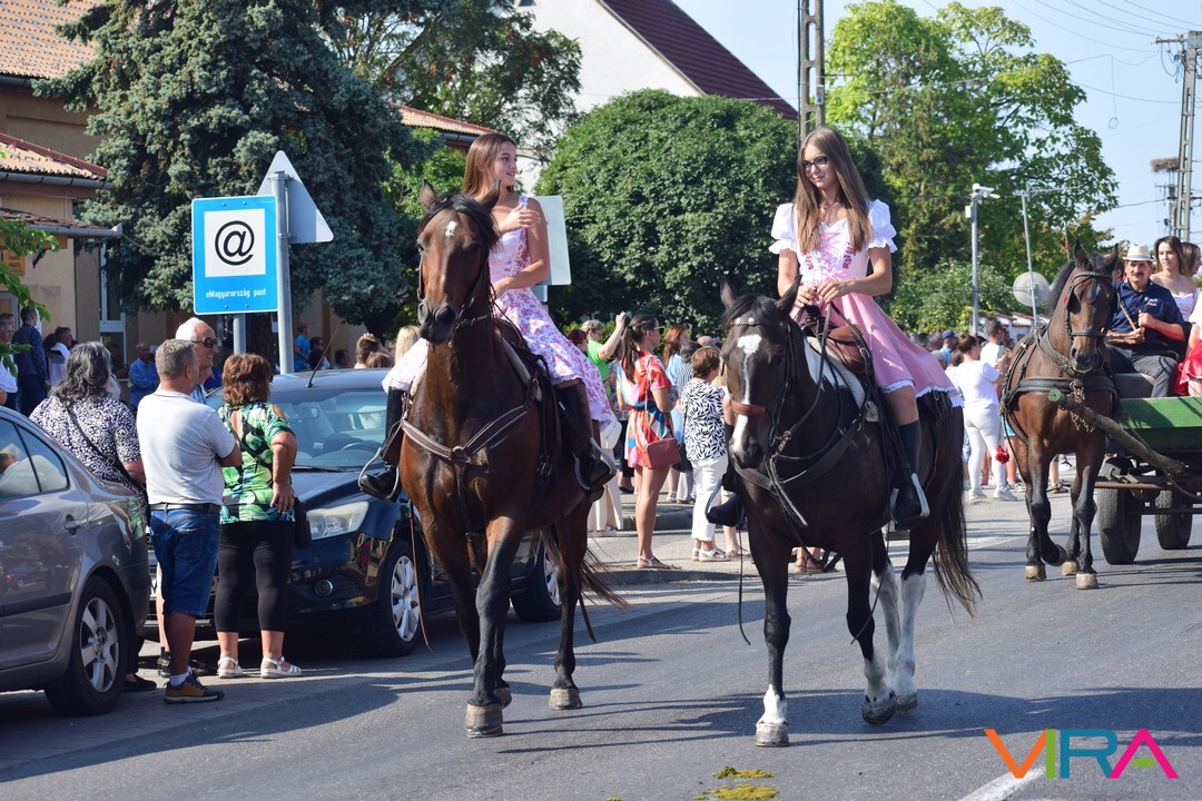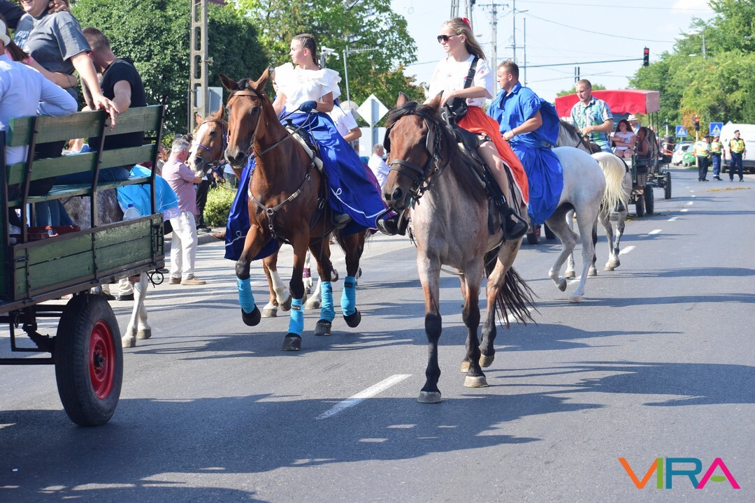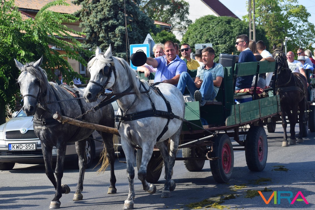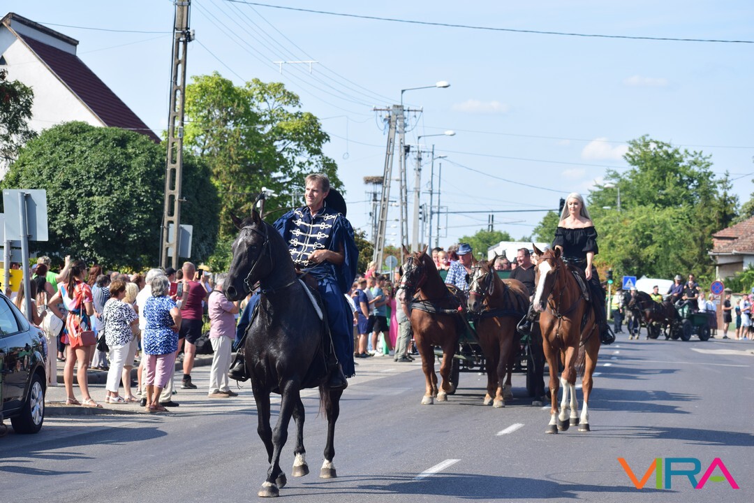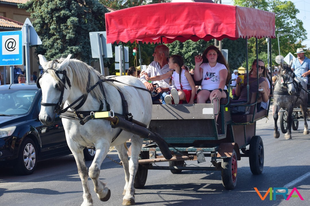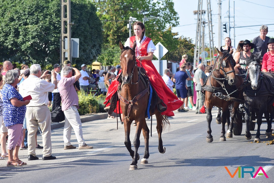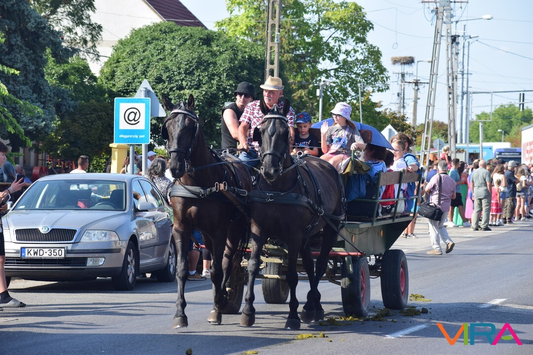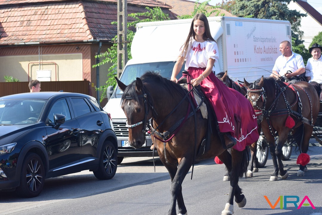 Ezt követően indult el Akasztó utcáin a közel ötven kocsit számláló szüreti menet, a csikósok, fogatosok, kocsisok és lóhátasok látványos felvonulásam melyre nem csak helyből, hanem a környező településekről is érkeztek. A gyülekező és a fogadás a Stadler Stadion mellett volt, ahol finom pörköltekkel és hideg italokkal várták a felvonulásra érkezőket. A szüreti felvonulást idén is az Akasztói Lovas Egyesület szervezte. A meneten a jó hangulathoz a talpalávalót Oroszi Sándor szolgáltatta.