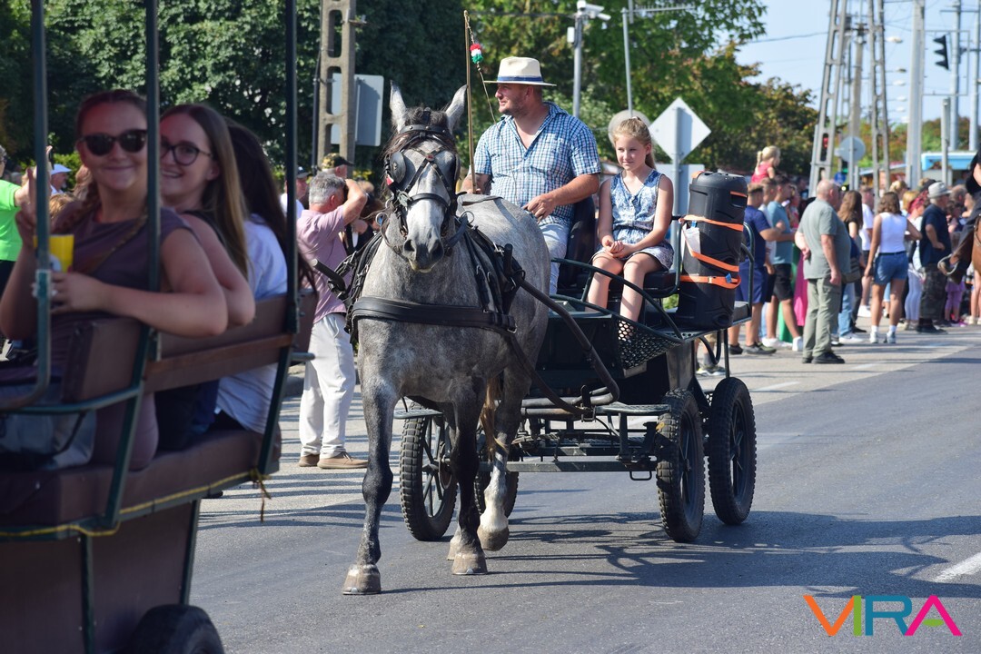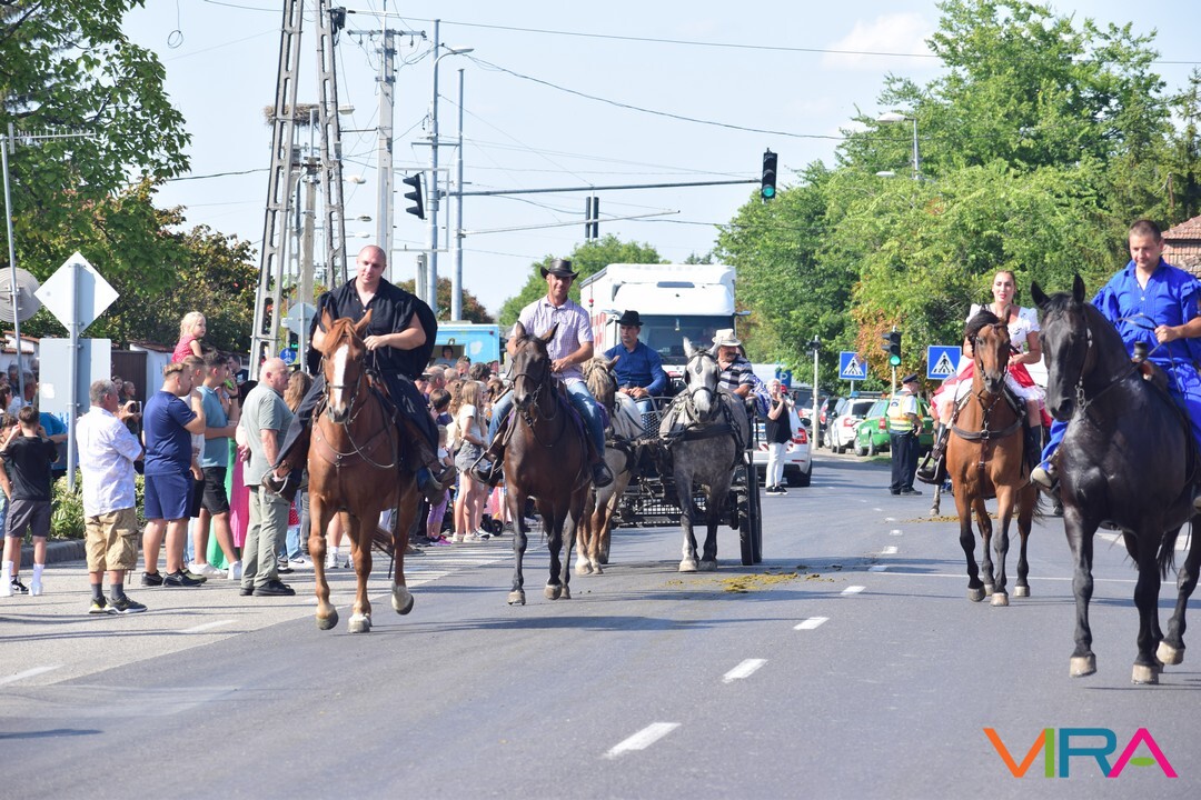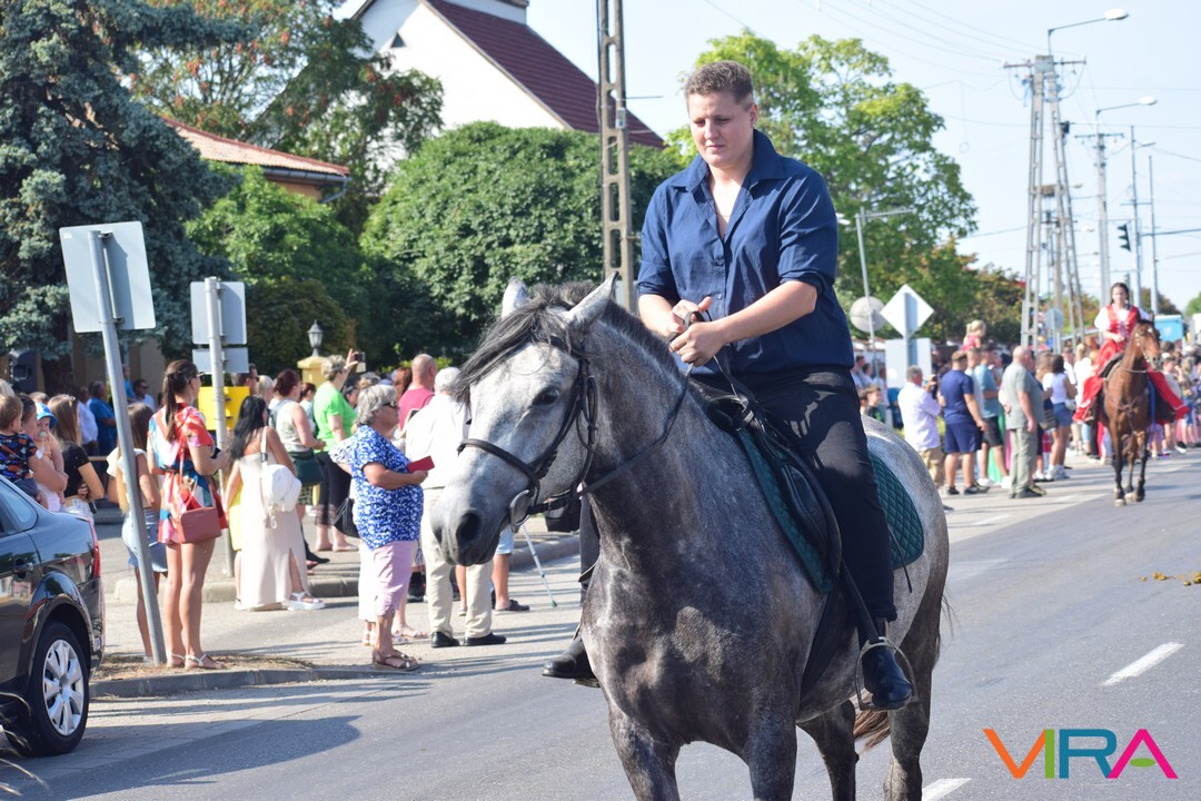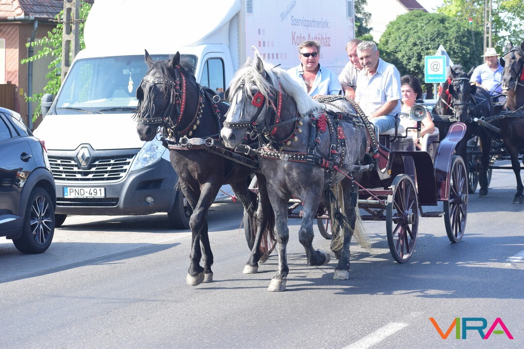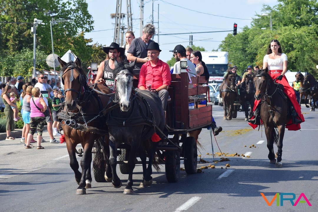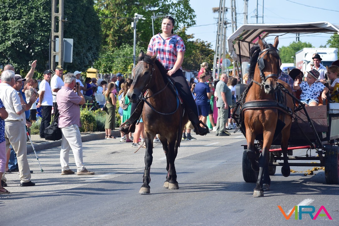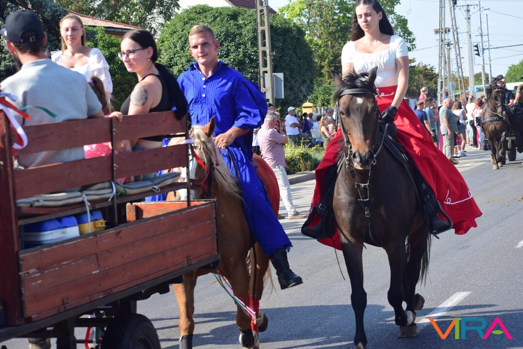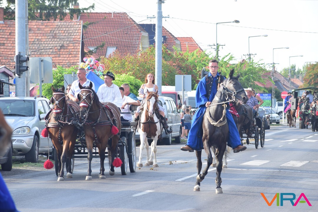 Ezt követően indult el Akasztó utcáin a közel ötven kocsit számláló szüreti menet, a csikósok, fogatosok, kocsisok és lóhátasok látványos felvonulásam melyre nem csak helyből, hanem a környező településekről is érkeztek. A gyülekező és a fogadás a Stadler Stadion mellett volt, ahol finom pörköltekkel és hideg italokkal várták a felvonulásra érkezőket. A szüreti felvonulást idén is az Akasztói Lovas Egyesület szervezte. A meneten a jó hangulathoz a talpalávalót Oroszi Sándor szolgáltatta.