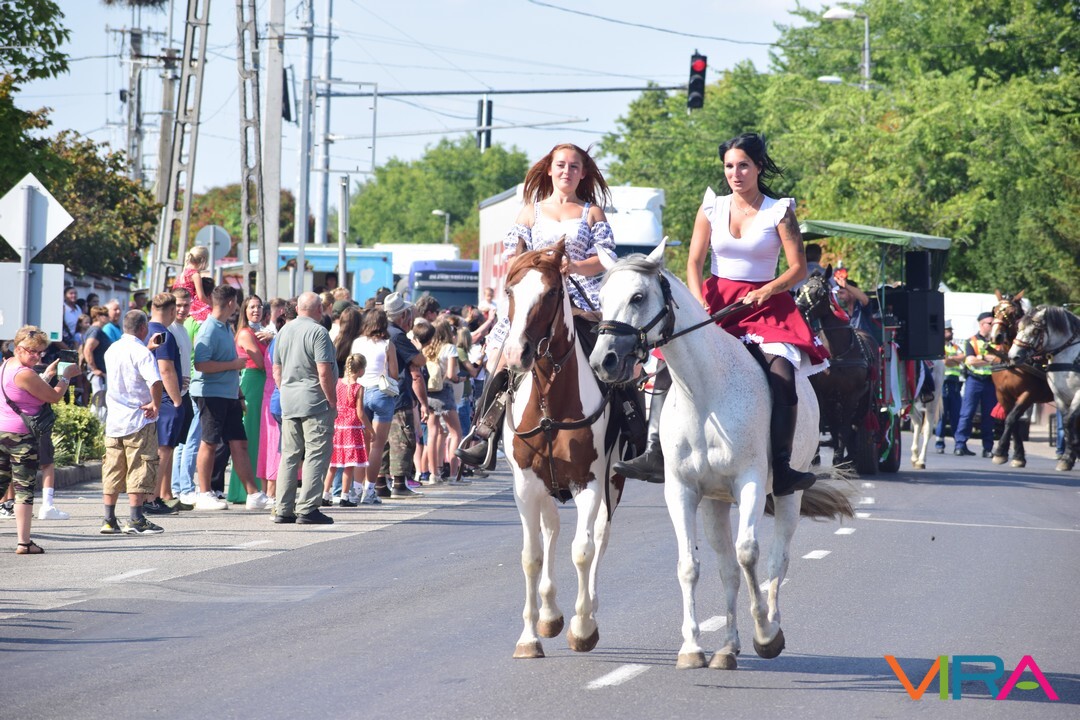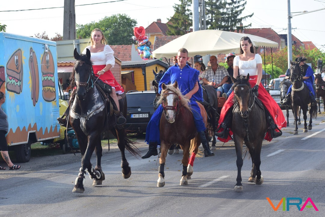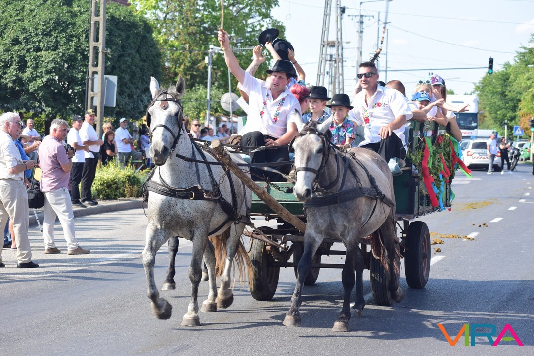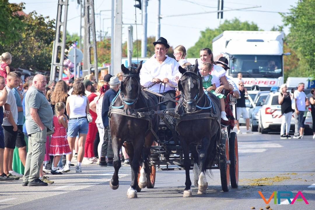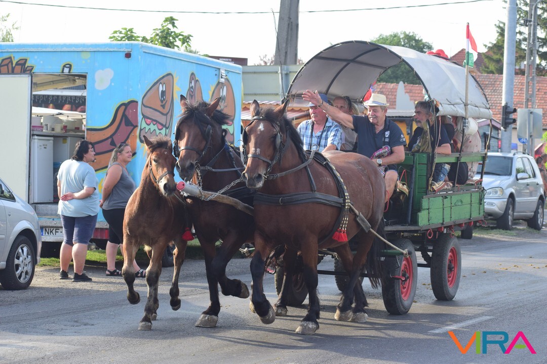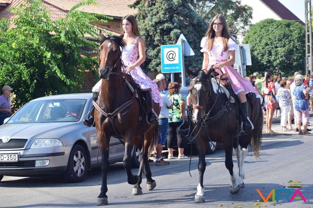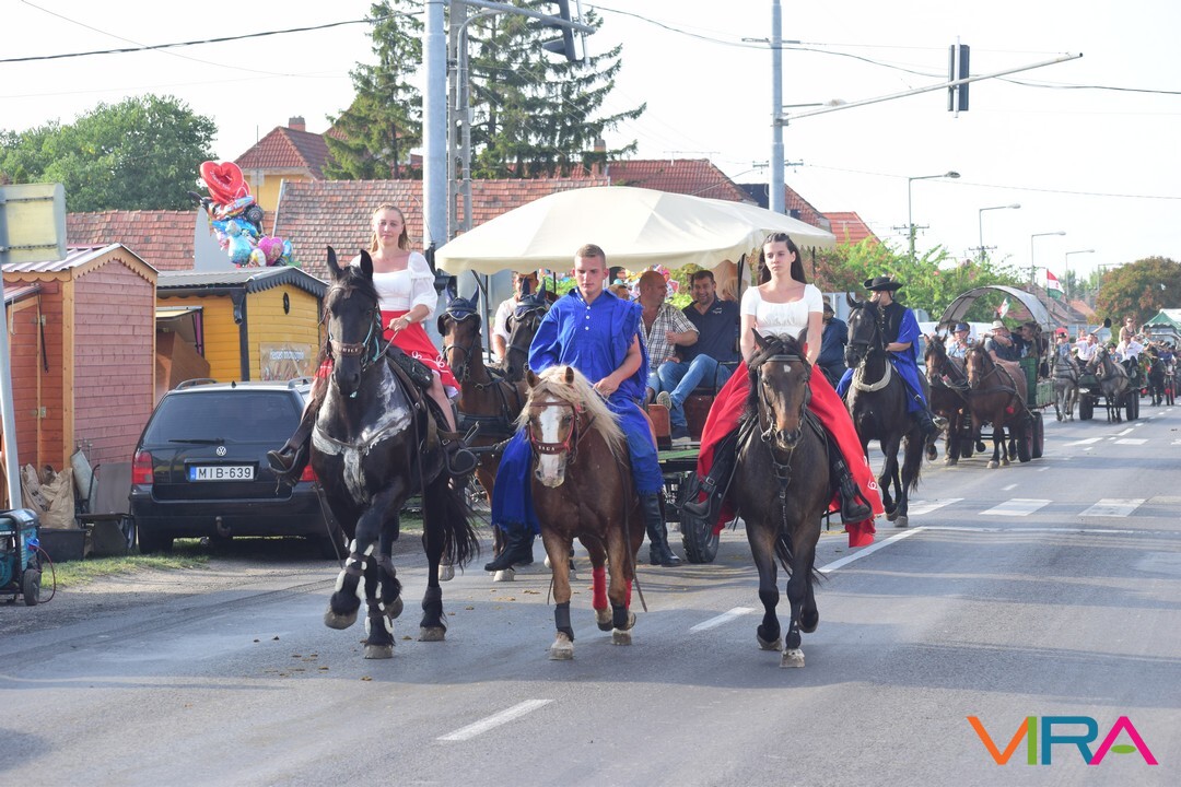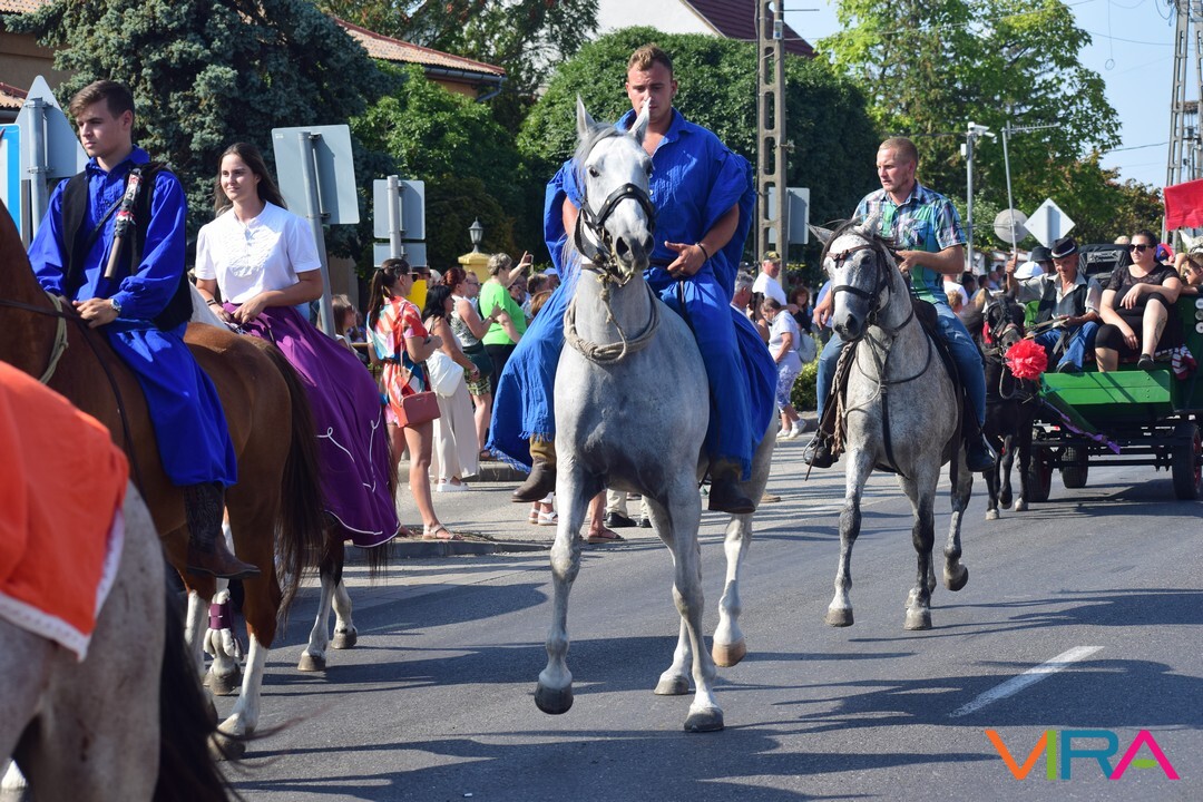 Ezt követően indult el Akasztó utcáin a közel ötven kocsit számláló szüreti menet, a csikósok, fogatosok, kocsisok és lóhátasok látványos felvonulásam melyre nem csak helyből, hanem a környező településekről is érkeztek. A gyülekező és a fogadás a Stadler Stadion mellett volt, ahol finom pörköltekkel és hideg italokkal várták a felvonulásra érkezőket. A szüreti felvonulást idén is az Akasztói Lovas Egyesület szervezte. A meneten a jó hangulathoz a talpalávalót Oroszi Sándor szolgáltatta.