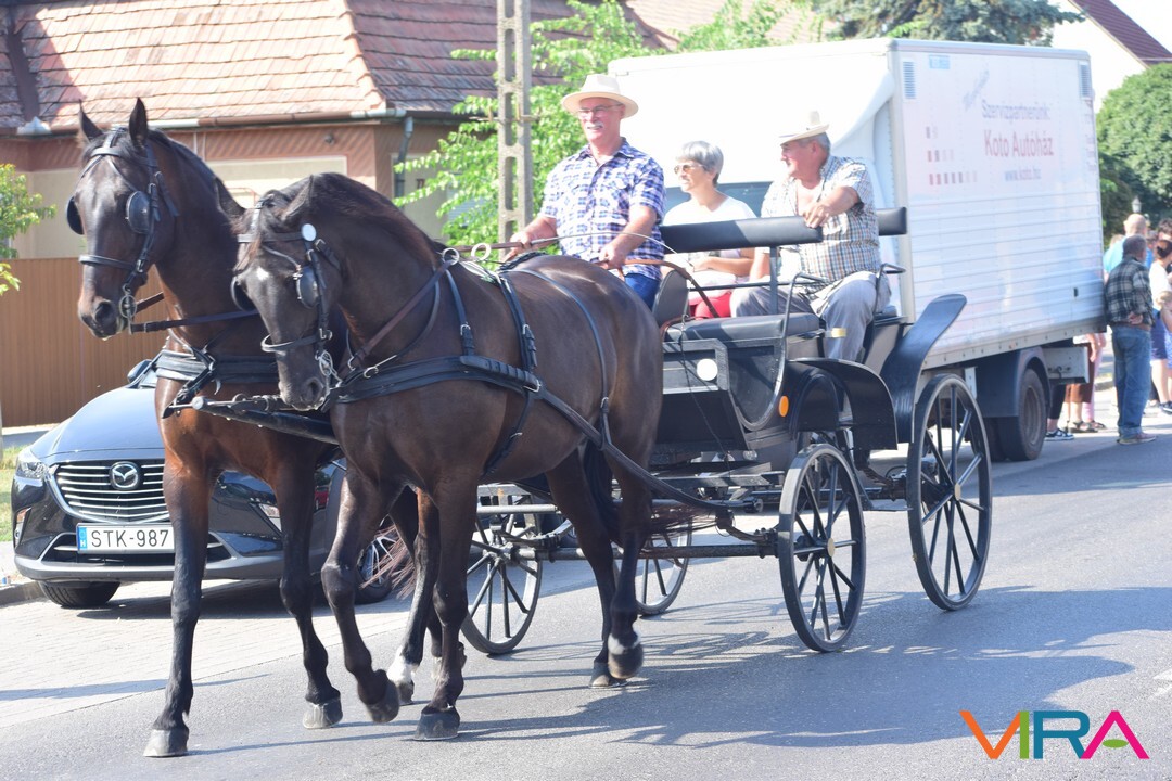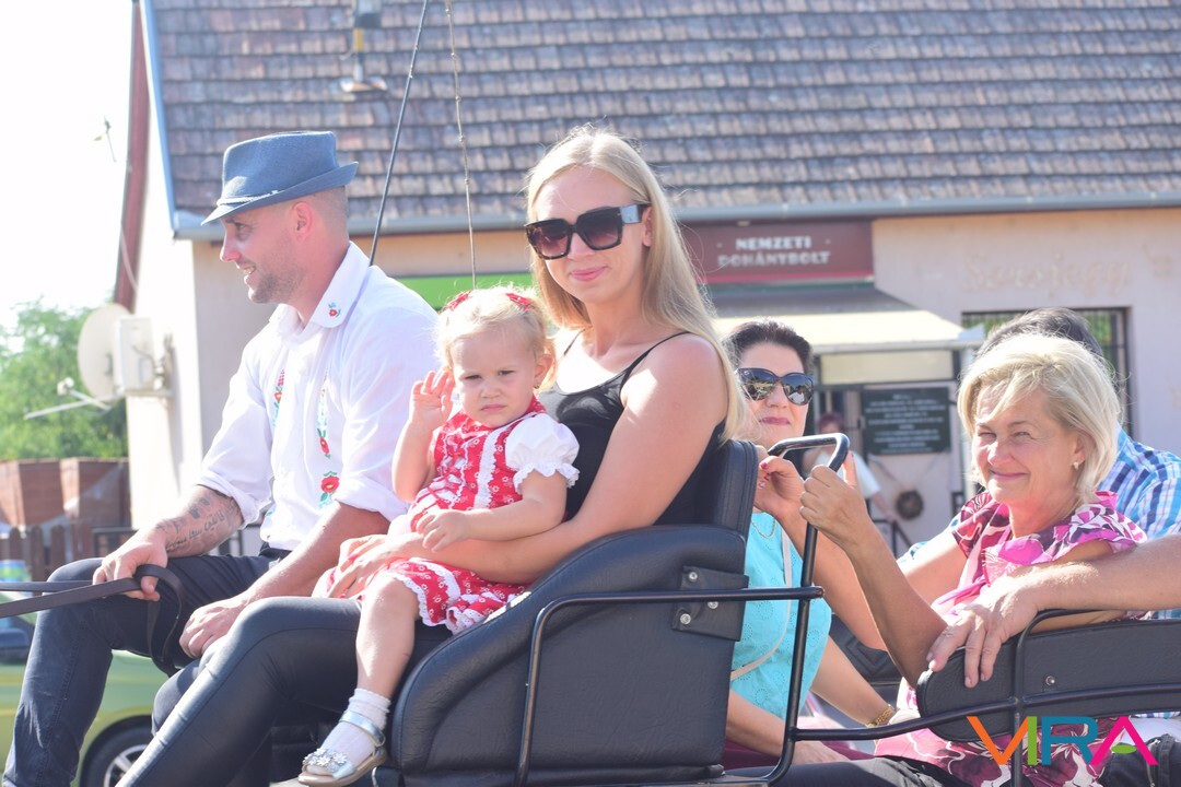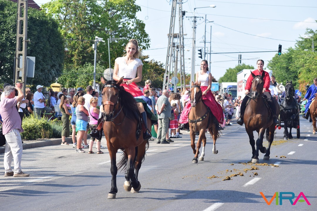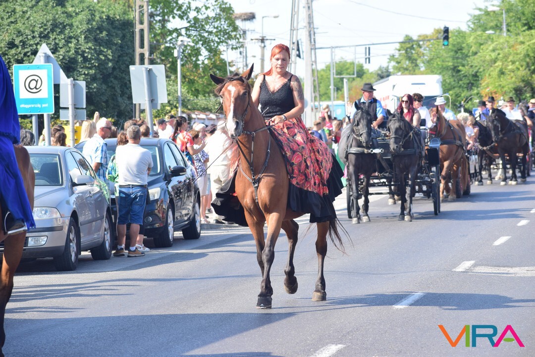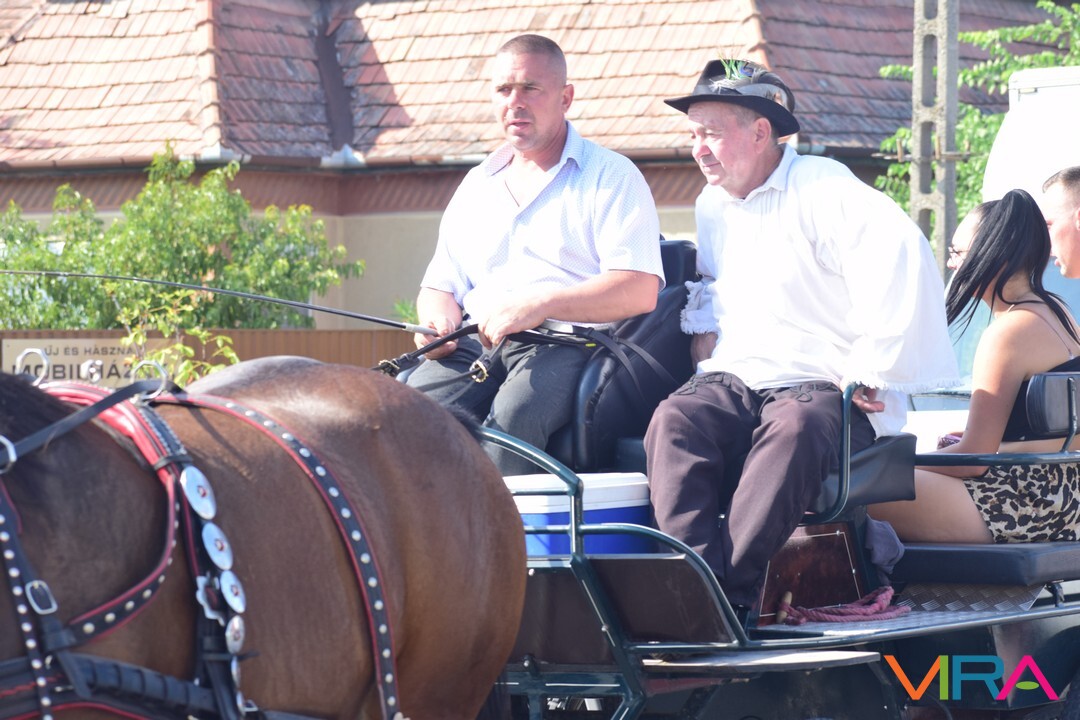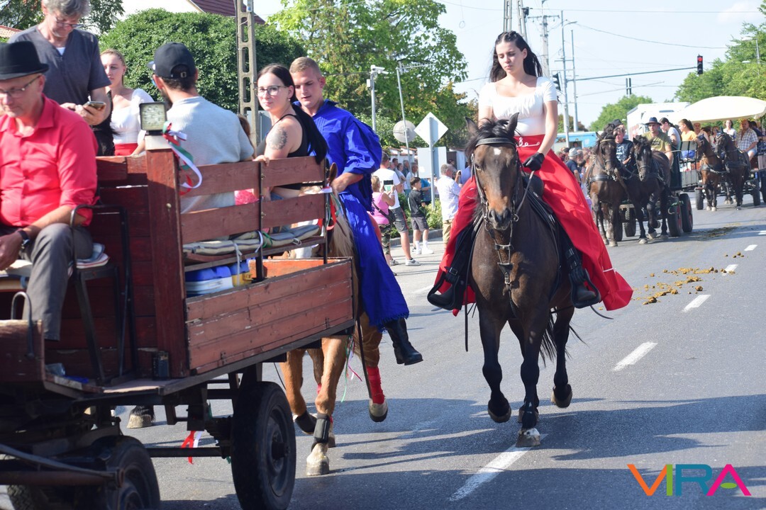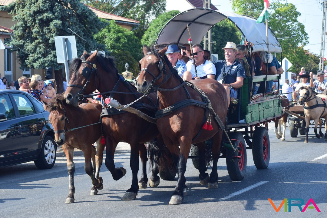 Ezt követően indult el Akasztó utcáin a közel ötven kocsit számláló szüreti menet, a csikósok, fogatosok, kocsisok és lóhátasok látványos felvonulásam melyre nem csak helyből, hanem a környező településekről is érkeztek. A gyülekező és a fogadás a Stadler Stadion mellett volt, ahol finom pörköltekkel és hideg italokkal várták a felvonulásra érkezőket. A szüreti felvonulást idén is az Akasztói Lovas Egyesület szervezte. A meneten a jó hangulathoz a talpalávalót Oroszi Sándor szolgáltatta.