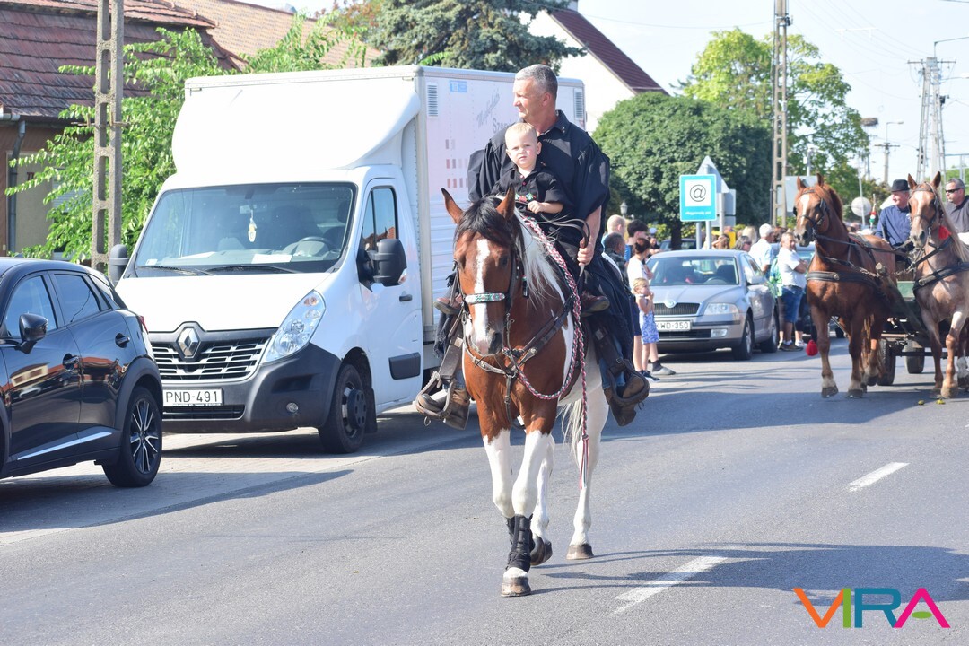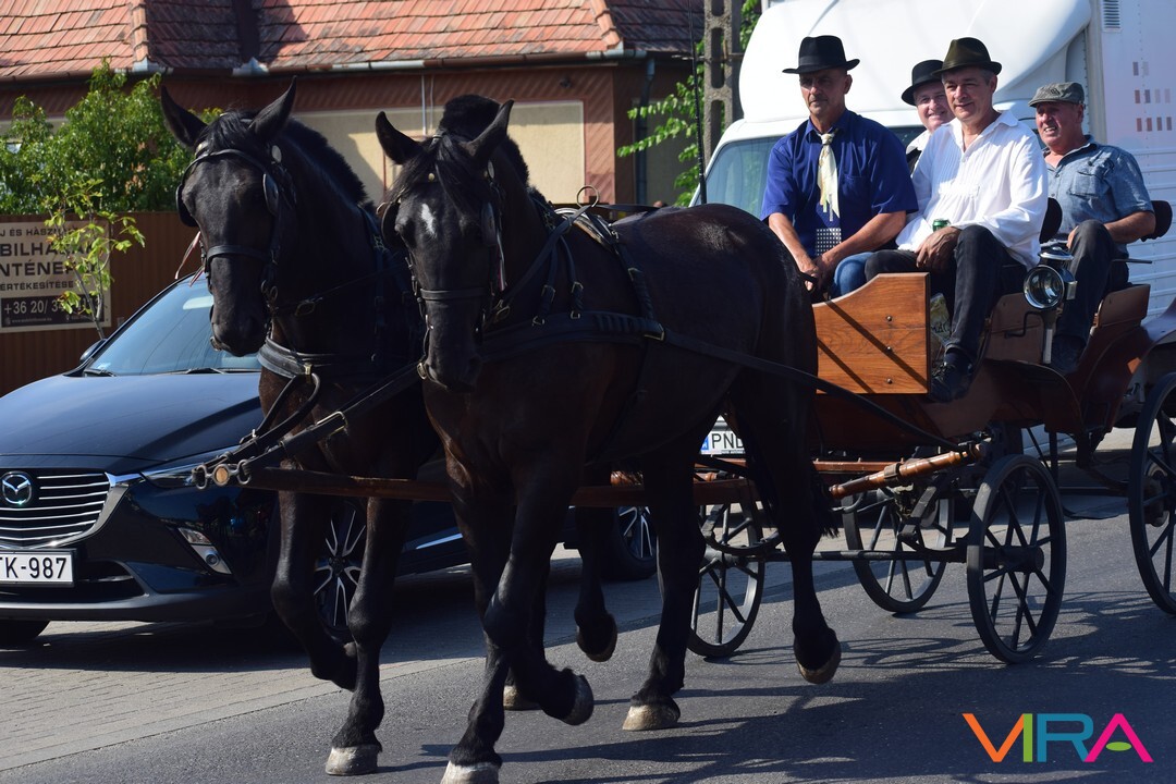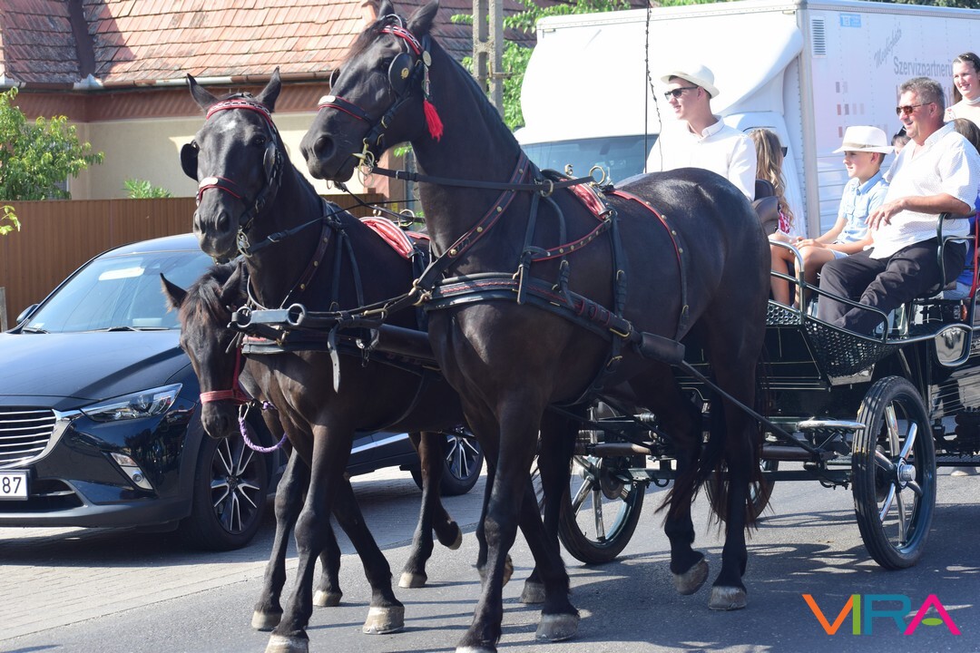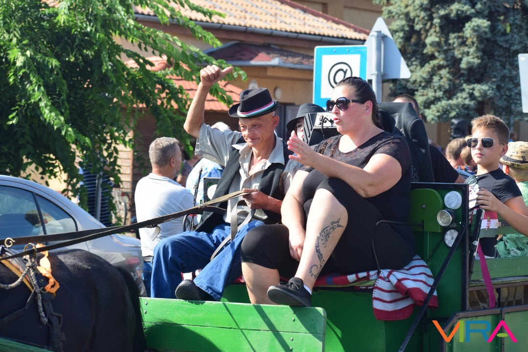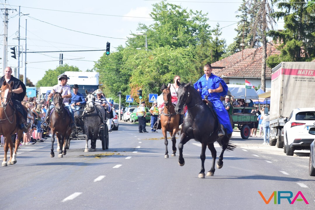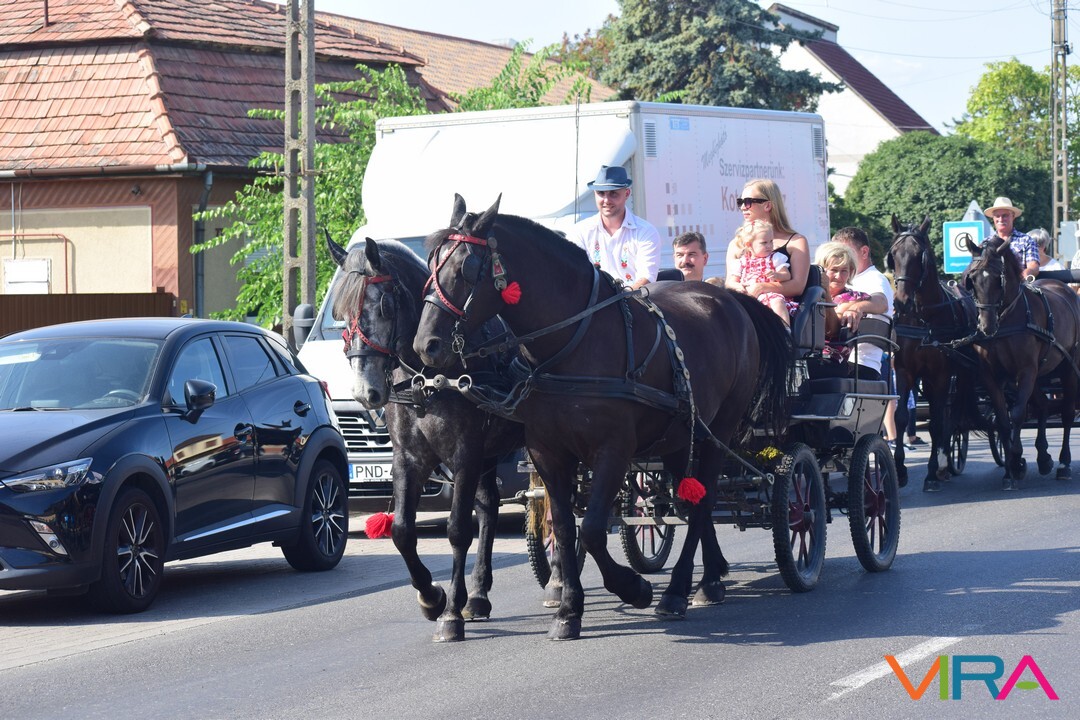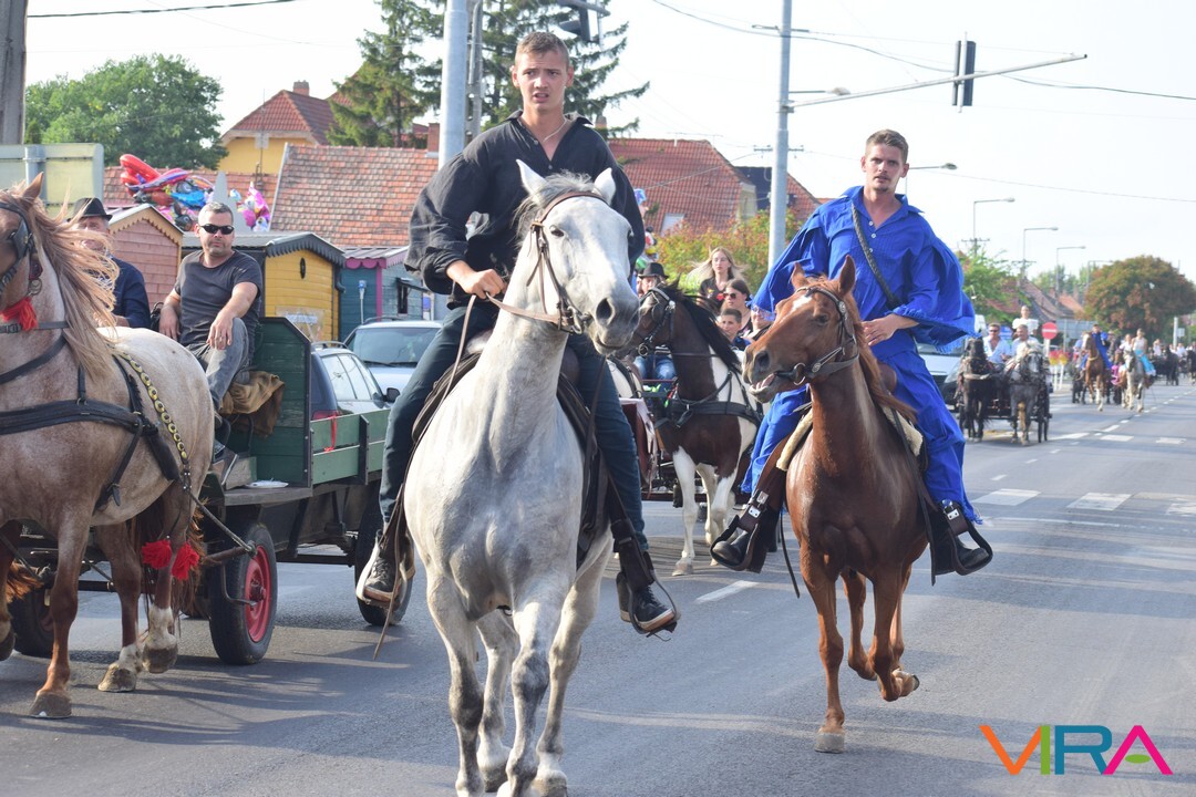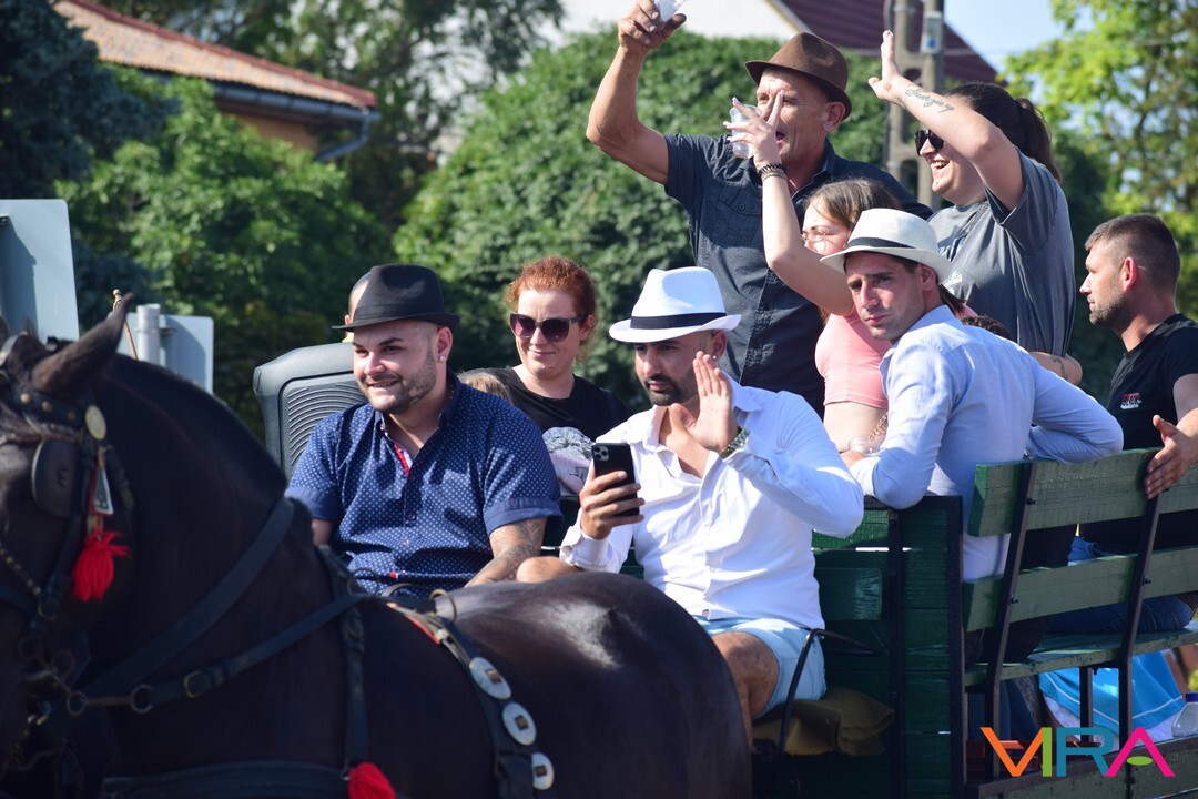 Ezt követően indult el Akasztó utcáin a közel ötven kocsit számláló szüreti menet, a csikósok, fogatosok, kocsisok és lóhátasok látványos felvonulásam melyre nem csak helyből, hanem a környező településekről is érkeztek. A gyülekező és a fogadás a Stadler Stadion mellett volt, ahol finom pörköltekkel és hideg italokkal várták a felvonulásra érkezőket. A szüreti felvonulást idén is az Akasztói Lovas Egyesület szervezte. A meneten a jó hangulathoz a talpalávalót Oroszi Sándor szolgáltatta.