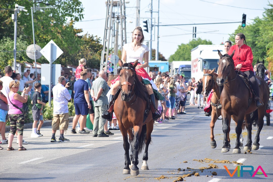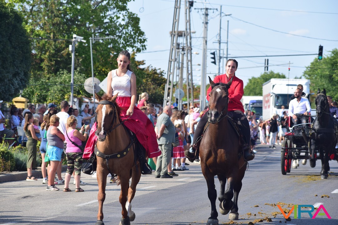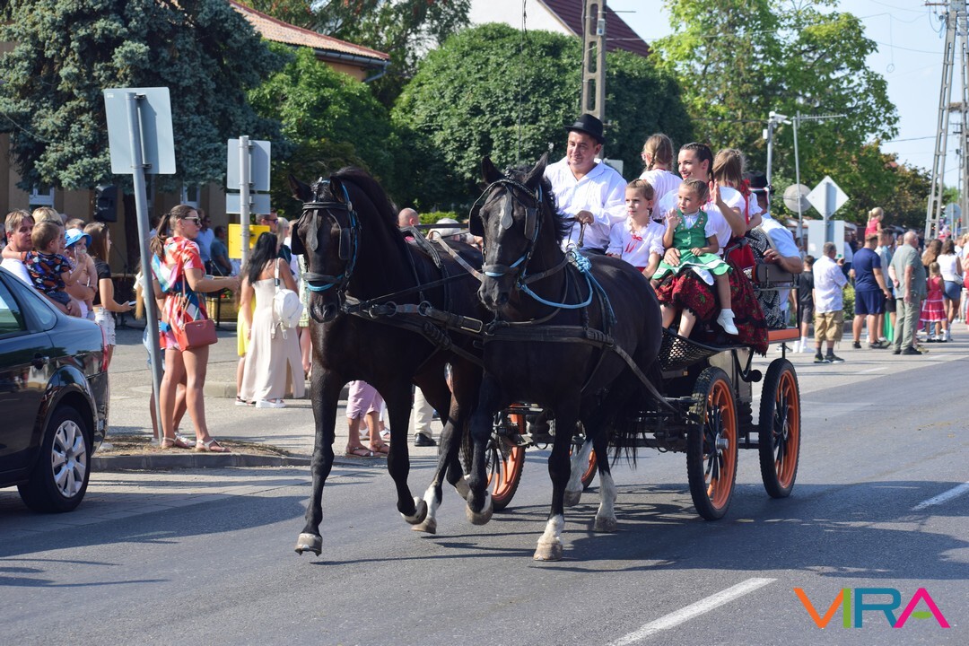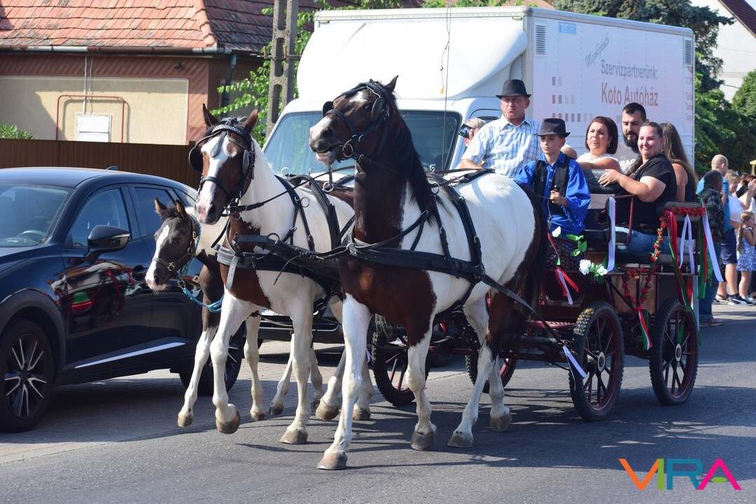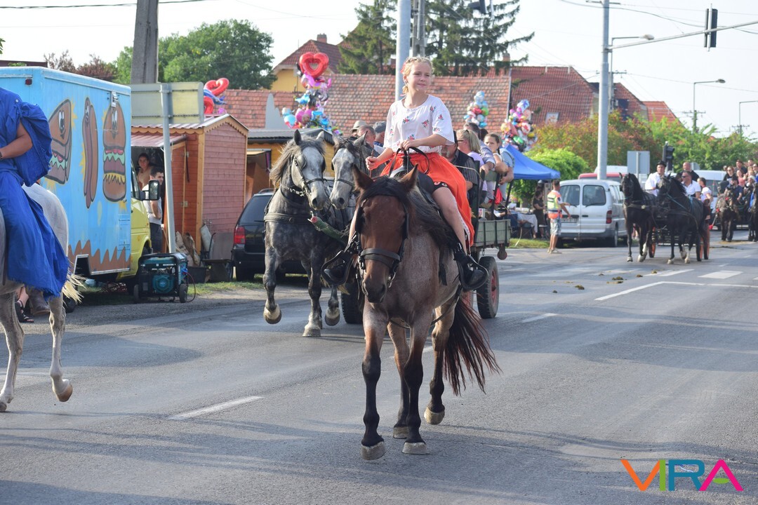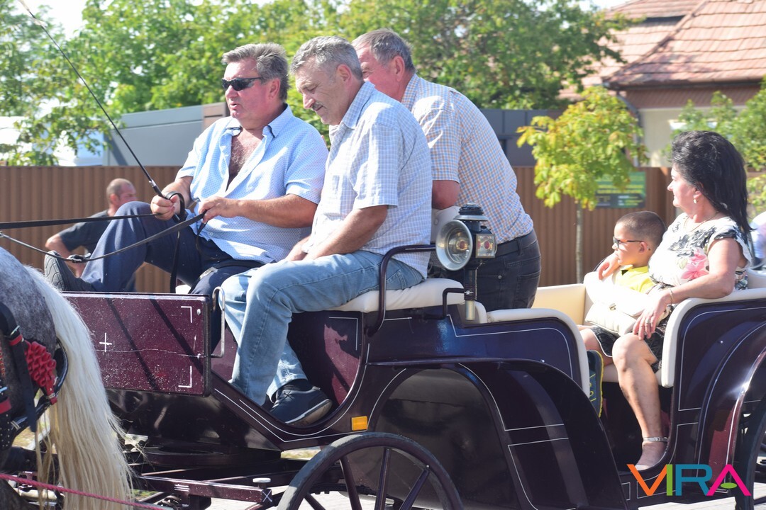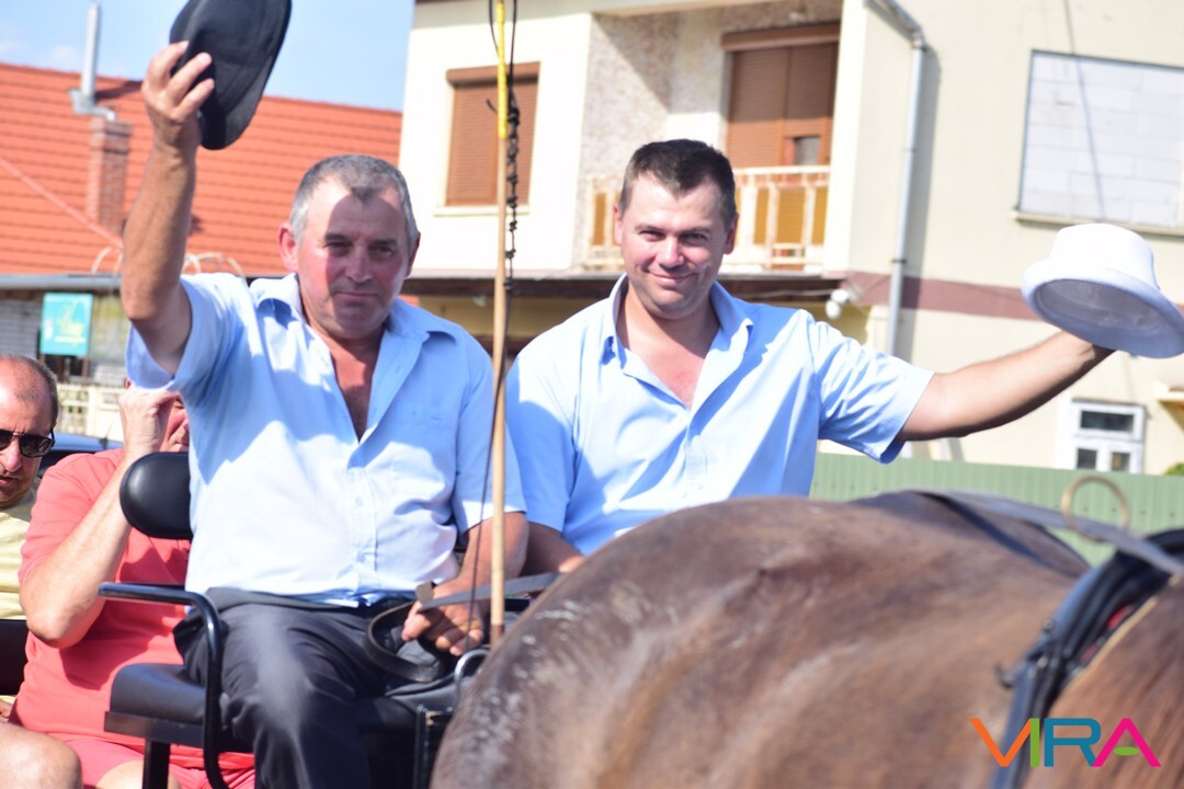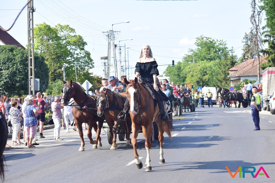 Ezt követően indult el Akasztó utcáin a közel ötven kocsit számláló szüreti menet, a csikósok, fogatosok, kocsisok és lóhátasok látványos felvonulásam melyre nem csak helyből, hanem a környező településekről is érkeztek. A gyülekező és a fogadás a Stadler Stadion mellett volt, ahol finom pörköltekkel és hideg italokkal várták a felvonulásra érkezőket. A szüreti felvonulást idén is az Akasztói Lovas Egyesület szervezte. A meneten a jó hangulathoz a talpalávalót Oroszi Sándor szolgáltatta.