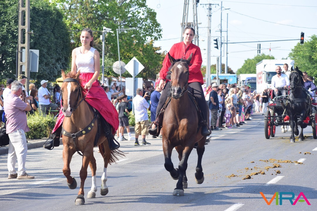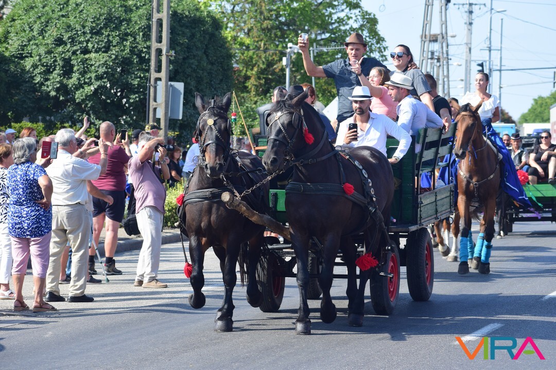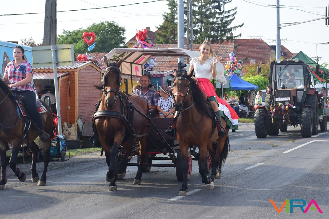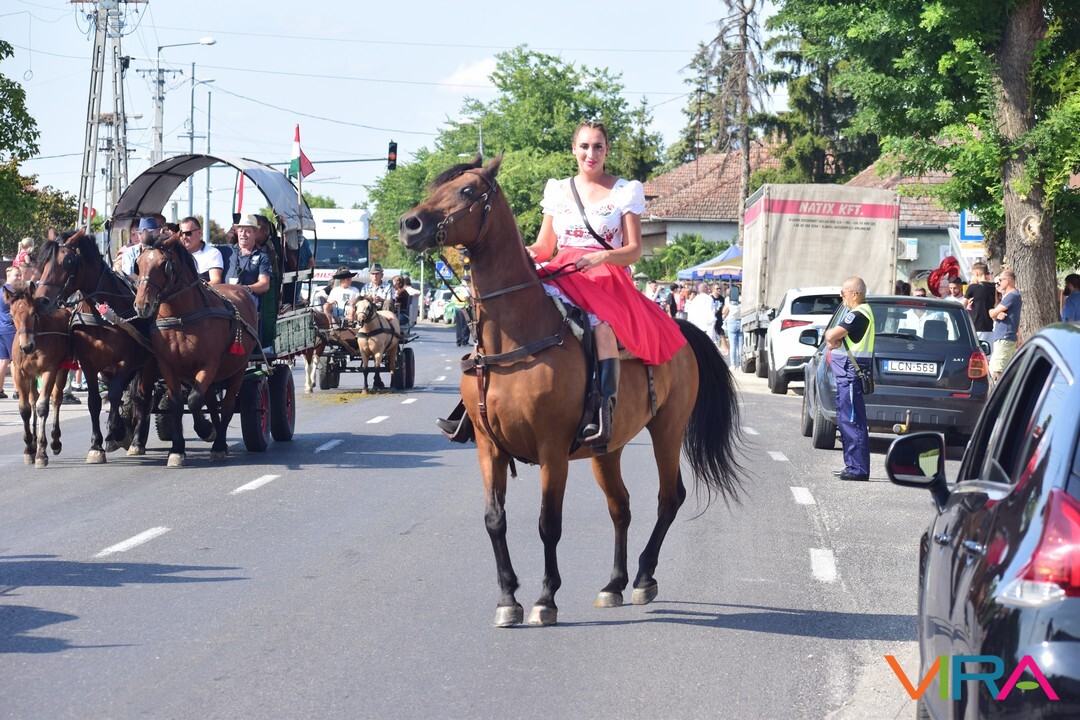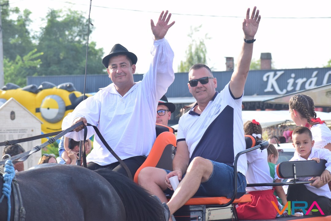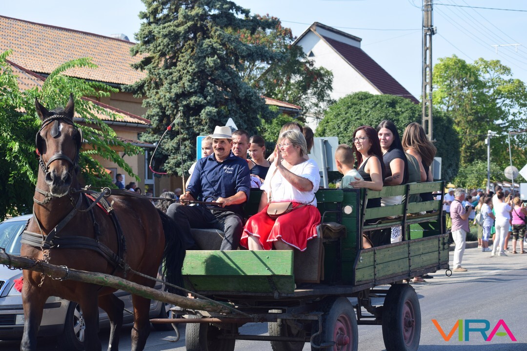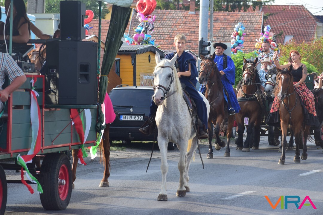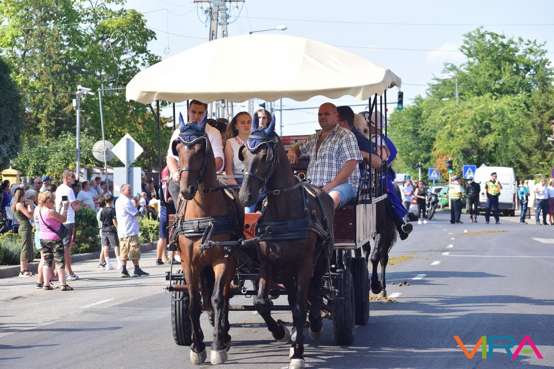 Ezt követően indult el Akasztó utcáin a közel ötven kocsit számláló szüreti menet, a csikósok, fogatosok, kocsisok és lóhátasok látványos felvonulásam melyre nem csak helyből, hanem a környező településekről is érkeztek. A gyülekező és a fogadás a Stadler Stadion mellett volt, ahol finom pörköltekkel és hideg italokkal várták a felvonulásra érkezőket. A szüreti felvonulást idén is az Akasztói Lovas Egyesület szervezte. A meneten a jó hangulathoz a talpalávalót Oroszi Sándor szolgáltatta.