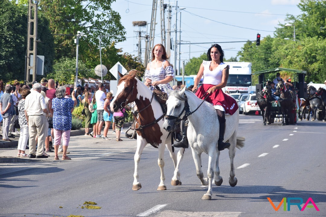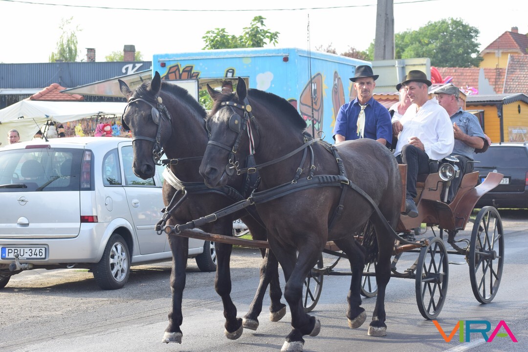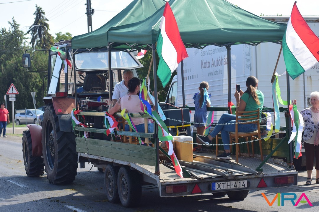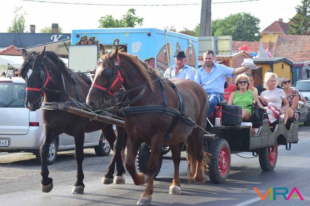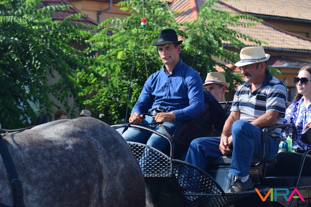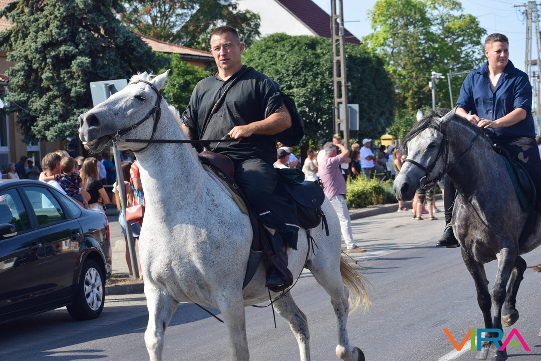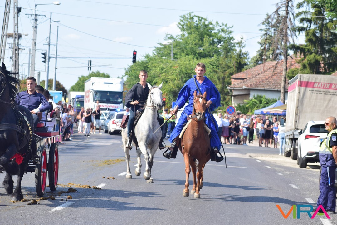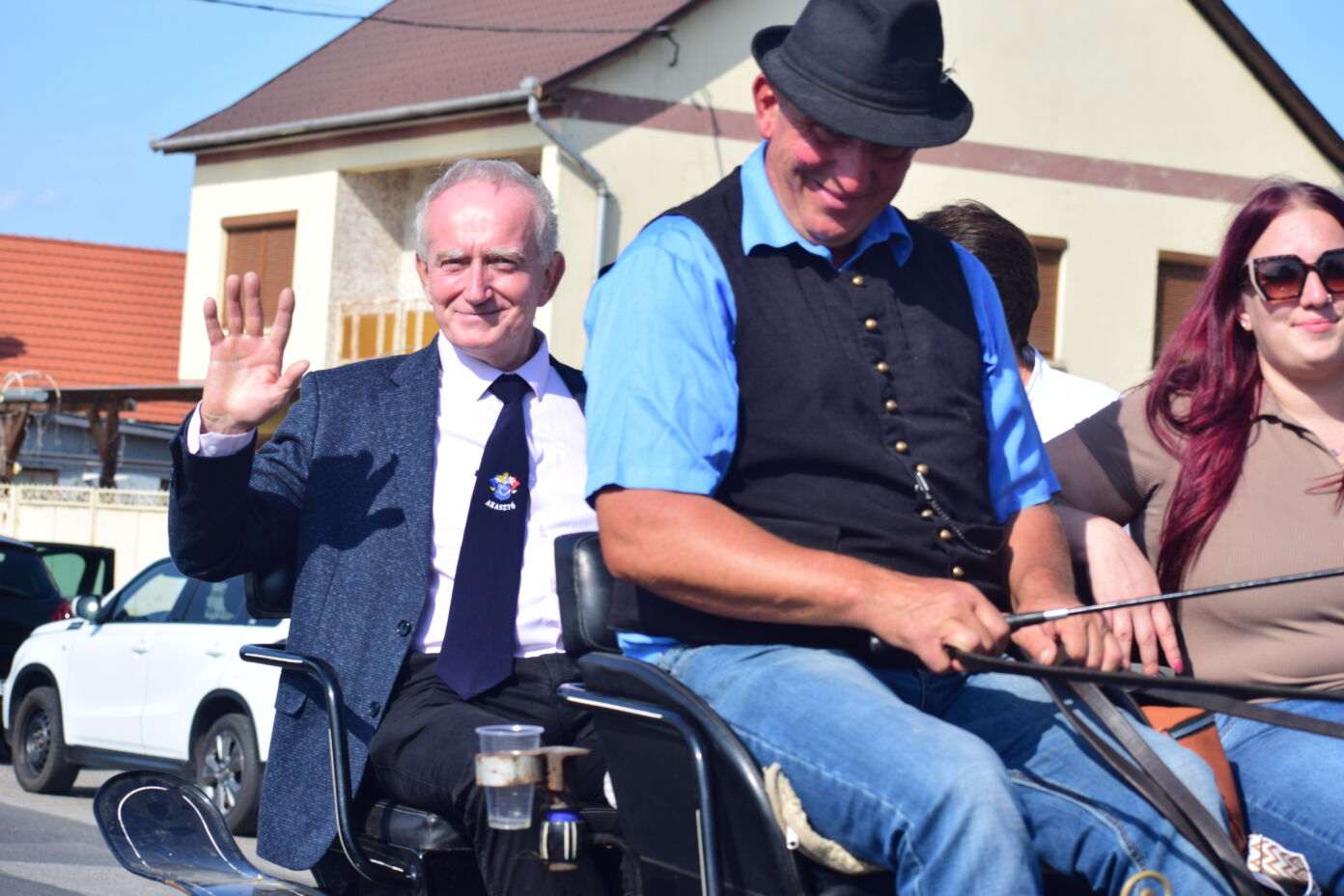 Ezt követően indult el Akasztó utcáin a közel ötven kocsit számláló szüreti menet, a csikósok, fogatosok, kocsisok és lóhátasok látványos felvonulásam melyre nem csak helyből, hanem a környező településekről is érkeztek. A gyülekező és a fogadás a Stadler Stadion mellett volt, ahol finom pörköltekkel és hideg italokkal várták a felvonulásra érkezőket. A szüreti felvonulást idén is az Akasztói Lovas Egyesület szervezte. A meneten a jó hangulathoz a talpalávalót Oroszi Sándor szolgáltatta.