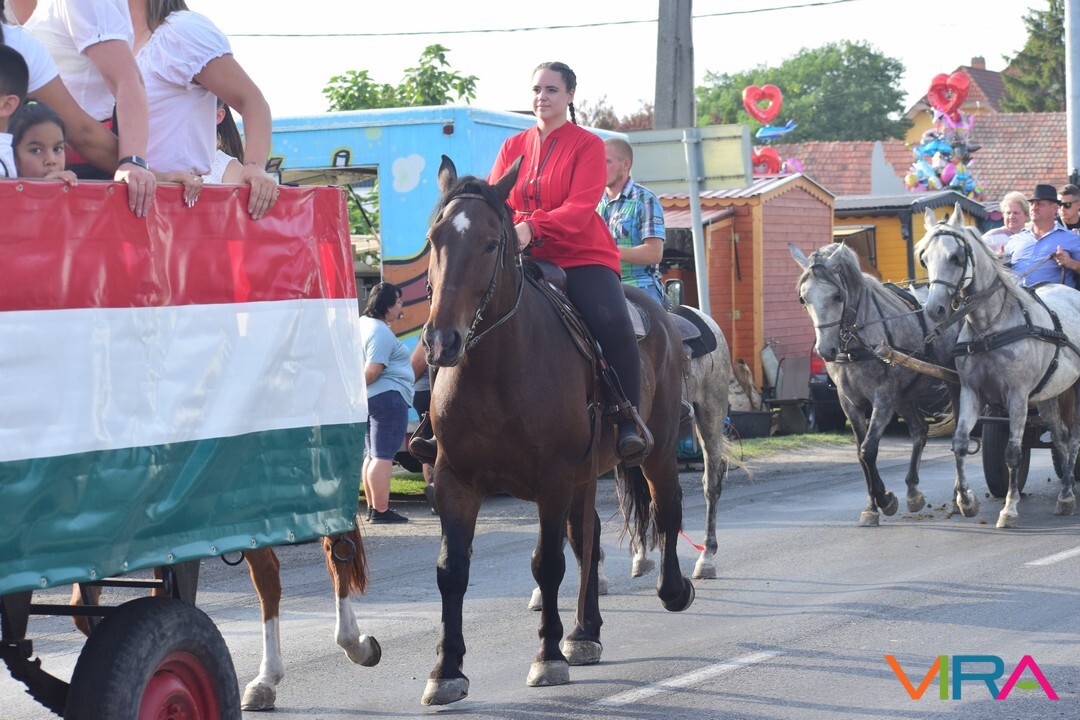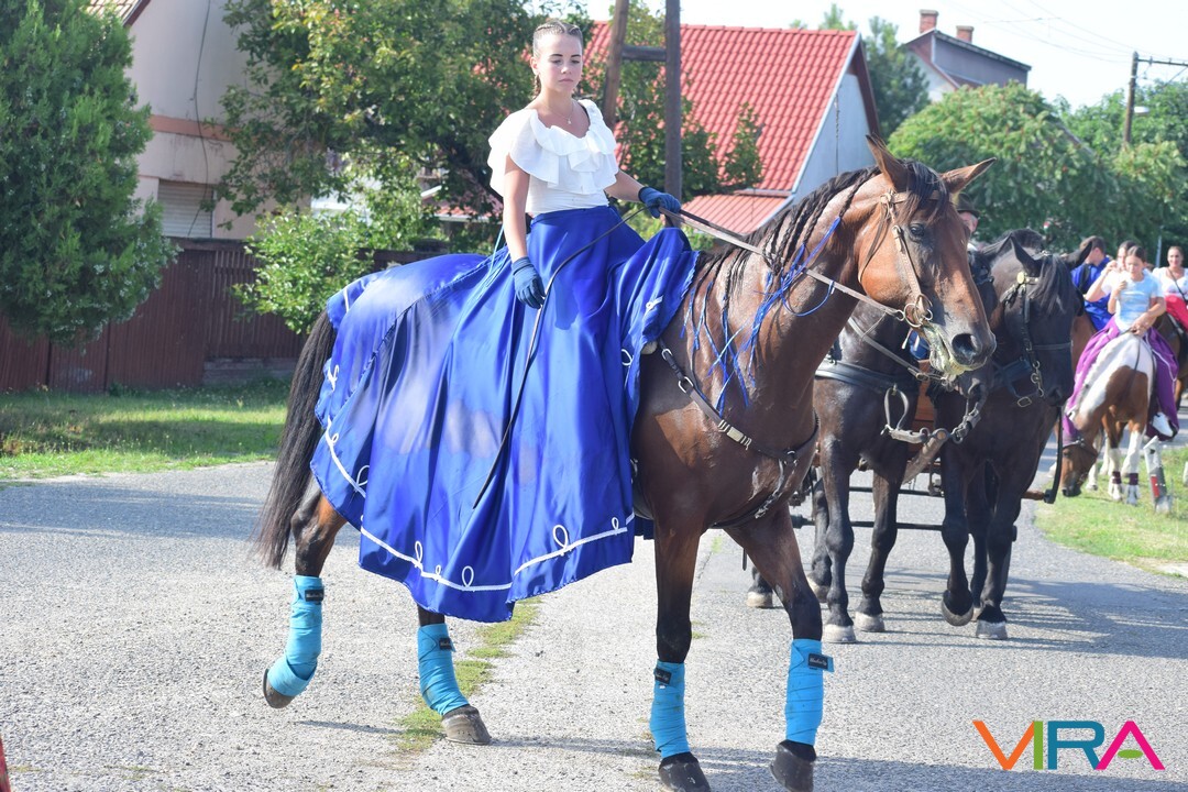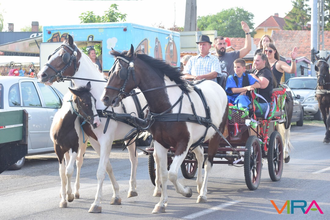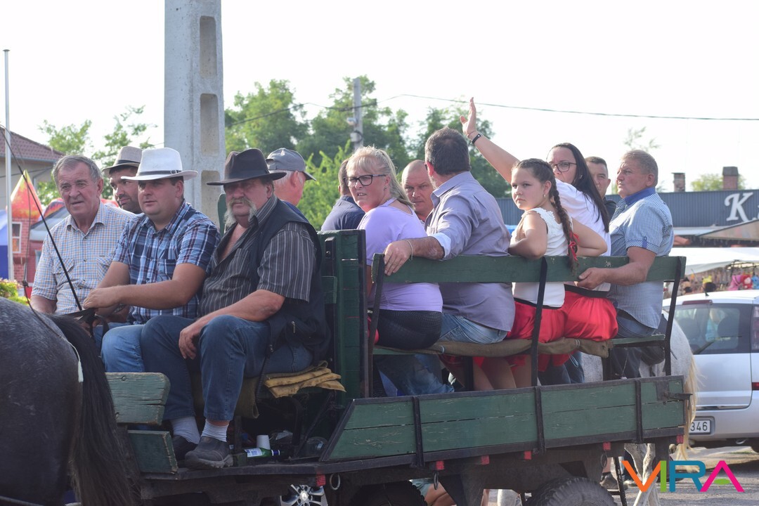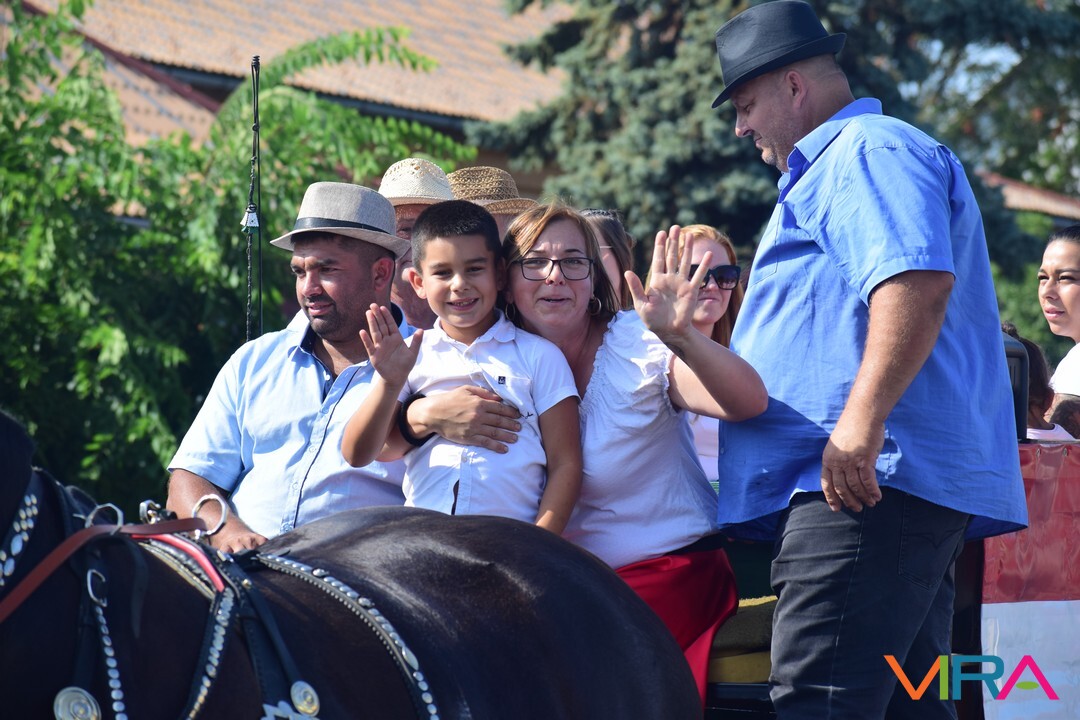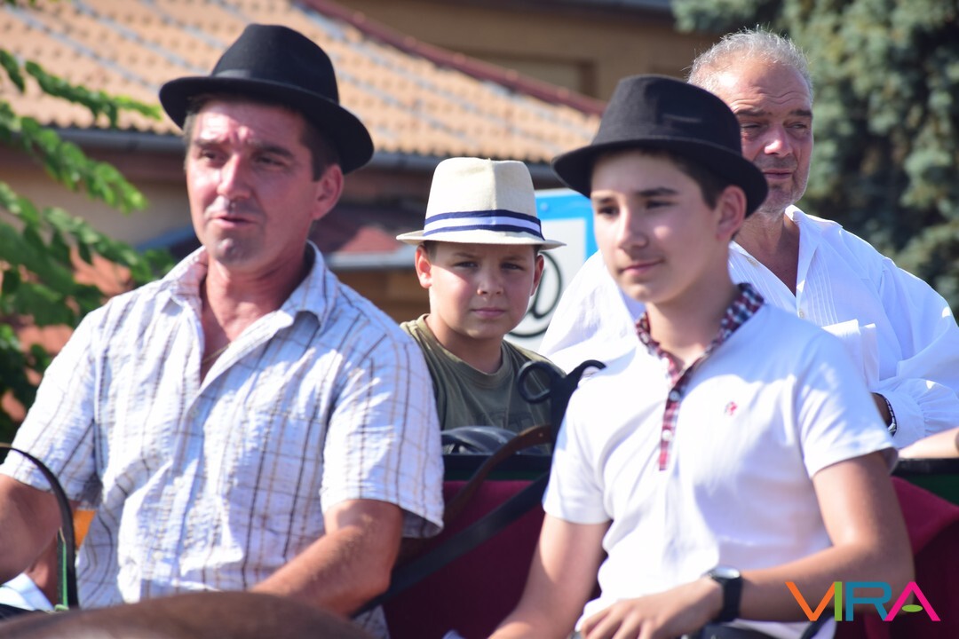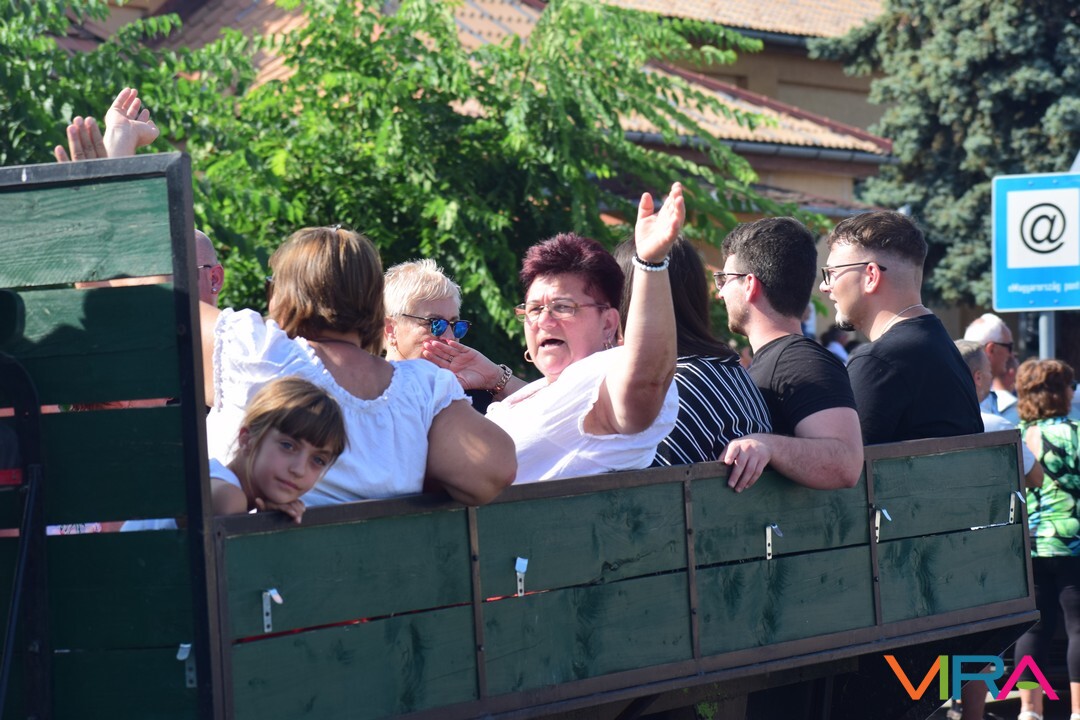 Ezt követően indult el Akasztó utcáin a közel ötven kocsit számláló szüreti menet, a csikósok, fogatosok, kocsisok és lóhátasok látványos felvonulásam melyre nem csak helyből, hanem a környező településekről is érkeztek. A gyülekező és a fogadás a Stadler Stadion mellett volt, ahol finom pörköltekkel és hideg italokkal várták a felvonulásra érkezőket. A szüreti felvonulást idén is az Akasztói Lovas Egyesület szervezte. A meneten a jó hangulathoz a talpalávalót Oroszi Sándor szolgáltatta.