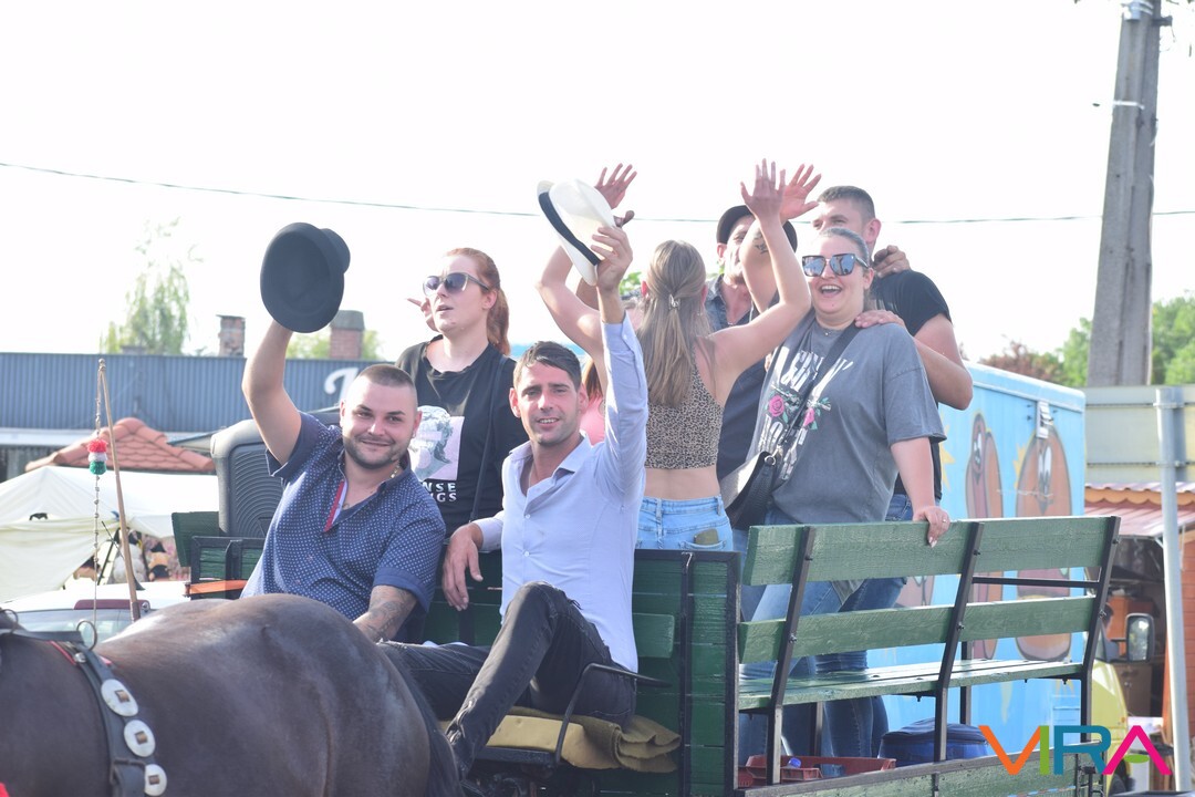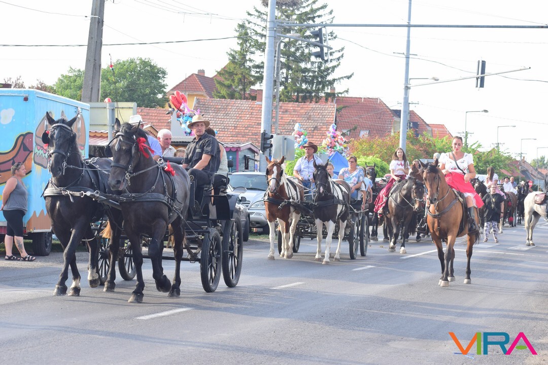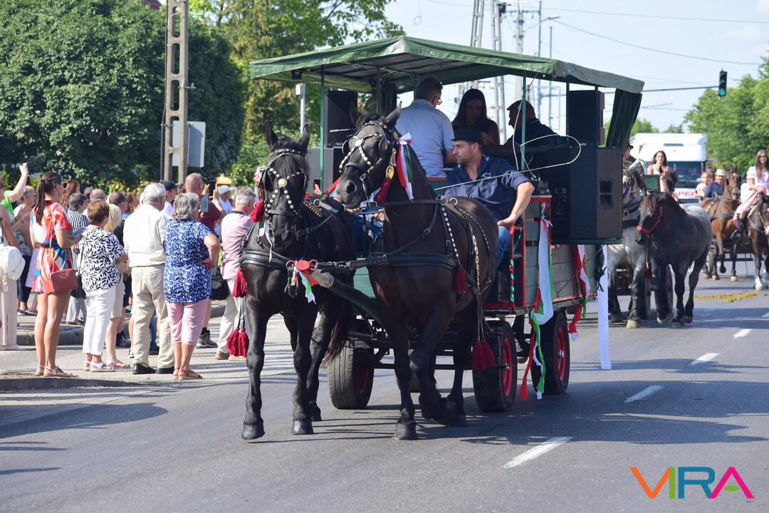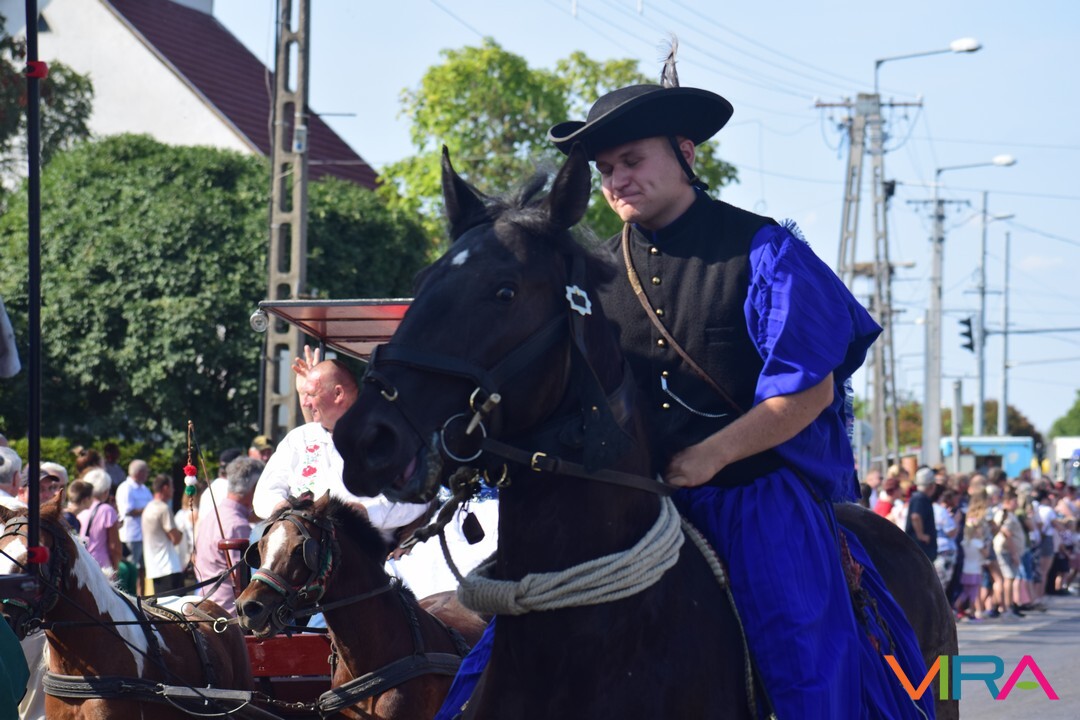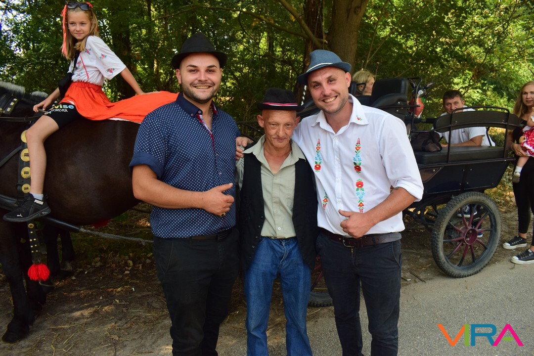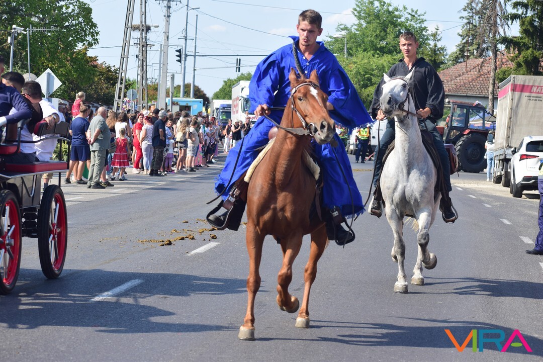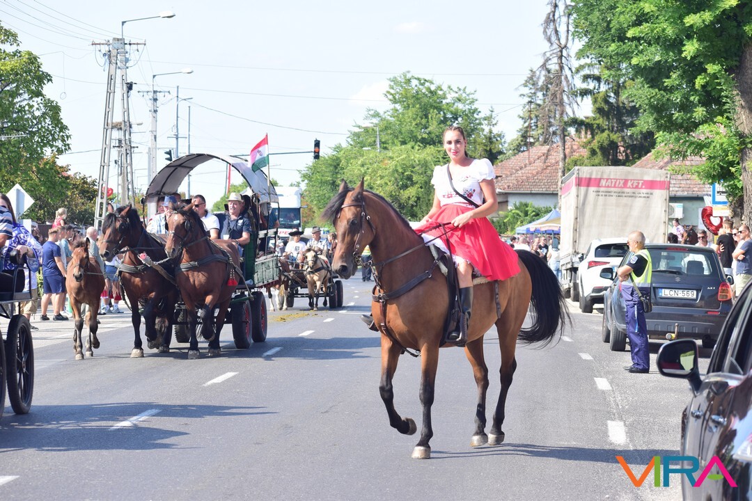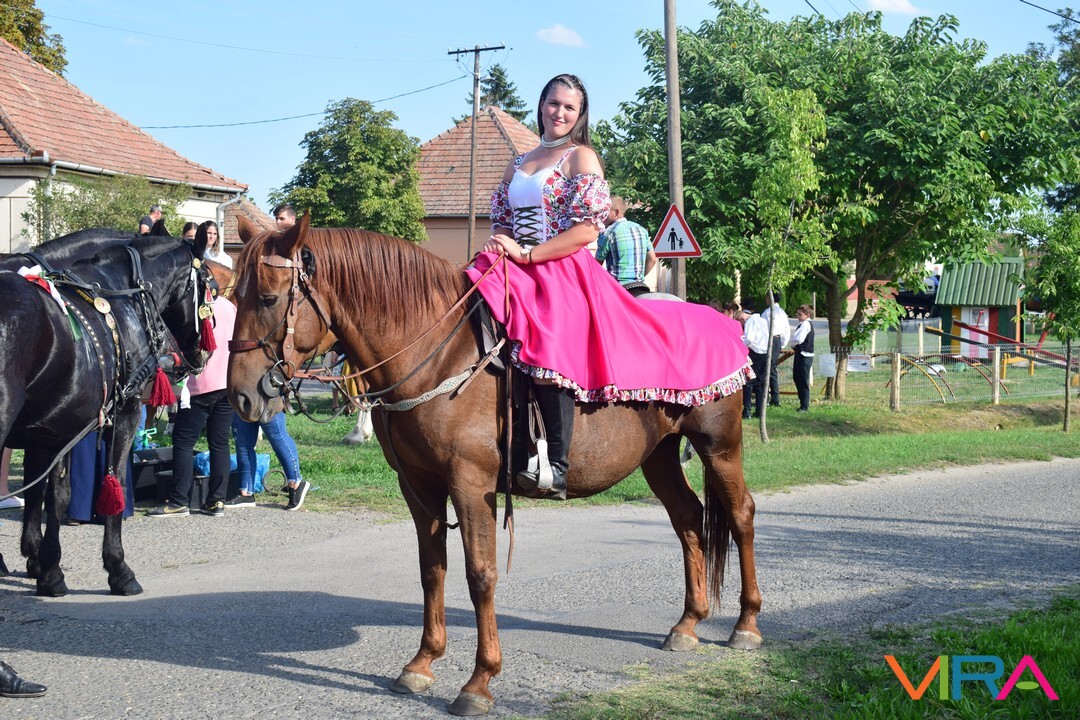 Ezt követően indult el Akasztó utcáin a közel ötven kocsit számláló szüreti menet, a csikósok, fogatosok, kocsisok és lóhátasok látványos felvonulásam melyre nem csak helyből, hanem a környező településekről is érkeztek. A gyülekező és a fogadás a Stadler Stadion mellett volt, ahol finom pörköltekkel és hideg italokkal várták a felvonulásra érkezőket. A szüreti felvonulást idén is az Akasztói Lovas Egyesület szervezte. A meneten a jó hangulathoz a talpalávalót Oroszi Sándor szolgáltatta.